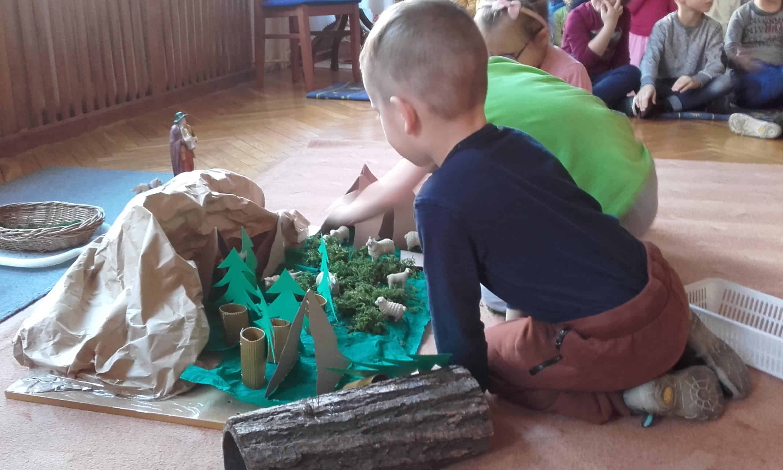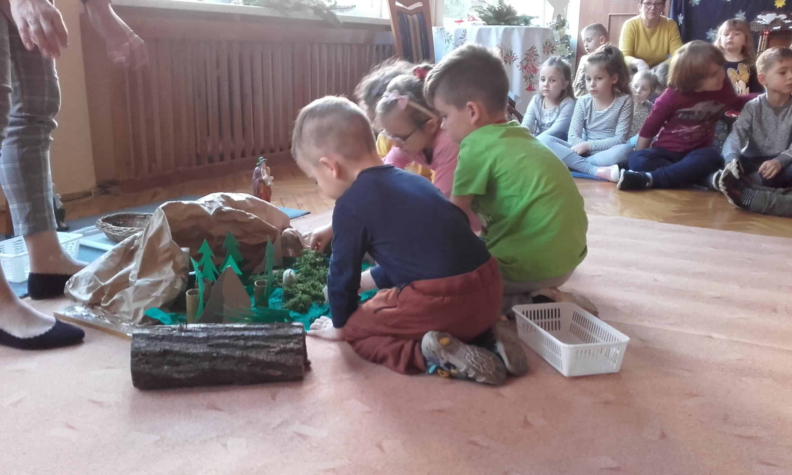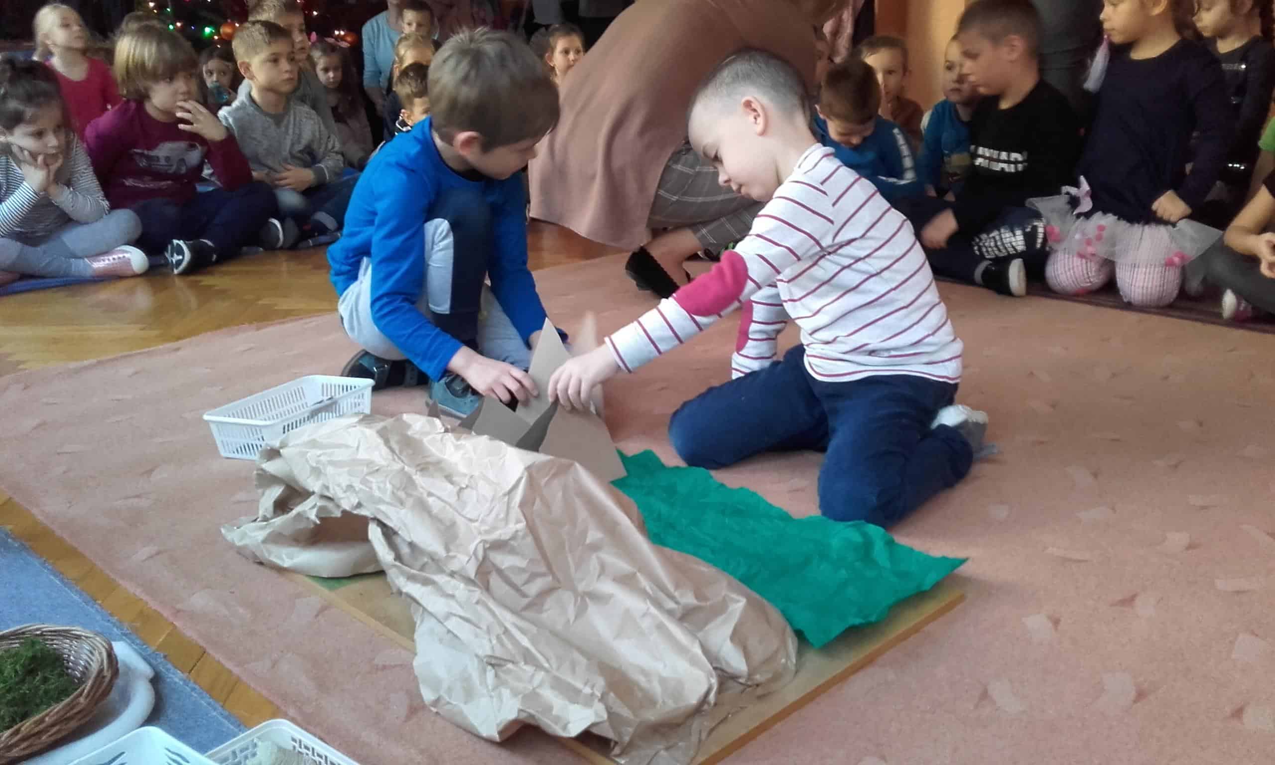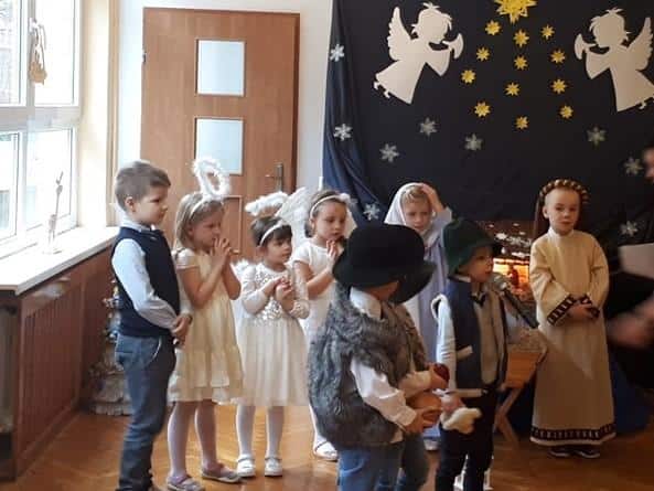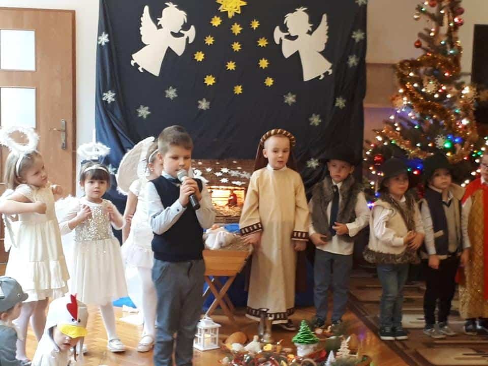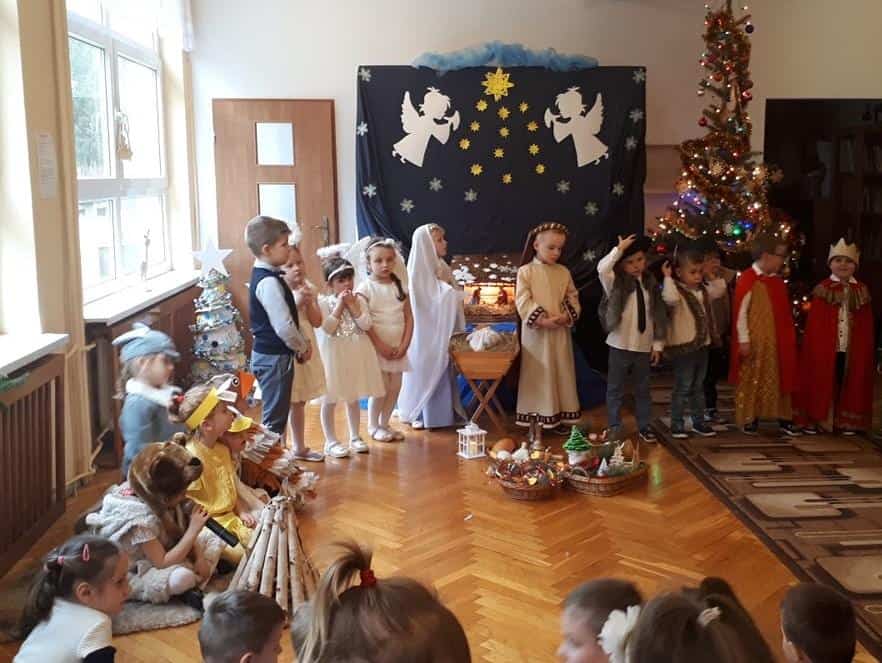 Wigilia – najbardziej uroczysty i wzruszający wieczór w roku, wyzwalający w ludziach ich najlepsze uczucia. To jeden z najpiękniejszych dni, na który czekamy i tak uroczyście przeżywamy. W naszym przedszkolu odbył się on 20 grudnia i miał iście świąteczny charakter. Każdy z nas odświętnie ubrany, krzątający się od rana i pomagający w różnych czynnościach związanych z tym magicznym czasem. Wspólne przygotowywanie sali – nakrywanie do stołu, ustawianie krzeseł, rozkładanie serwetek, pachnących stroików, a później przeżywanie wydarzeń związanych z tym dniem. Początkiem naszego świętowania był udział wszystkich dzieci, pracowników przedszkola i obecnych rodziców w uroczystej godzince adwentowej przygotowanej przez Grupę Czerwoną, z gościnnym udziałem niektórych przedszkolaków z Grupy Zielonej, pt. „Dziś jest dzień narodzin Pana Jezusa”, przedstawionej w formie Jasełek. W tym szczególnym dniu wszyscy chcieli pójść i pokłonić się Maleńkiemu Jezusowi, dlatego też nie zabrakło darów dla Nowonarodzonej Dzieciny złożonych przy Jego żłóbku przez dzieci z poszczególne grupy.