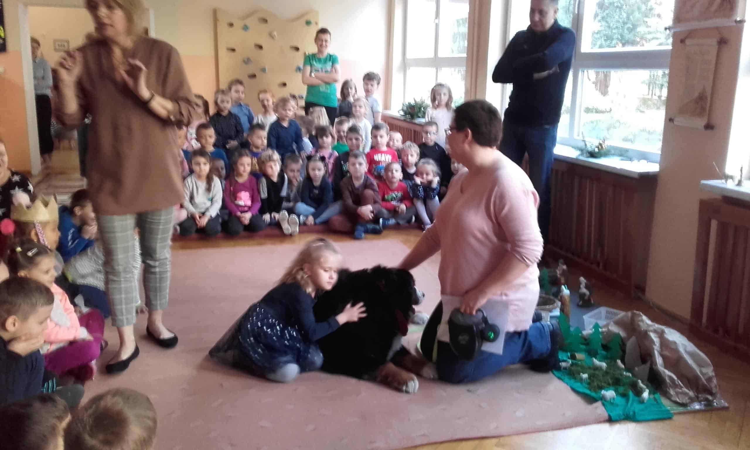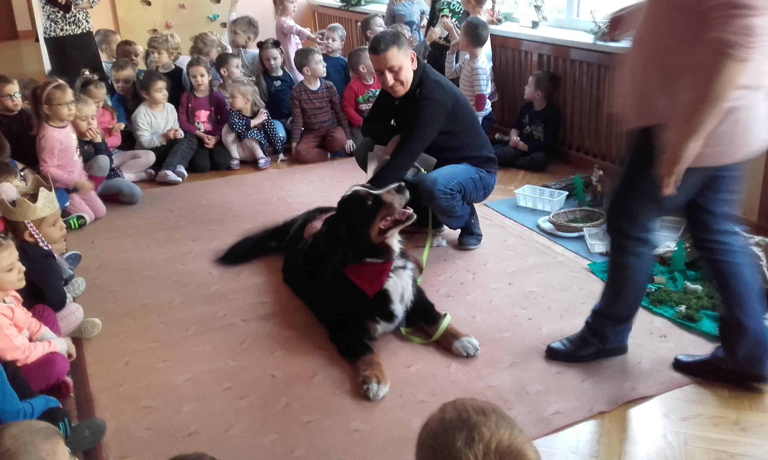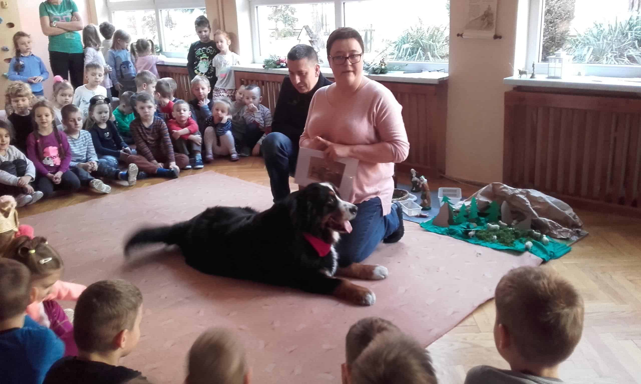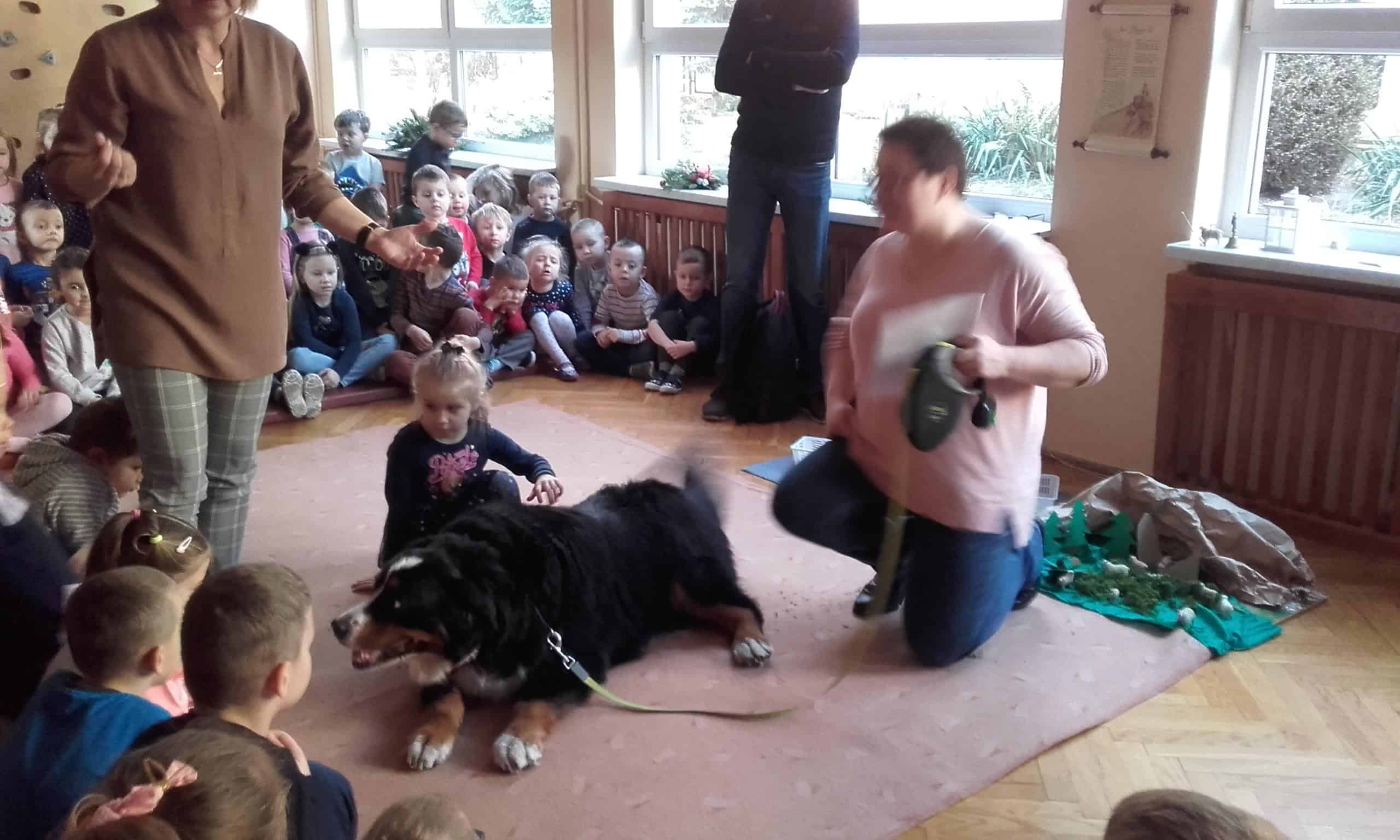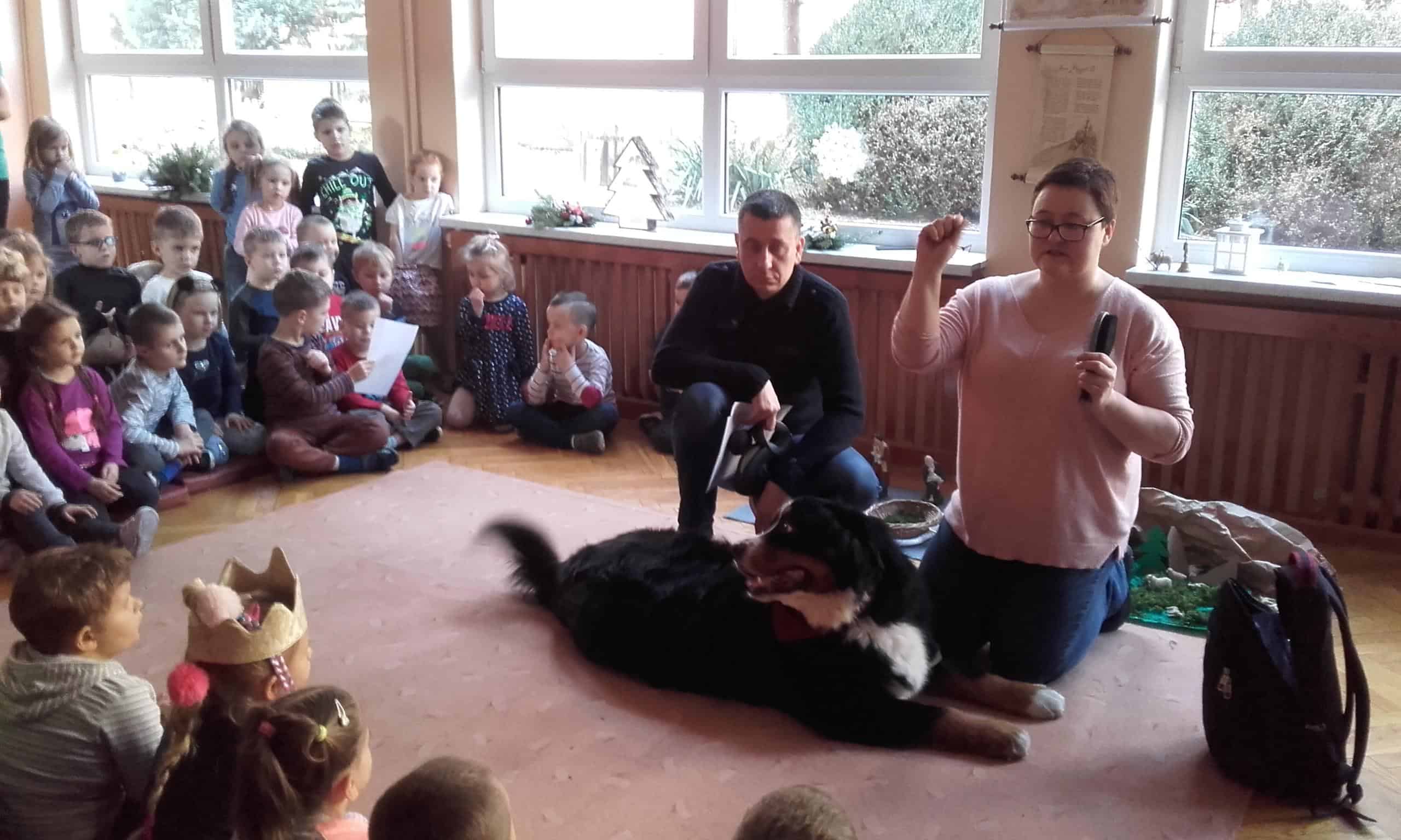 Za sprawą Pani Agaty – Mamusi Marysi odbyło się bardzo emocjonujące spotkanie z Fiorą. Fiora to berneński pies pasterski. Pani Anna i Pan Krzysztof – właściciele Fiory z przyjemnością przyjęli nasze zaproszenie,aby zapoznać dzieci z psem i opowiedzieć wiele interesujących ciekawostek o tej rasie. Impulsem do zorganizowania takiego spotkanie była jedna z godzinek adwentowych tradycyjnie prowadzona w naszym przedszkolu w okresie adwentu. Tematem godzinki była „Przypowieść o dobrym pasterzu” i oczywiście w związku z wizytą Fiory mocno zaakcentowany wątek psa pasterskiego. Fiora okazała się ogromnym ważącym 57 kg psem, ale bardzo sympatycznym, towarzyskim, spokojnie znosiła towarzystwo dzieci z 5 grup przedszkolnych. Bardzo serdecznie przywitała się z dziećmi merdając sporym ogonem. Na dzieciach wywarła ogromne wrażenie. Pani Anna – opowiedziała nam wiele ciekawostek o tej rasie – psy tej rasy są inteligentne, czułe, wierne, lojalne, doskonale sprawdzały się jako stróże stada owiec, czy też bydła. Są bardzo spostrzegawcze i czujne. Pierwotne berneńczyki były wykorzystywane jako wszechstronne psy gospodarskie – oprócz stróżowania, ciągnęły wózki z mlekiem, czy też innymi towarami. Są też doskonałymi psami rodzinnymi. Na koniec spotkania Fiora otrzymała od dzieci mały upominek – mięsne gryzaki, z czego była wyraźnie zadowolona.