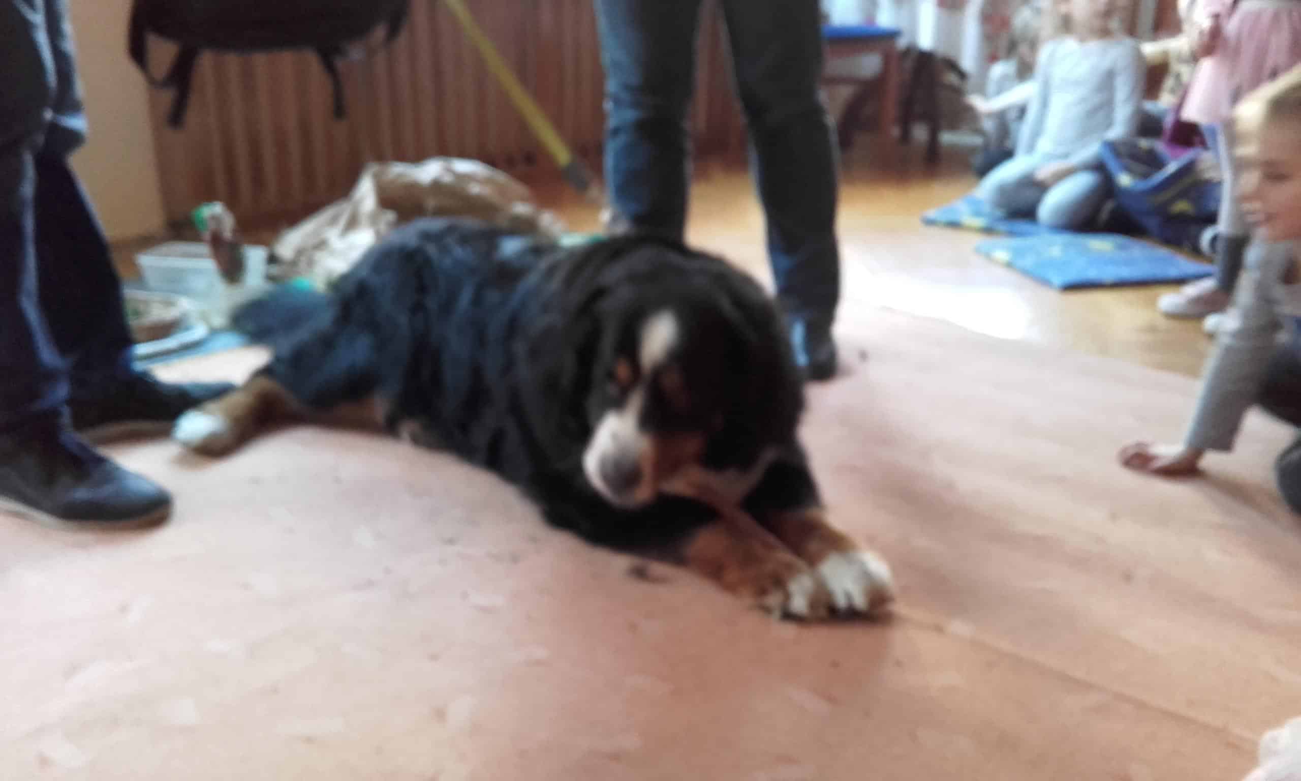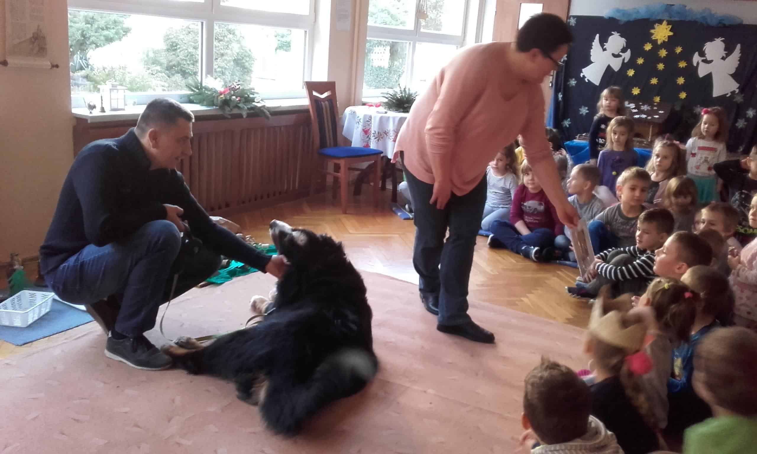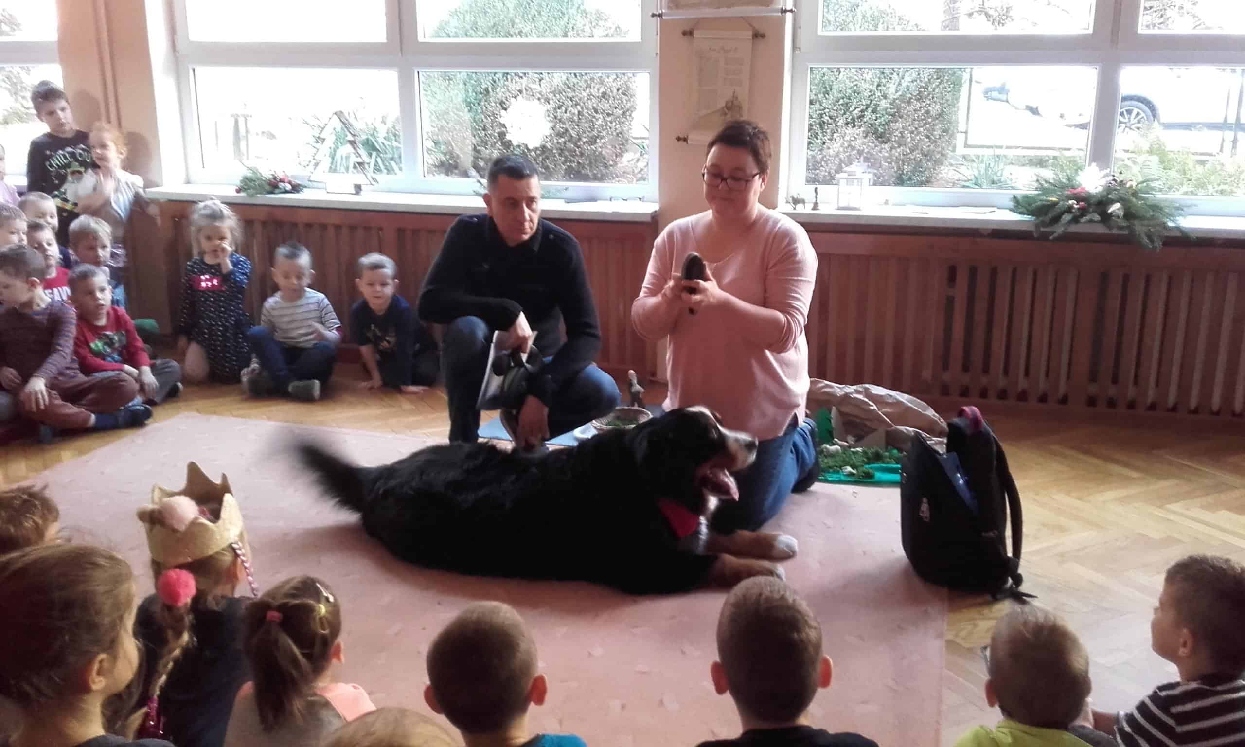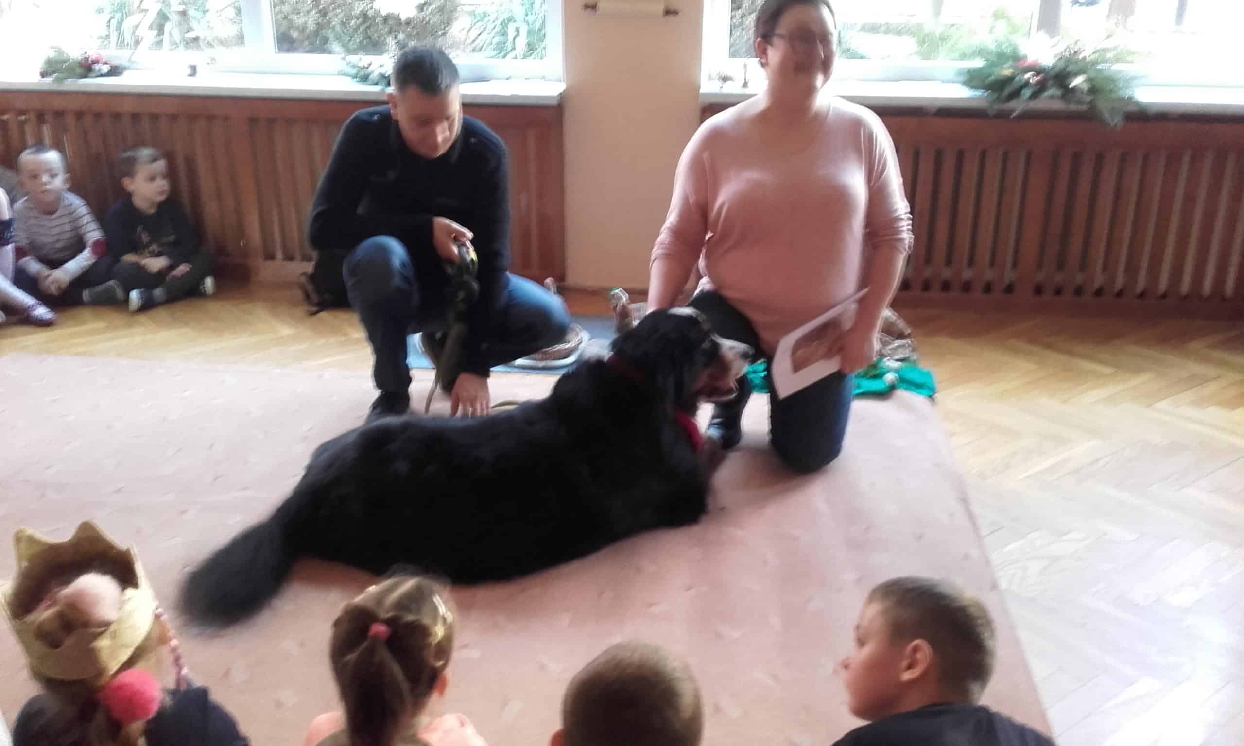 Za sprawą Pani Agaty – Mamusi Marysi odbyło się bardzo emocjonujące spotkanie z Fiorą. Fiora to berneński pies pasterski. Pani Anna i Pan Krzysztof – właściciele Fiory z przyjemnością przyjęli nasze zaproszenie,aby zapoznać dzieci z psem i opowiedzieć wiele interesujących ciekawostek o tej rasie. Impulsem do zorganizowania takiego spotkanie była jedna z godzinek adwentowych tradycyjnie prowadzona w naszym przedszkolu w okresie adwentu. Tematem godzinki była „Przypowieść o dobrym pasterzu” i oczywiście w związku z wizytą Fiory mocno zaakcentowany wątek psa pasterskiego. Fiora okazała się ogromnym ważącym 57 kg psem, ale bardzo sympatycznym, towarzyskim, spokojnie znosiła towarzystwo dzieci z 5 grup przedszkolnych. Bardzo serdecznie przywitała się z dziećmi merdając sporym ogonem. Na dzieciach wywarła ogromne wrażenie. Pani Anna – opowiedziała nam wiele ciekawostek o tej rasie – psy tej rasy są inteligentne, czułe, wierne, lojalne, doskonale sprawdzały się jako stróże stada owiec, czy też bydła. Są bardzo spostrzegawcze i czujne. Pierwotne berneńczyki były wykorzystywane jako wszechstronne psy gospodarskie – oprócz stróżowania, ciągnęły wózki z mlekiem, czy też innymi towarami. Są też doskonałymi psami rodzinnymi. Na koniec spotkania Fiora otrzymała od dzieci mały upominek – mięsne gryzaki, z czego była wyraźnie zadowolona.