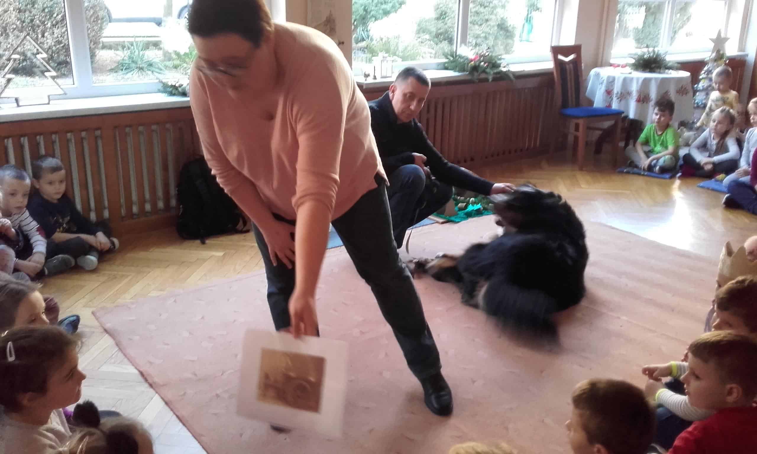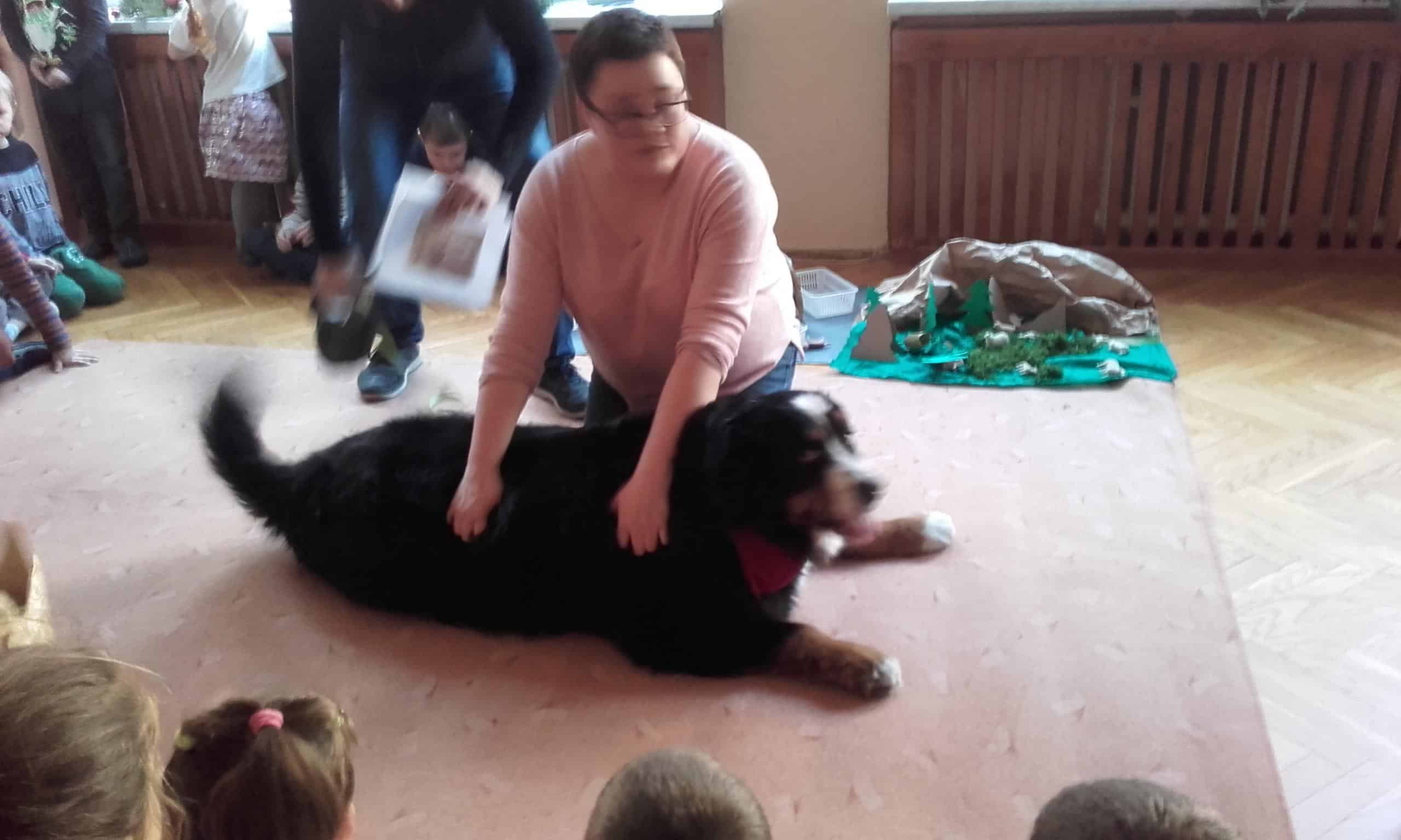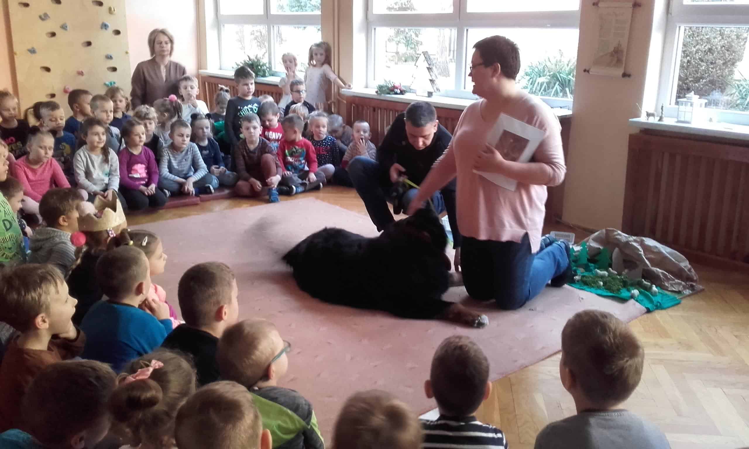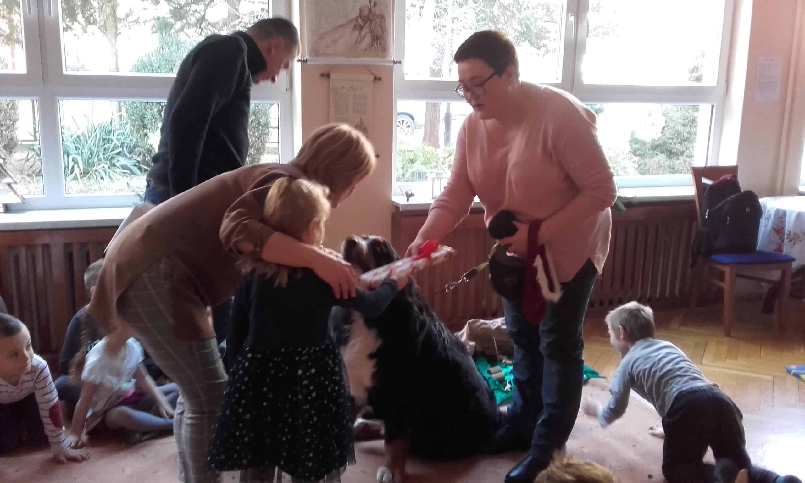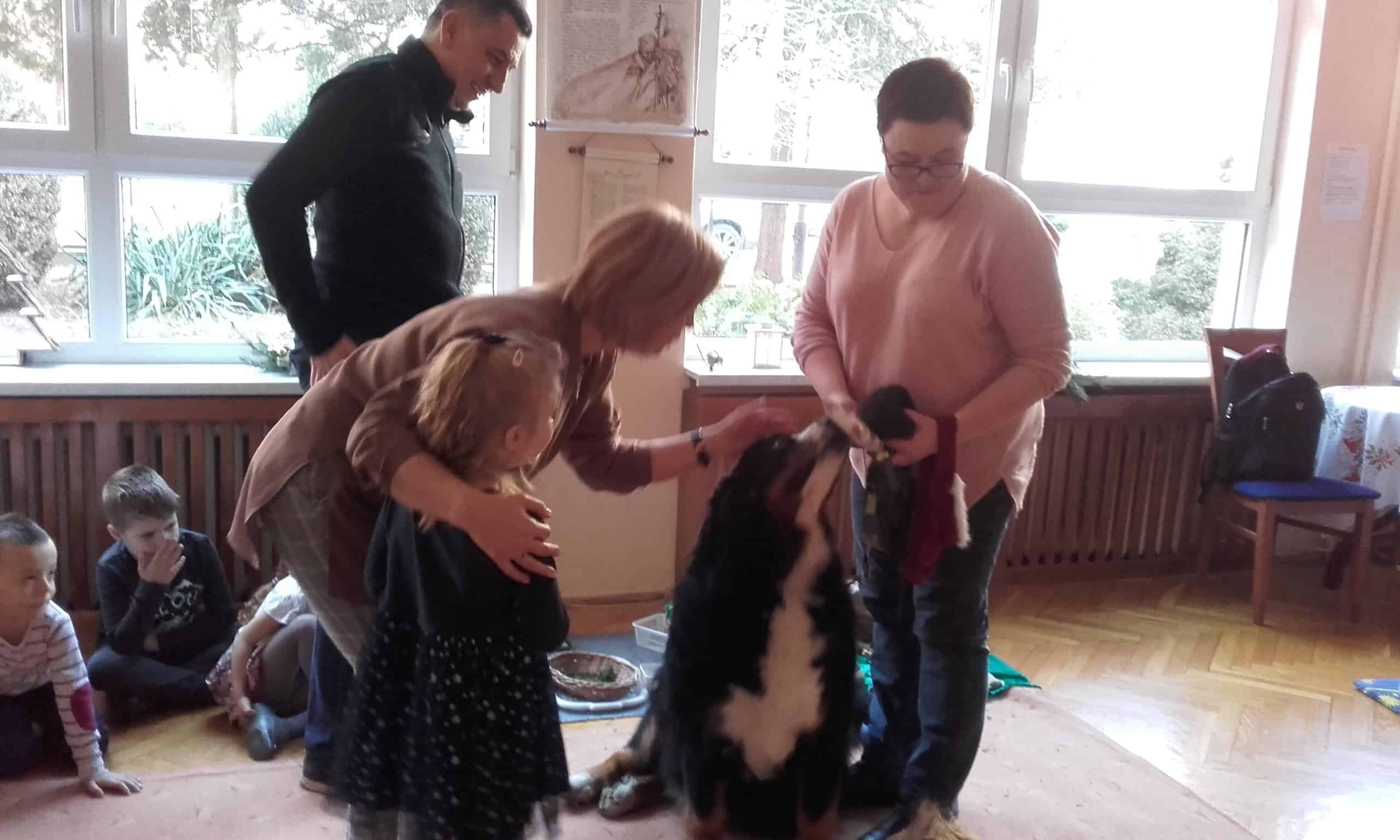 Za sprawą Pani Agaty – Mamusi Marysi odbyło się bardzo emocjonujące spotkanie z Fiorą. Fiora to berneński pies pasterski. Pani Anna i Pan Krzysztof – właściciele Fiory z przyjemnością przyjęli nasze zaproszenie,aby zapoznać dzieci z psem i opowiedzieć wiele interesujących ciekawostek o tej rasie. Impulsem do zorganizowania takiego spotkanie była jedna z godzinek adwentowych tradycyjnie prowadzona w naszym przedszkolu w okresie adwentu. Tematem godzinki była „Przypowieść o dobrym pasterzu” i oczywiście w związku z wizytą Fiory mocno zaakcentowany wątek psa pasterskiego. Fiora okazała się ogromnym ważącym 57 kg psem, ale bardzo sympatycznym, towarzyskim, spokojnie znosiła towarzystwo dzieci z 5 grup przedszkolnych. Bardzo serdecznie przywitała się z dziećmi merdając sporym ogonem. Na dzieciach wywarła ogromne wrażenie. Pani Anna – opowiedziała nam wiele ciekawostek o tej rasie – psy tej rasy są inteligentne, czułe, wierne, lojalne, doskonale sprawdzały się jako stróże stada owiec, czy też bydła. Są bardzo spostrzegawcze i czujne. Pierwotne berneńczyki były wykorzystywane jako wszechstronne psy gospodarskie – oprócz stróżowania, ciągnęły wózki z mlekiem, czy też innymi towarami. Są też doskonałymi psami rodzinnymi. Na koniec spotkania Fiora otrzymała od dzieci mały upominek – mięsne gryzaki, z czego była wyraźnie zadowolona.
