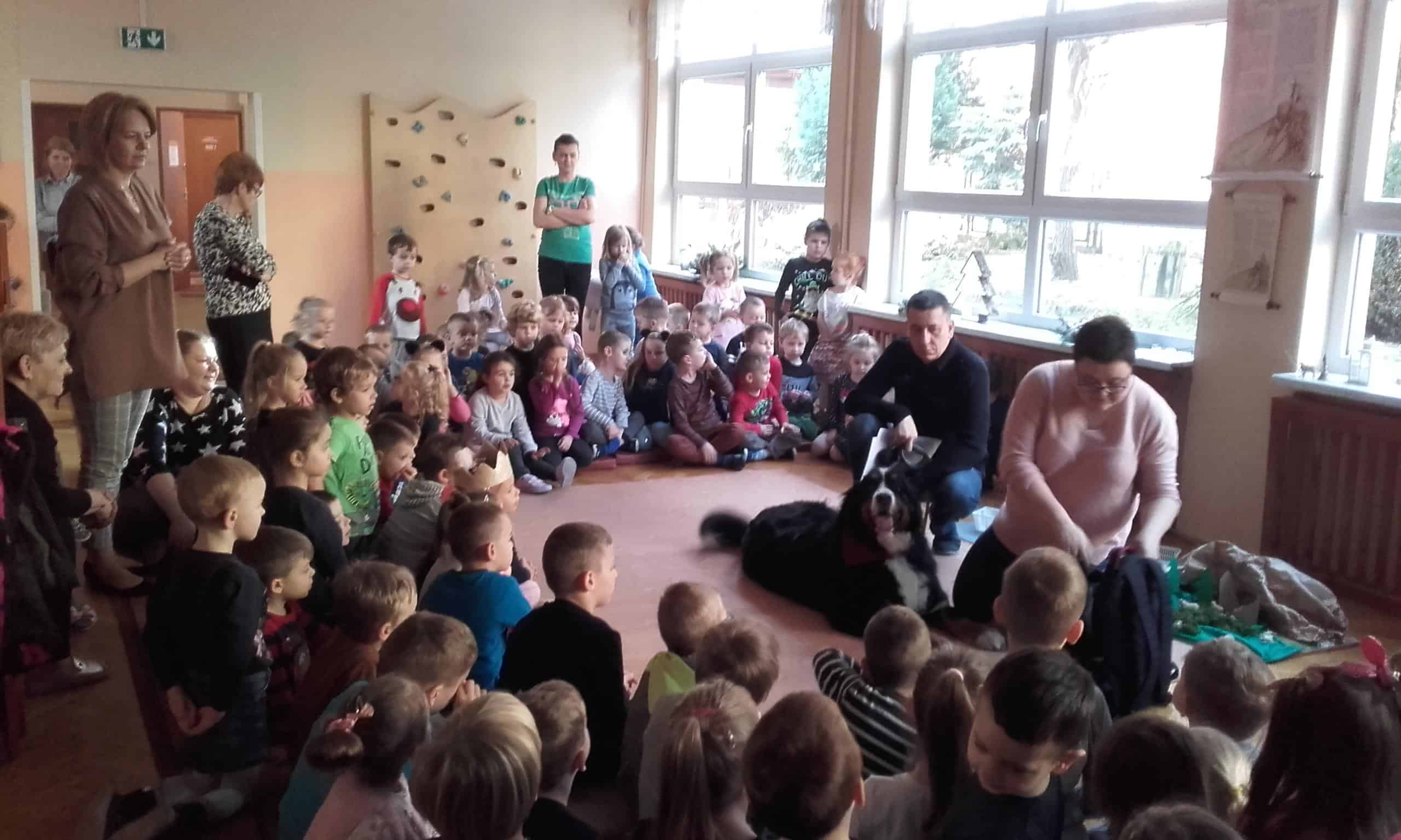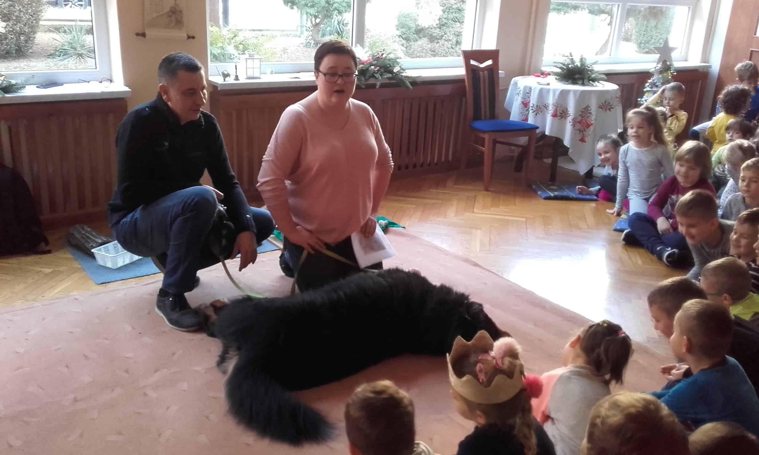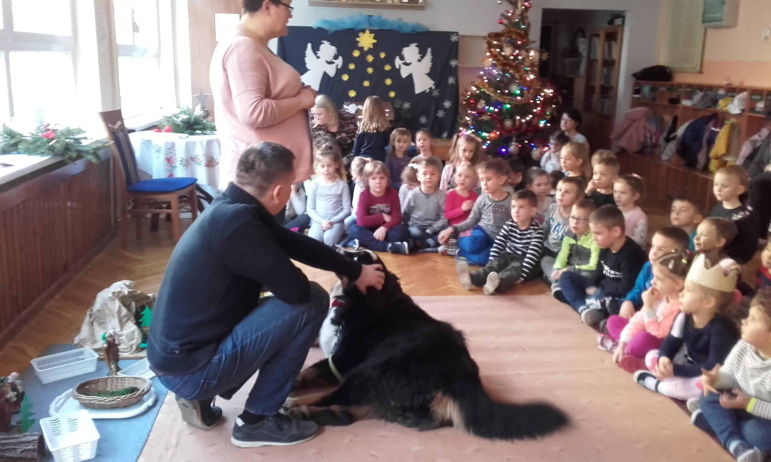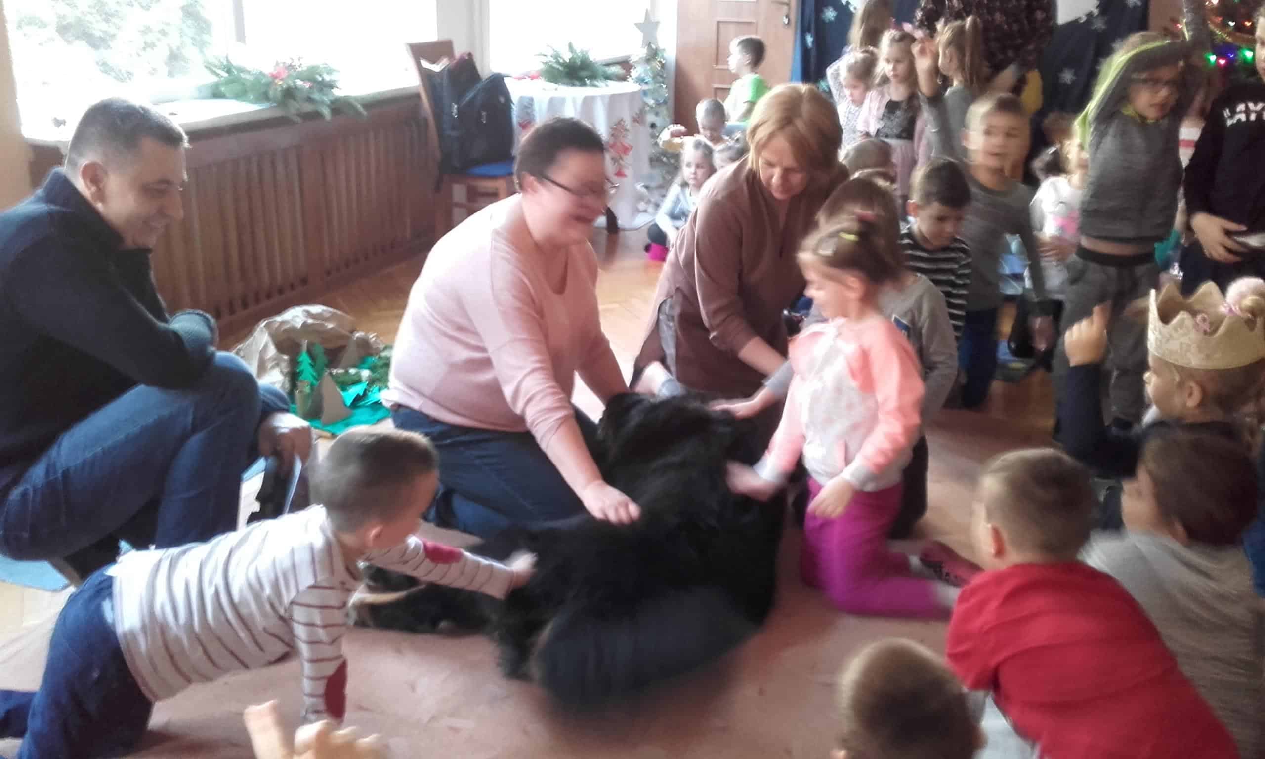 Za sprawą Pani Agaty – Mamusi Marysi odbyło się bardzo emocjonujące spotkanie z Fiorą. Fiora to berneński pies pasterski. Pani Anna i Pan Krzysztof – właściciele Fiory z przyjemnością przyjęli nasze zaproszenie,aby zapoznać dzieci z psem i opowiedzieć wiele interesujących ciekawostek o tej rasie. Impulsem do zorganizowania takiego spotkanie była jedna z godzinek adwentowych tradycyjnie prowadzona w naszym przedszkolu w okresie adwentu. Tematem godzinki była „Przypowieść o dobrym pasterzu” i oczywiście w związku z wizytą Fiory mocno zaakcentowany wątek psa pasterskiego. Fiora okazała się ogromnym ważącym 57 kg psem, ale bardzo sympatycznym, towarzyskim, spokojnie znosiła towarzystwo dzieci z 5 grup przedszkolnych. Bardzo serdecznie przywitała się z dziećmi merdając sporym ogonem. Na dzieciach wywarła ogromne wrażenie. Pani Anna – opowiedziała nam wiele ciekawostek o tej rasie – psy tej rasy są inteligentne, czułe, wierne, lojalne, doskonale sprawdzały się jako stróże stada owiec, czy też bydła. Są bardzo spostrzegawcze i czujne. Pierwotne berneńczyki były wykorzystywane jako wszechstronne psy gospodarskie – oprócz stróżowania, ciągnęły wózki z mlekiem, czy też innymi towarami. Są też doskonałymi psami rodzinnymi. Na koniec spotkania Fiora otrzymała od dzieci mały upominek – mięsne gryzaki, z czego była wyraźnie zadowolona.