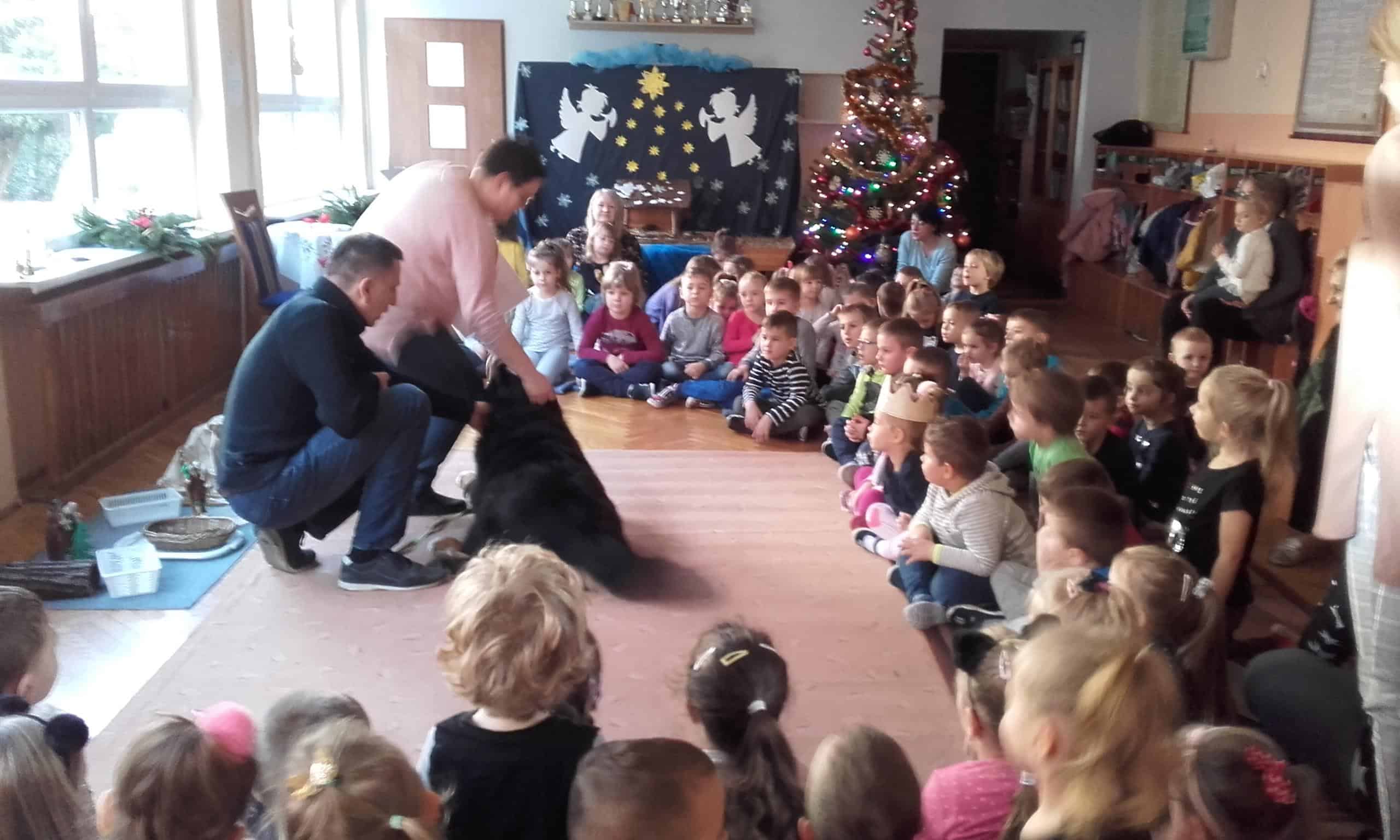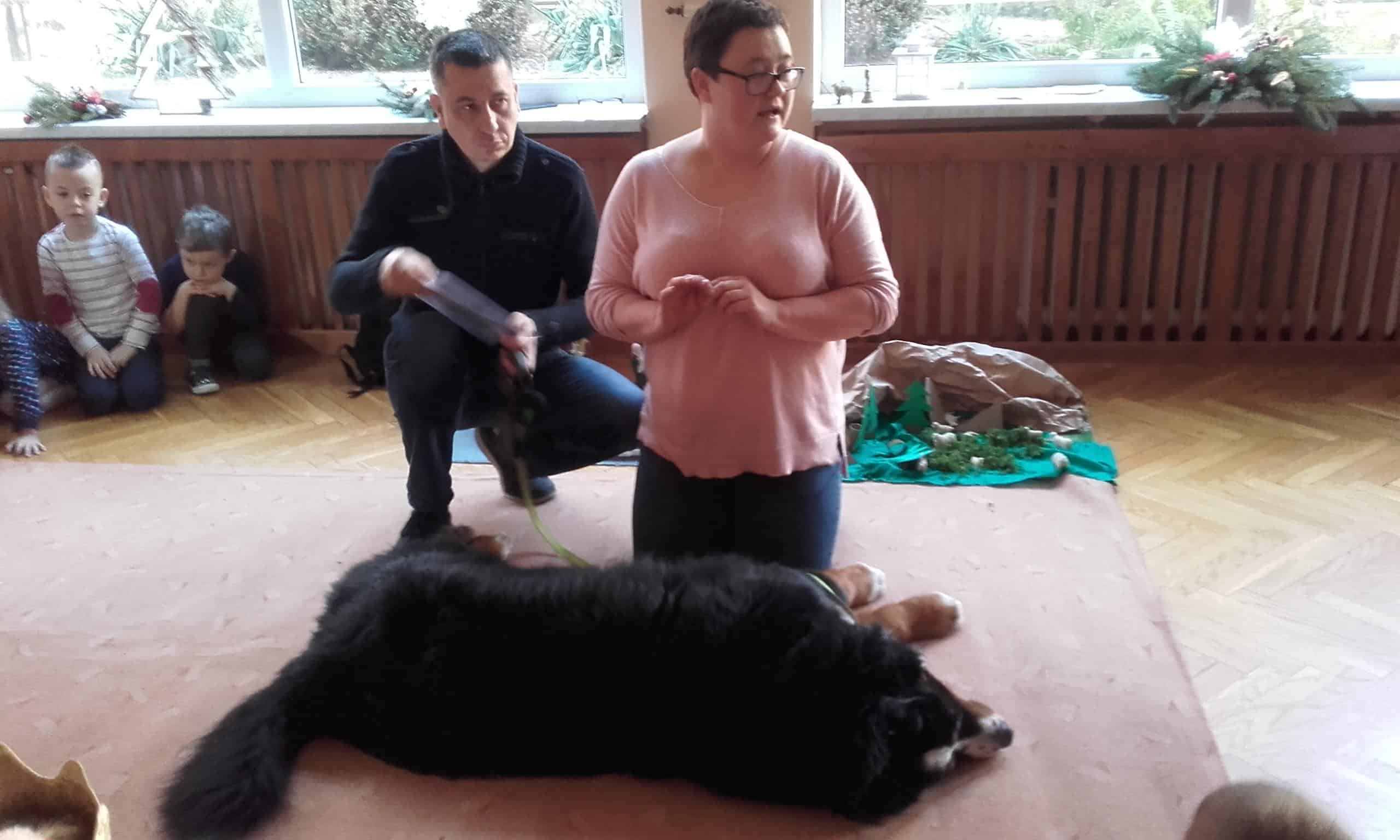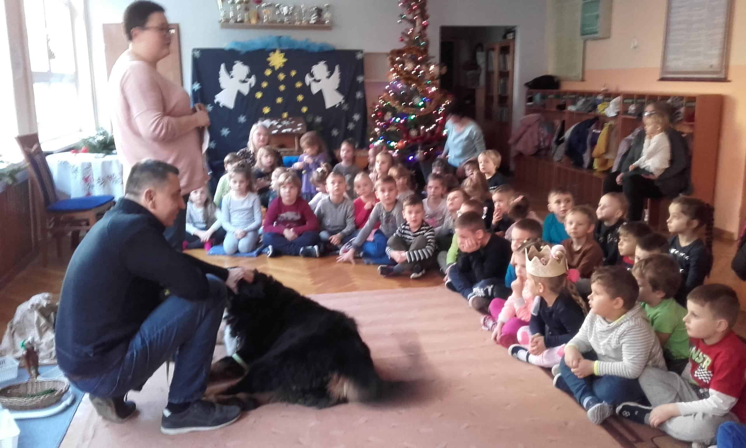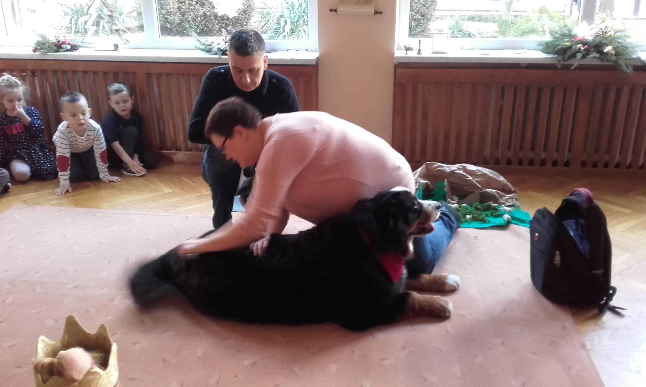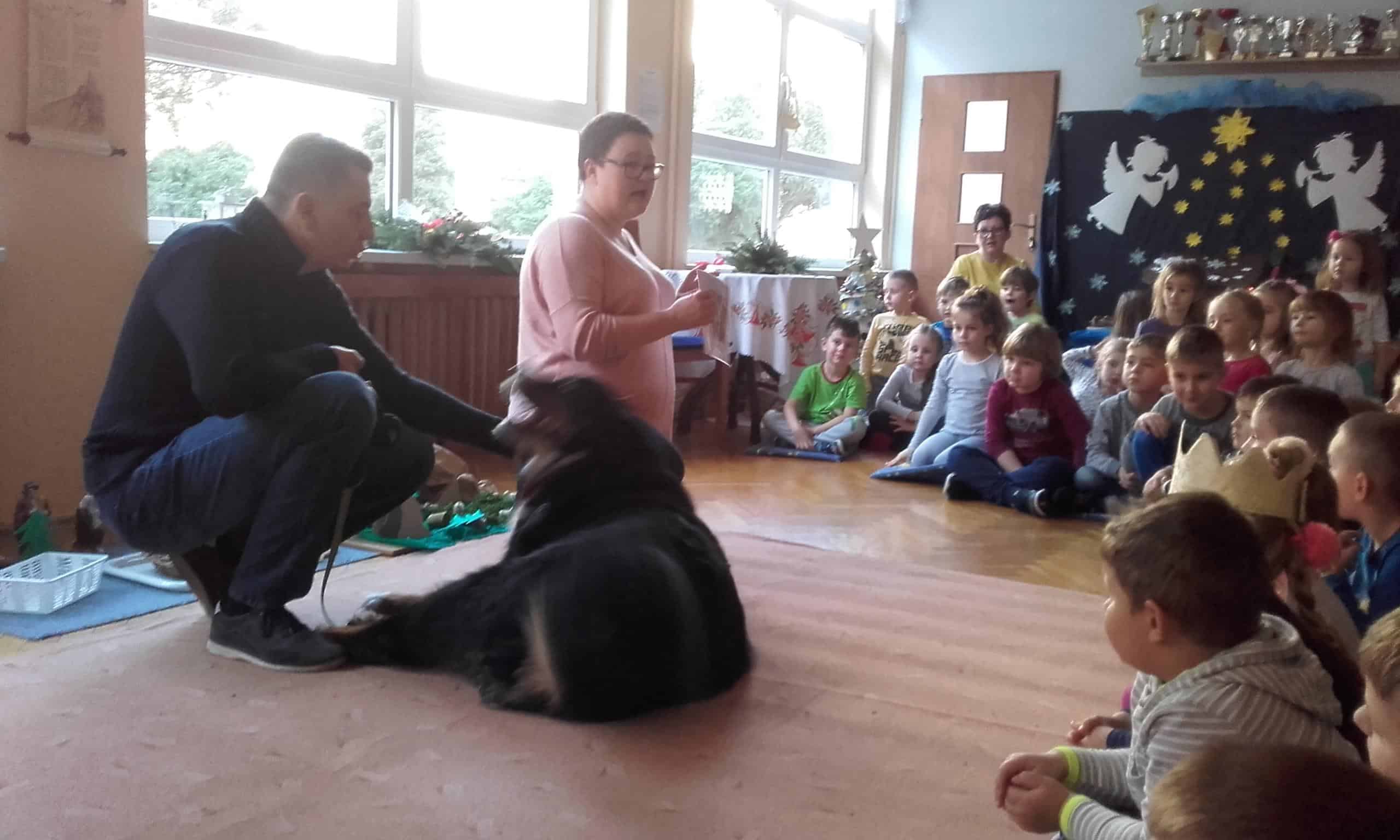 Za sprawą Pani Agaty – Mamusi Marysi odbyło się bardzo emocjonujące spotkanie z Fiorą. Fiora to berneński pies pasterski. Pani Anna i Pan Krzysztof – właściciele Fiory z przyjemnością przyjęli nasze zaproszenie,aby zapoznać dzieci z psem i opowiedzieć wiele interesujących ciekawostek o tej rasie. Impulsem do zorganizowania takiego spotkanie była jedna z godzinek adwentowych tradycyjnie prowadzona w naszym przedszkolu w okresie adwentu. Tematem godzinki była „Przypowieść o dobrym pasterzu” i oczywiście w związku z wizytą Fiory mocno zaakcentowany wątek psa pasterskiego. Fiora okazała się ogromnym ważącym 57 kg psem, ale bardzo sympatycznym, towarzyskim, spokojnie znosiła towarzystwo dzieci z 5 grup przedszkolnych. Bardzo serdecznie przywitała się z dziećmi merdając sporym ogonem. Na dzieciach wywarła ogromne wrażenie. Pani Anna – opowiedziała nam wiele ciekawostek o tej rasie – psy tej rasy są inteligentne, czułe, wierne, lojalne, doskonale sprawdzały się jako stróże stada owiec, czy też bydła. Są bardzo spostrzegawcze i czujne. Pierwotne berneńczyki były wykorzystywane jako wszechstronne psy gospodarskie – oprócz stróżowania, ciągnęły wózki z mlekiem, czy też innymi towarami. Są też doskonałymi psami rodzinnymi. Na koniec spotkania Fiora otrzymała od dzieci mały upominek – mięsne gryzaki, z czego była wyraźnie zadowolona.