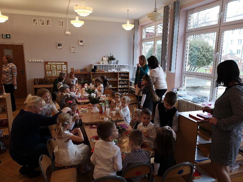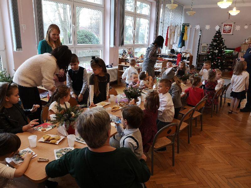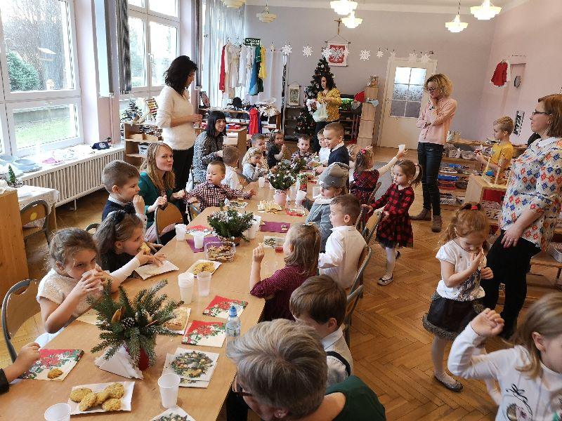 Po występie naszych artystów, Pani Dyrektor złożyła dzieciom, rodzicom, nauczycielom i wszystkim pracownikom przedszkola najlepsze, bożonarodzeniowe i noworoczne życzenia, po czym wspólnie dzielono się opłatkiem, życząc sobie wzajemnie wszelkiej pomyślności. Po opłatku wszyscy zasiedli do odświętnie przystrojonego stołu, aby przy nim móc posmakować tradycyjnej zupy grzybowej, kapusty z grochem i wigilijnej ryby. Atmosfera była prawdziwie rodzinna. Iście świąteczny klimat utrzymywał się w grupach bardzo długo, a śpiew kolęd i pastorałek rozbrzmiewał nieustannie.
