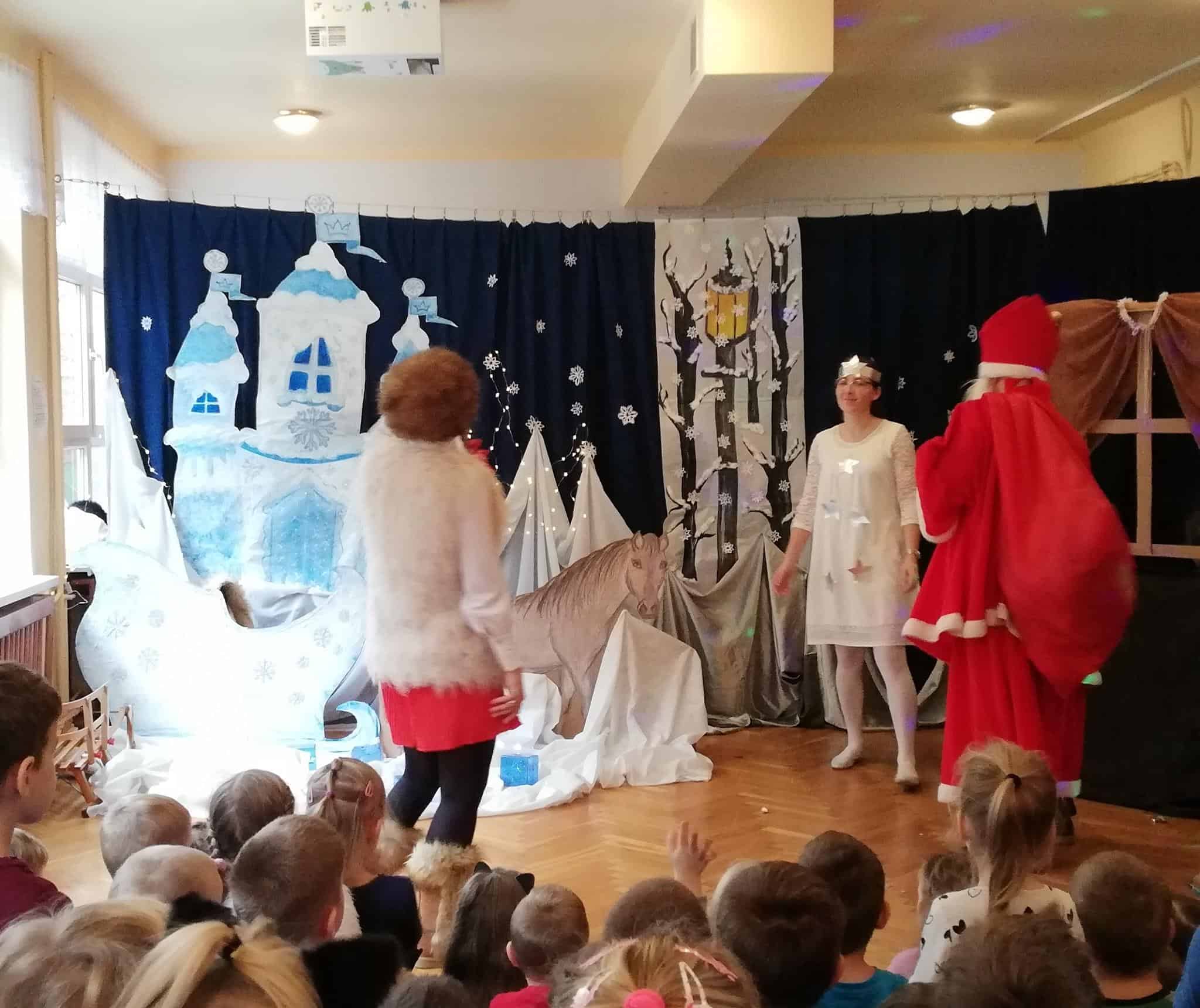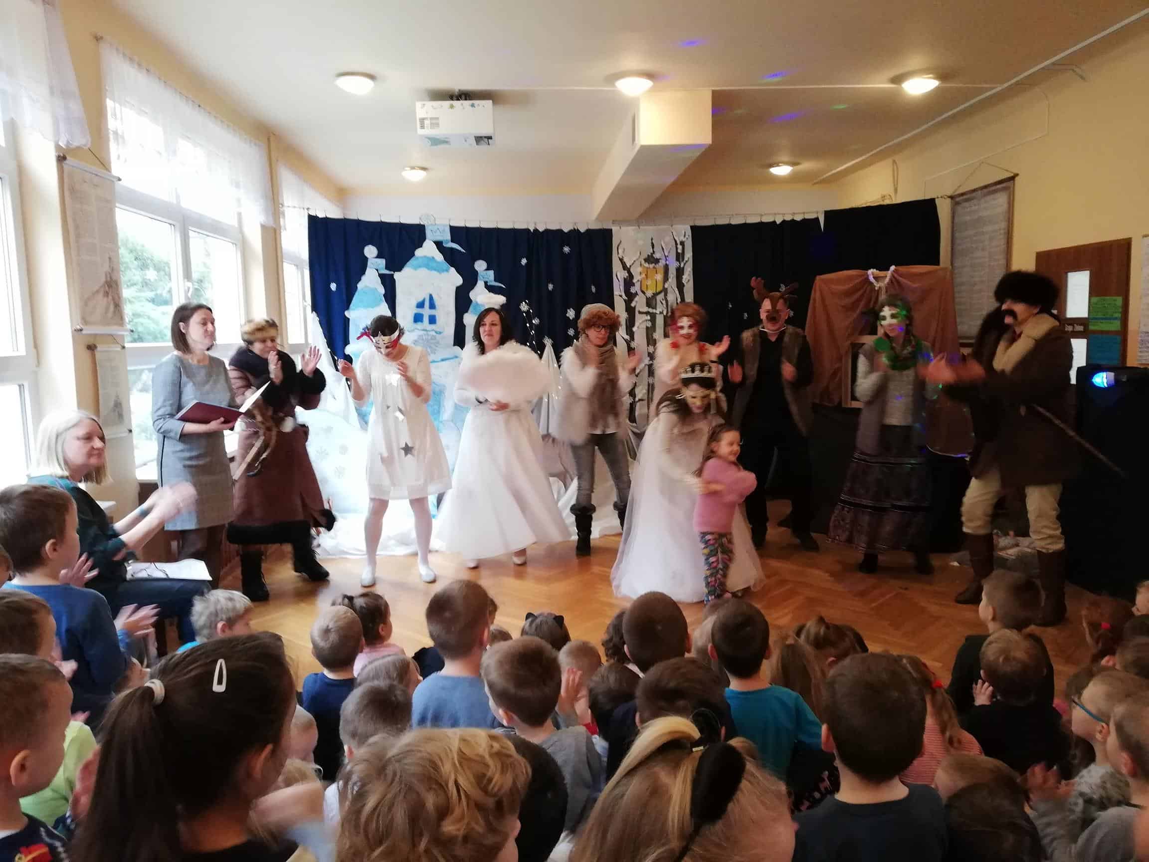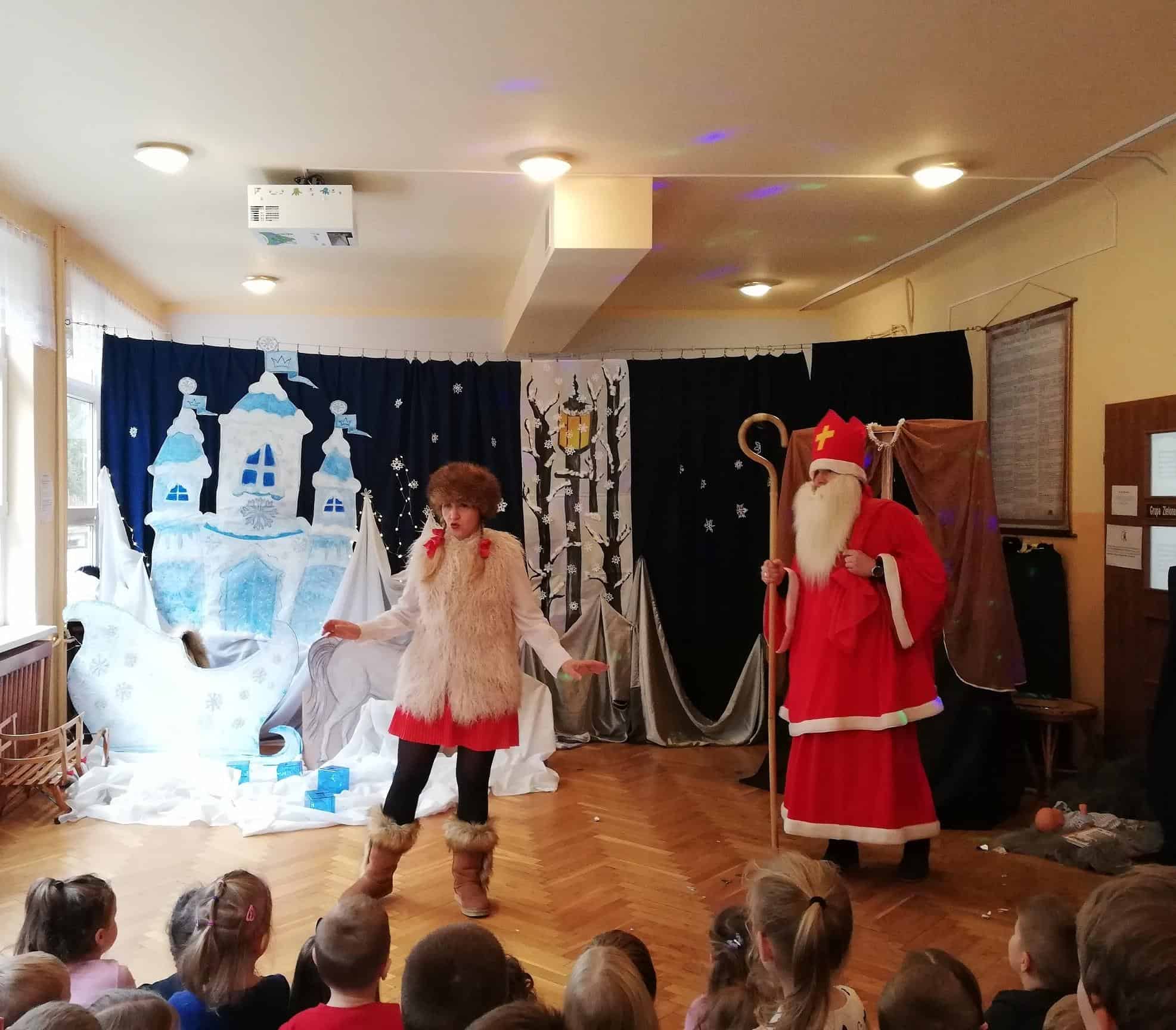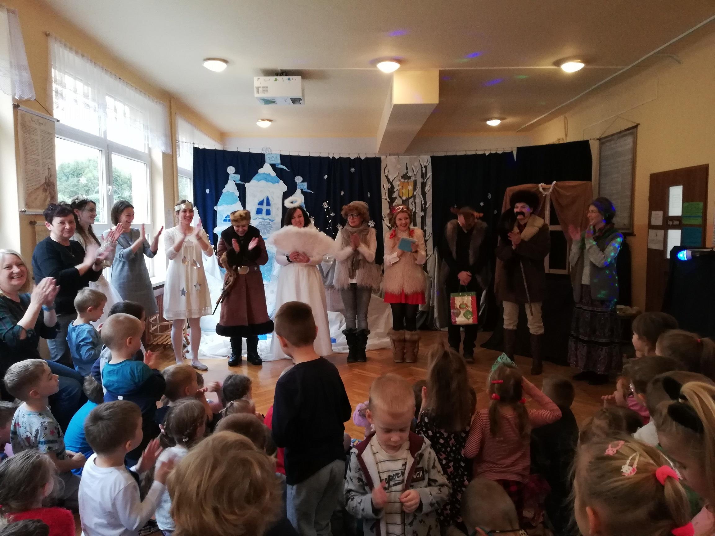 Dziękujemy aktorom, naszym wspaniałym Rodzicom za pomoc, zaangażowanie, przygotowanie strojów, rekwizytów i pięknej scenografii. Tutaj szczególne podziękowania składamy na ręce p. Marty Mątkowskiej i p. Małgorzaty Warzochy. Dekoracje w Waszym wykonaniu to po prostu mistrzostwo 🙂 Ponieważ mieliśmy braki w obsadzie, a zwłaszcza brakowało nam panów – p. Artur stanął na wysokości zadania i wcielił się w podwójną rolę Mikołaja i Renifera, za co bardzo dziękujemy. Dodatkowe podziękowania należą się p. Basi, która w ostatniej chwili zastąpiła naszą koleżankę i uratowała zaistniałą sytuację.