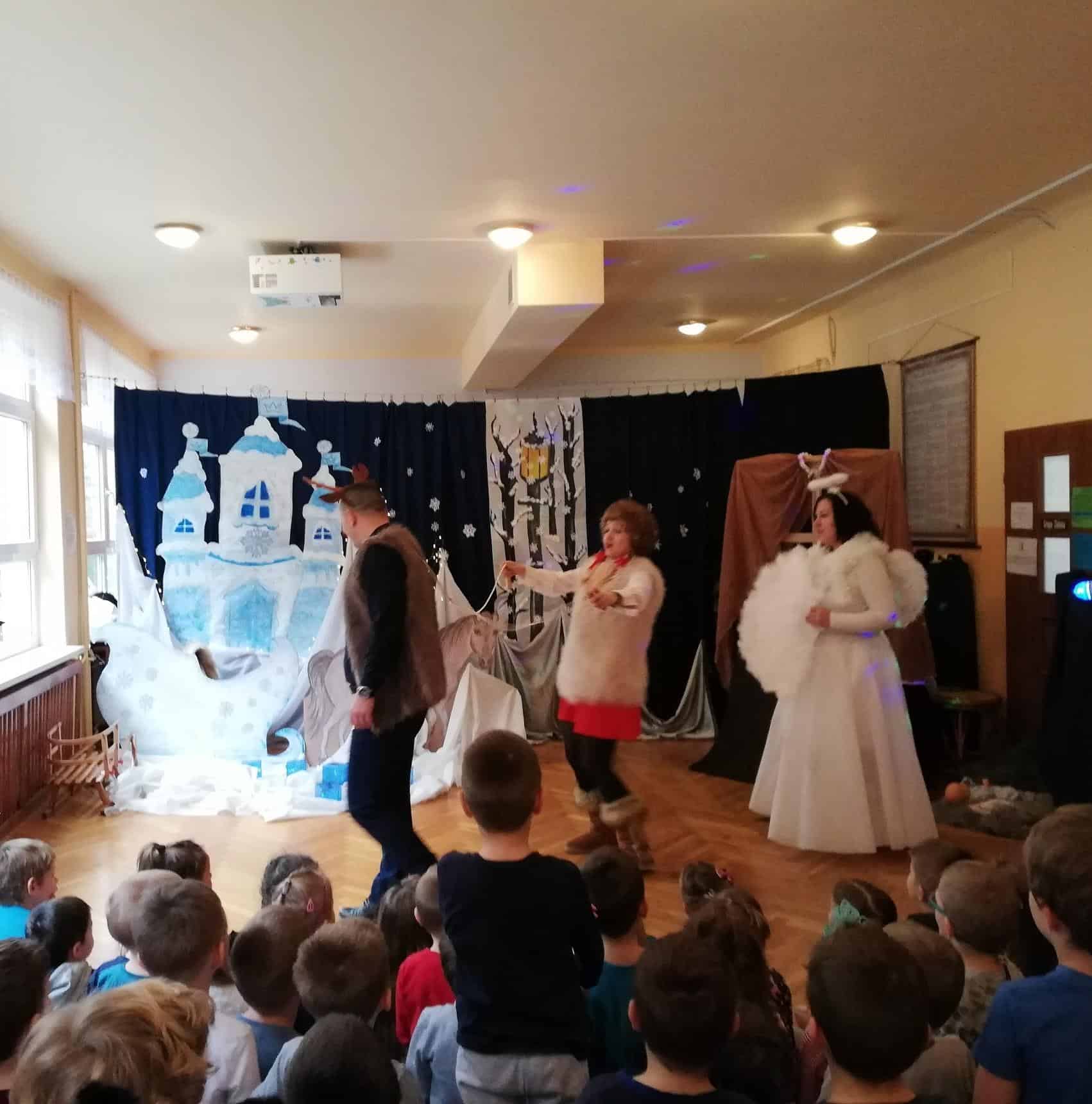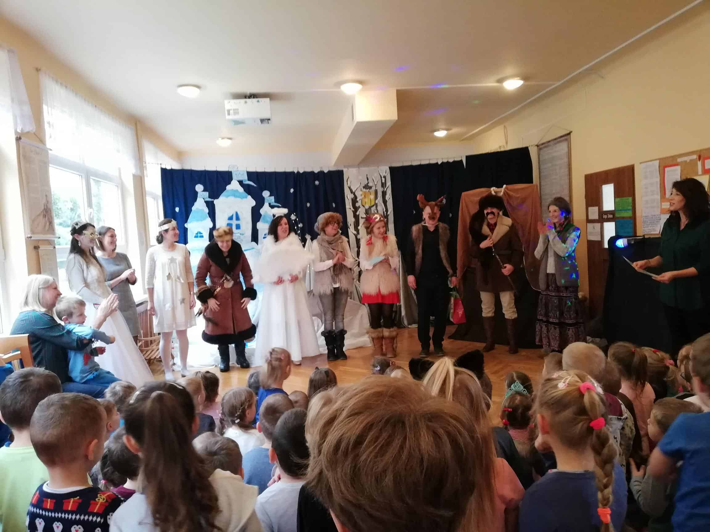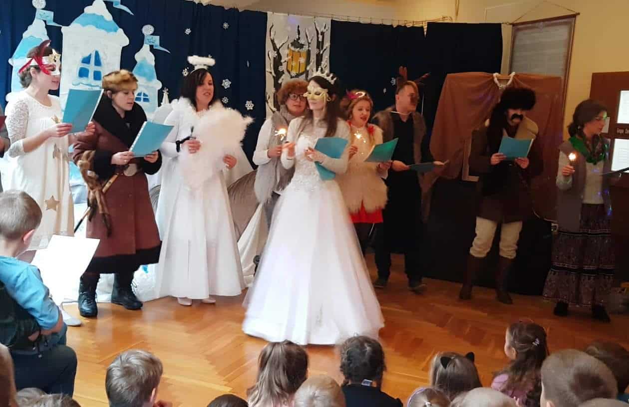 Dziękujemy aktorom, naszym wspaniałym Rodzicom za pomoc, zaangażowanie, przygotowanie strojów, rekwizytów i pięknej scenografii. Tutaj szczególne podziękowania składamy na ręce p. Marty Mątkowskiej i p. Małgorzaty Warzochy. Dekoracje w Waszym wykonaniu to po prostu mistrzostwo 🙂 Ponieważ mieliśmy braki w obsadzie, a zwłaszcza brakowało nam panów – p. Artur stanął na wysokości zadania i wcielił się w podwójną rolę Mikołaja i Renifera, za co bardzo dziękujemy. Dodatkowe podziękowania należą się p. Basi, która w ostatniej chwili zastąpiła naszą koleżankę i uratowała zaistniałą sytuację.