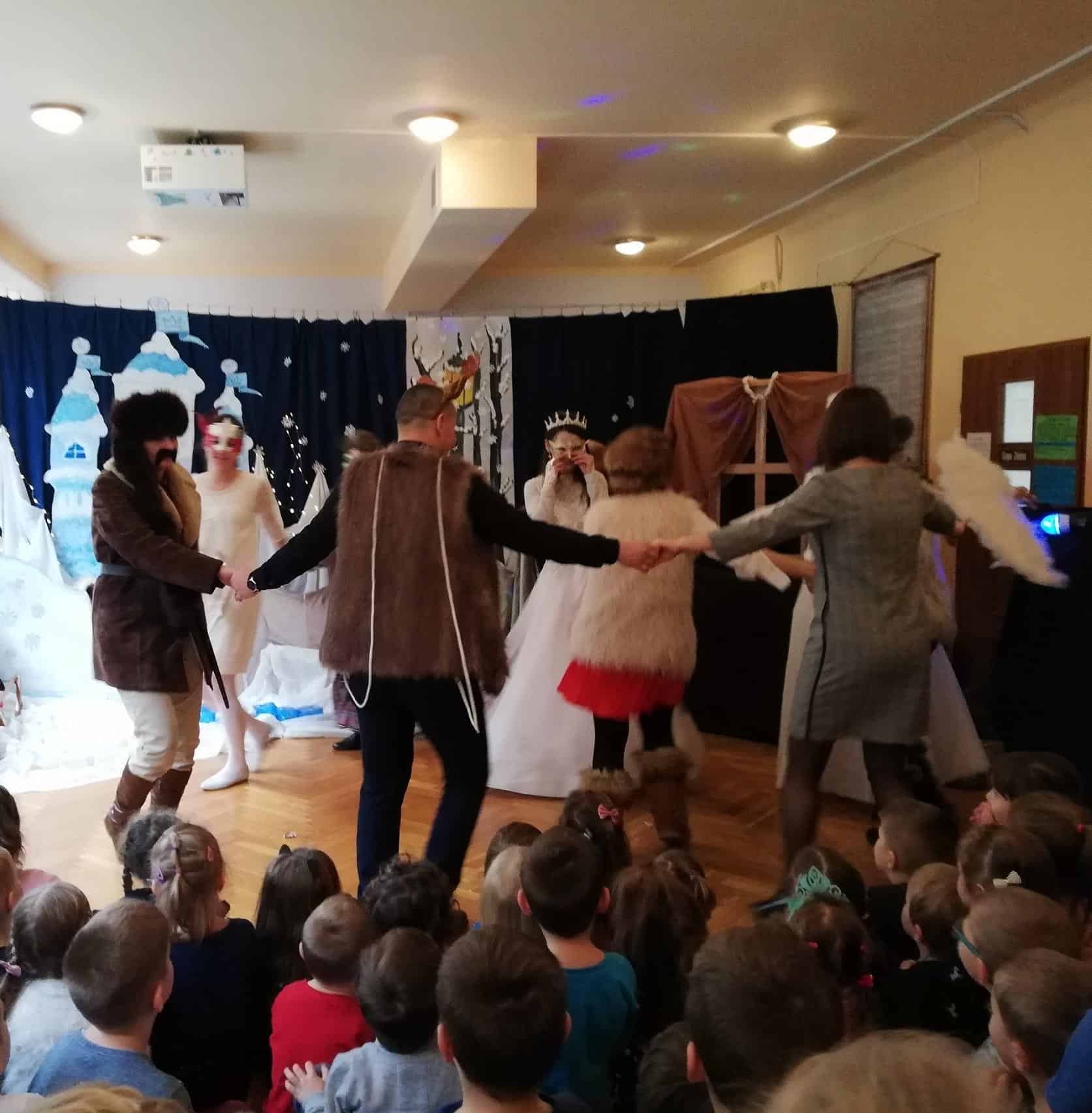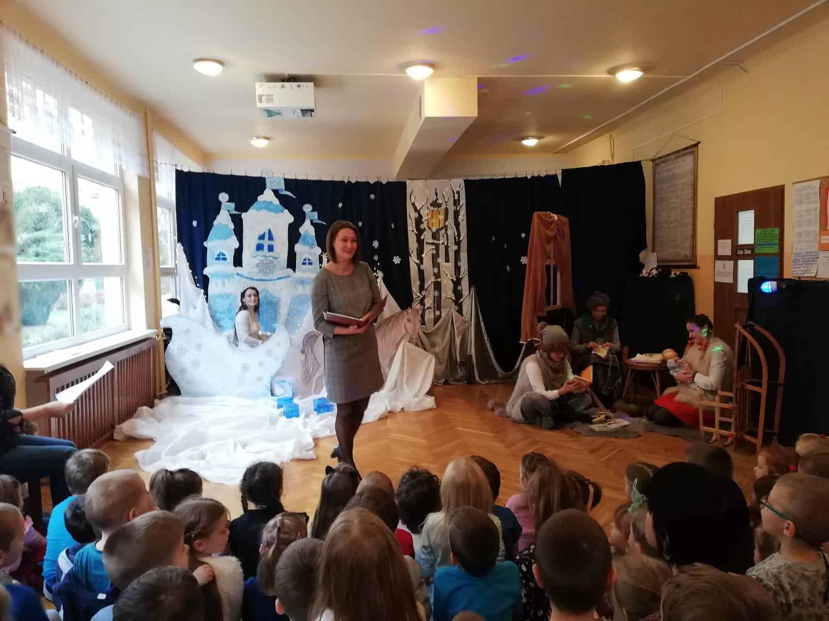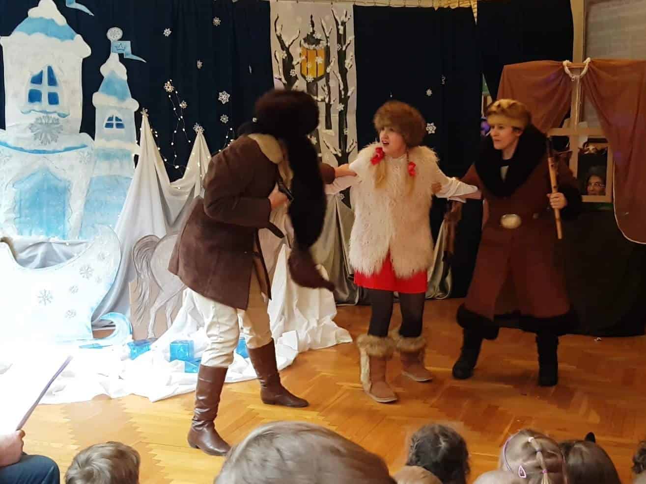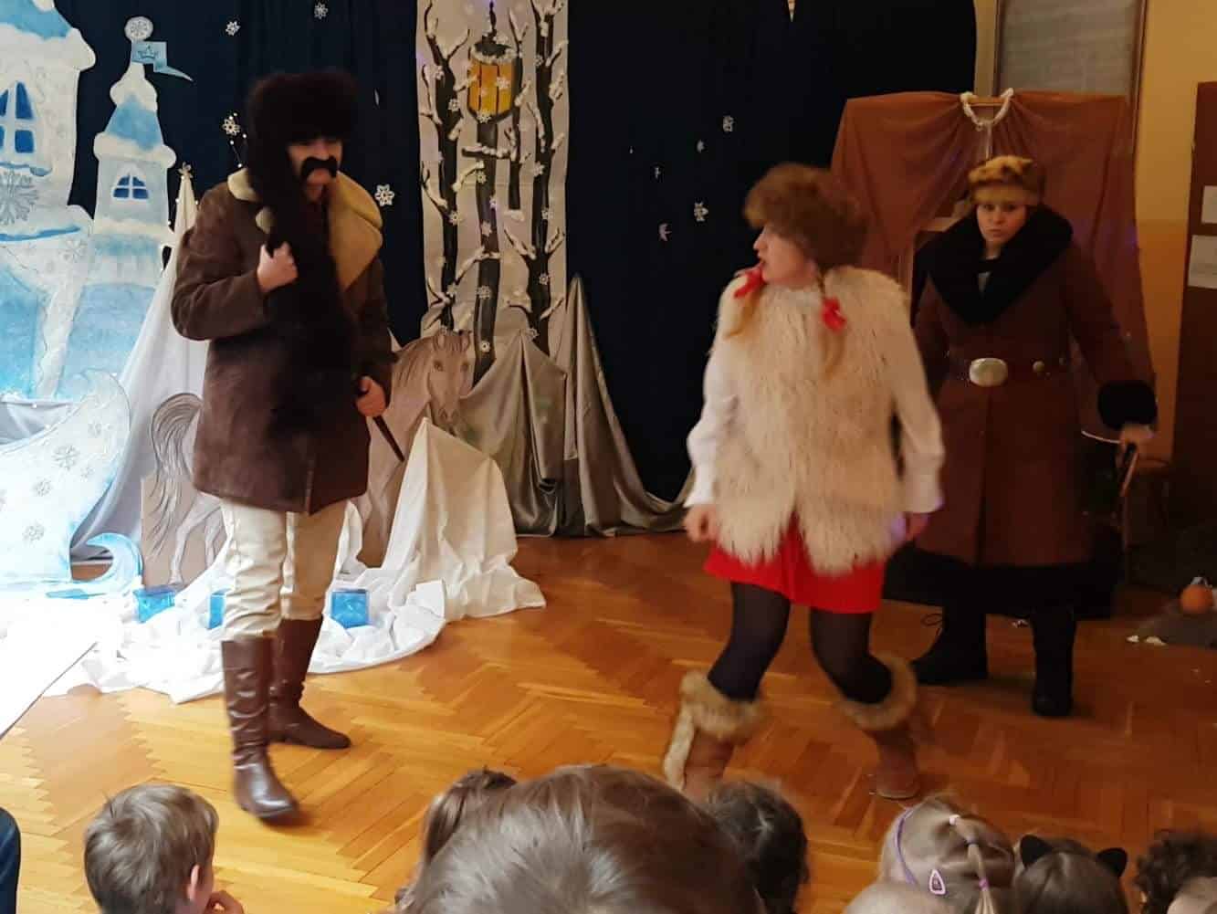 Dziękujemy aktorom, naszym wspaniałym Rodzicom za pomoc, zaangażowanie, przygotowanie strojów, rekwizytów i pięknej scenografii. Tutaj szczególne podziękowania składamy na ręce p. Marty Mątkowskiej i p. Małgorzaty Warzochy. Dekoracje w Waszym wykonaniu to po prostu mistrzostwo 🙂 Ponieważ mieliśmy braki w obsadzie, a zwłaszcza brakowało nam panów – p. Artur stanął na wysokości zadania i wcielił się w podwójną rolę Mikołaja i Renifera, za co bardzo dziękujemy. Dodatkowe podziękowania należą się p. Basi, która w ostatniej chwili zastąpiła naszą koleżankę i uratowała zaistniałą sytuację.