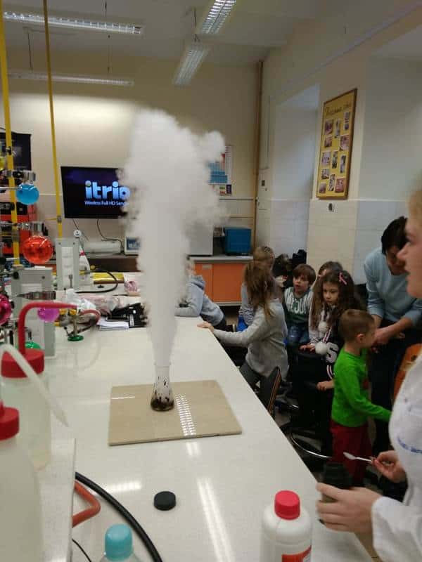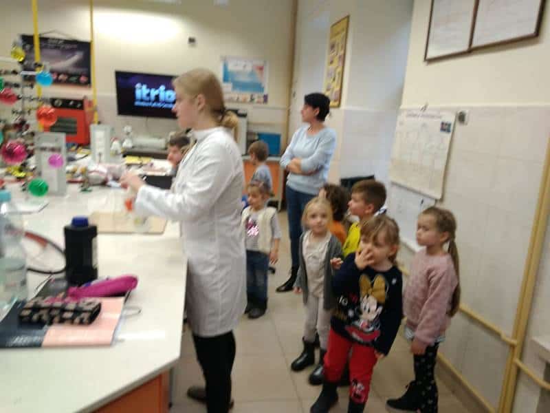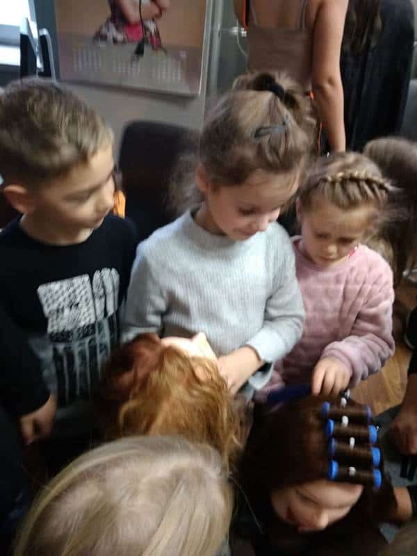Po zakończonych warsztatach mogliśmy zwiedzić szkołę. W pracowni chemicznej obserwowaliśmy doświadczenia z wykorzystaniem różnych substancji i związków, a w pracowni fryzjerskiej zajęcia związane z projektowaniem i wykonaniem fryzur. Udało nam się zaprosić ekipę fryzjerską na przeprowadzenie warsztatów w naszym przedszkolu.
