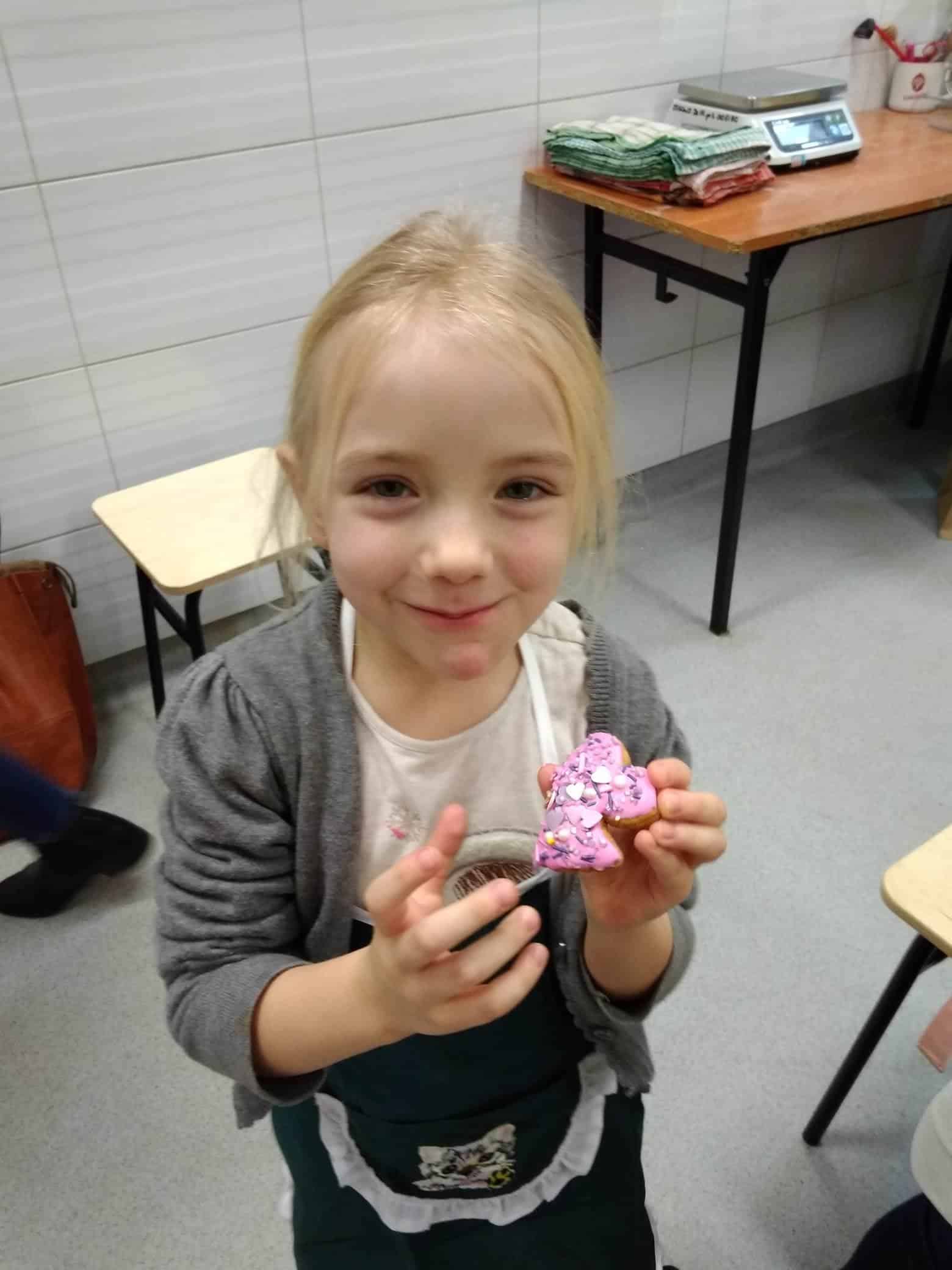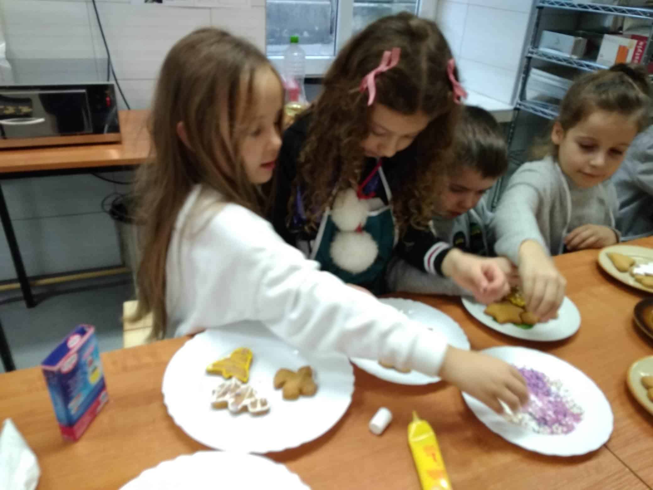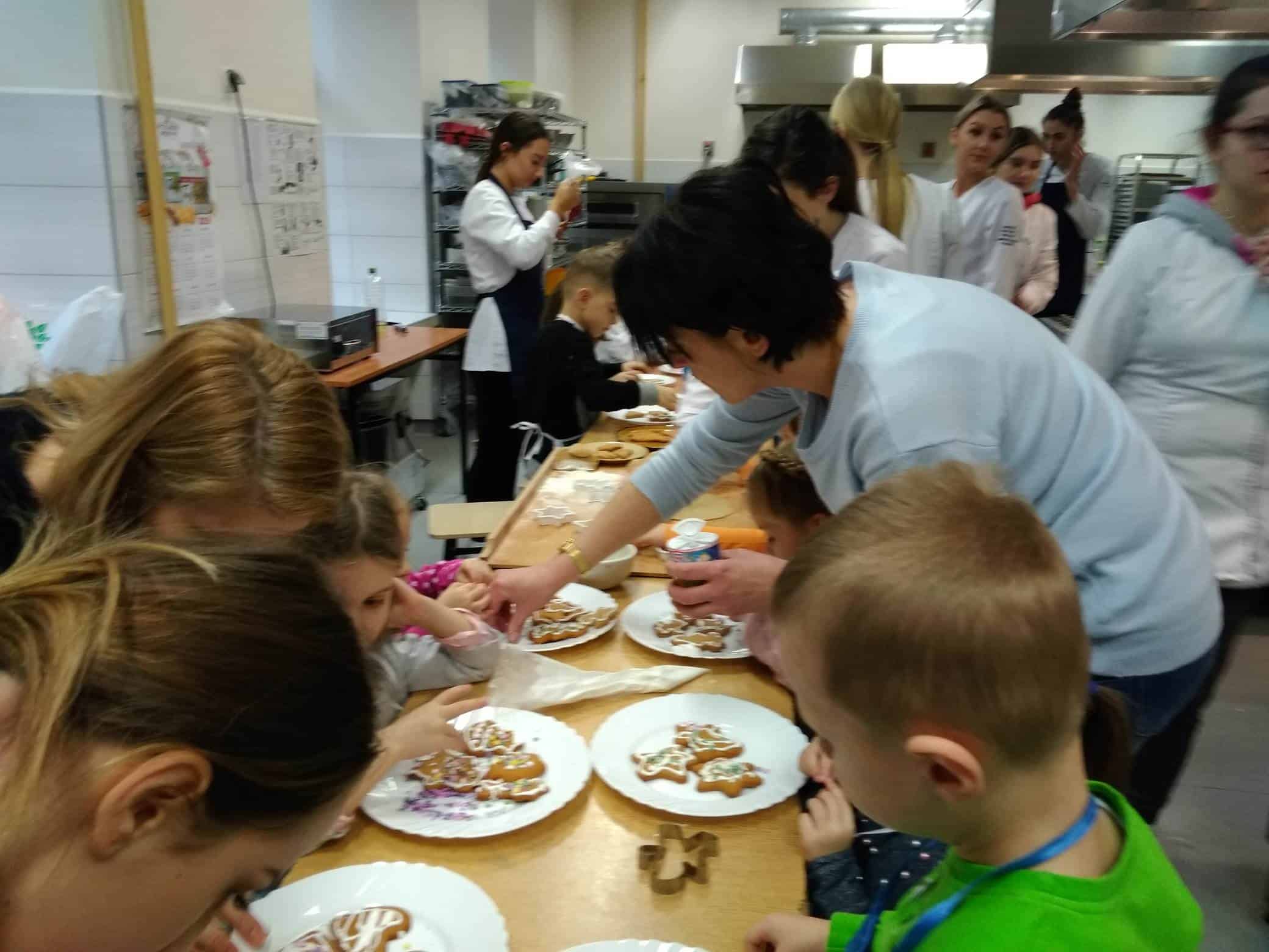 W pracowni czekała już Pani dyrektor Urszula Machaj, oraz uczniowie, którzy zaopiekowali się naszymi małymi kuchcikami. Oczywiście przeszliśmy szybki kurs bezpiecznego korzystania z urządzeń kuchennych i odpowiedniego zachowania w takim pomieszczeniu. Dzieci aktywnie uczestniczyły we wszystkich etapach pieczenia: wyrabianie ciasta, wałkowanie, wykrawanie ciastek, układanie na blasze, pieczenie, lukrowanie, ozdabianie, no i wreszcie jedzenie. Pierniczki rozpływały się w ustach. Dowiedzieliśmy się, że ciasto na takie pierniczki musi dwa tygodnie leżakować, aby ciasteczka były miękkie i kruche jednocześnie.