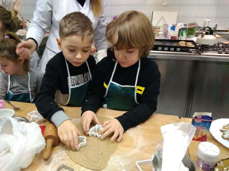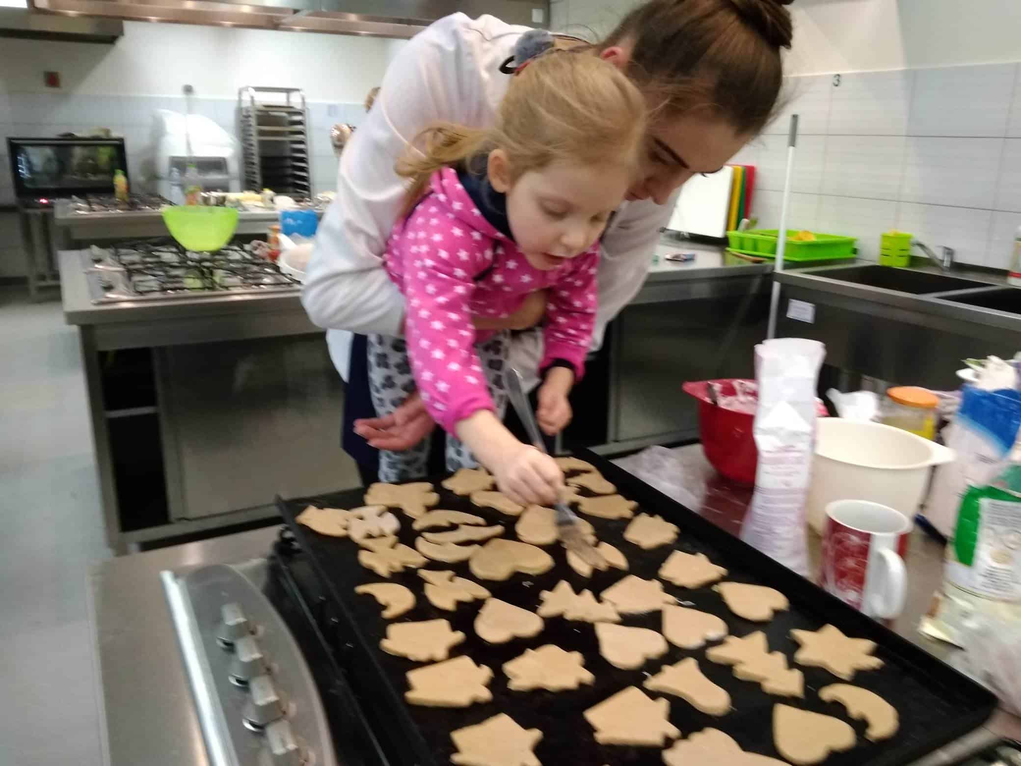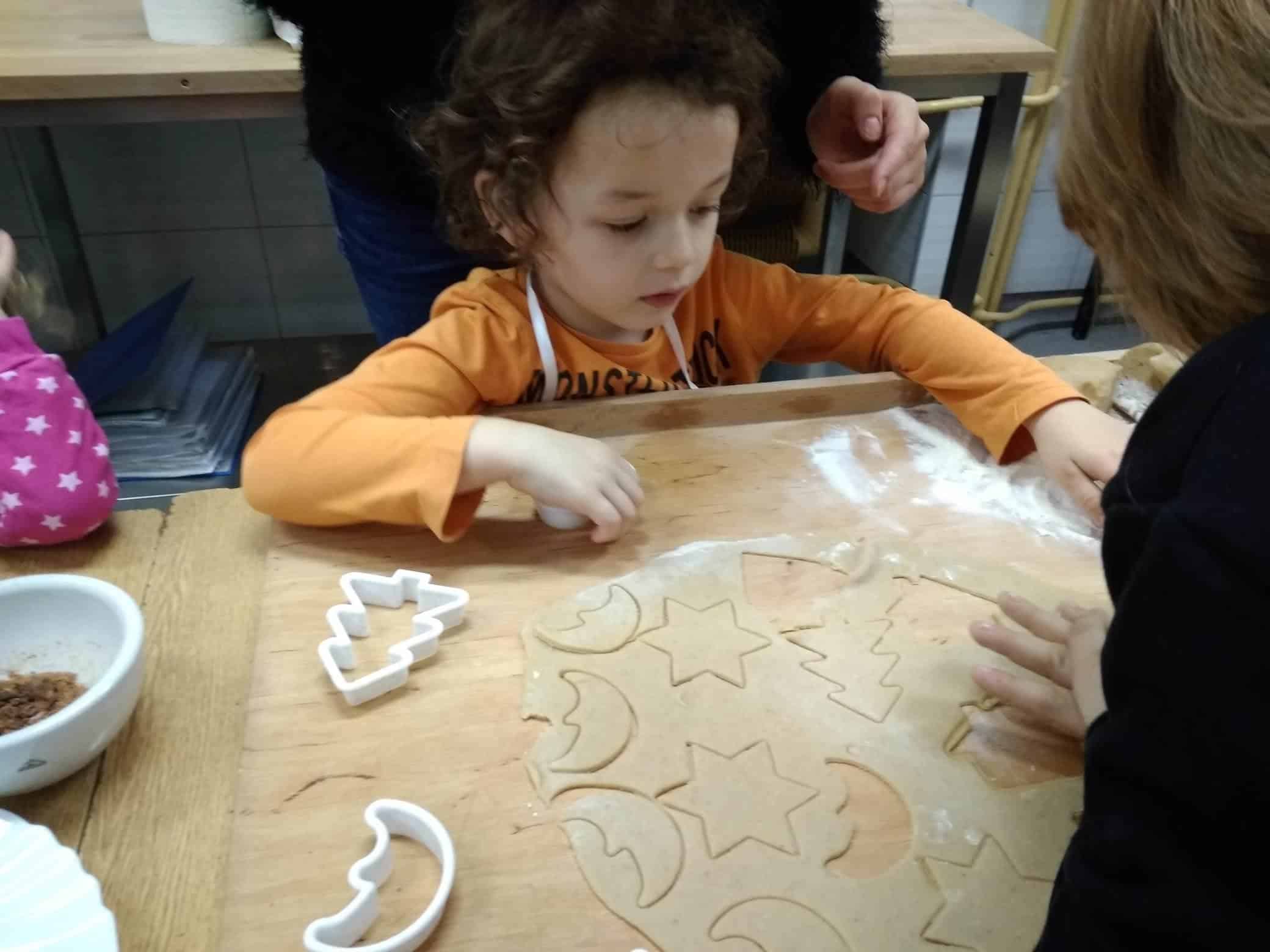 W pracowni czekała już Pani dyrektor Urszula Machaj, oraz uczniowie, którzy zaopiekowali się naszymi małymi kuchcikami. Oczywiście przeszliśmy szybki kurs bezpiecznego korzystania z urządzeń kuchennych i odpowiedniego zachowania w takim pomieszczeniu. Dzieci aktywnie uczestniczyły we wszystkich etapach pieczenia: wyrabianie ciasta, wałkowanie, wykrawanie ciastek, układanie na blasze, pieczenie, lukrowanie, ozdabianie, no i wreszcie jedzenie. Pierniczki rozpływały się w ustach. Dowiedzieliśmy się, że ciasto na takie pierniczki musi dwa tygodnie leżakować, aby ciasteczka były miękkie i kruche jednocześnie.