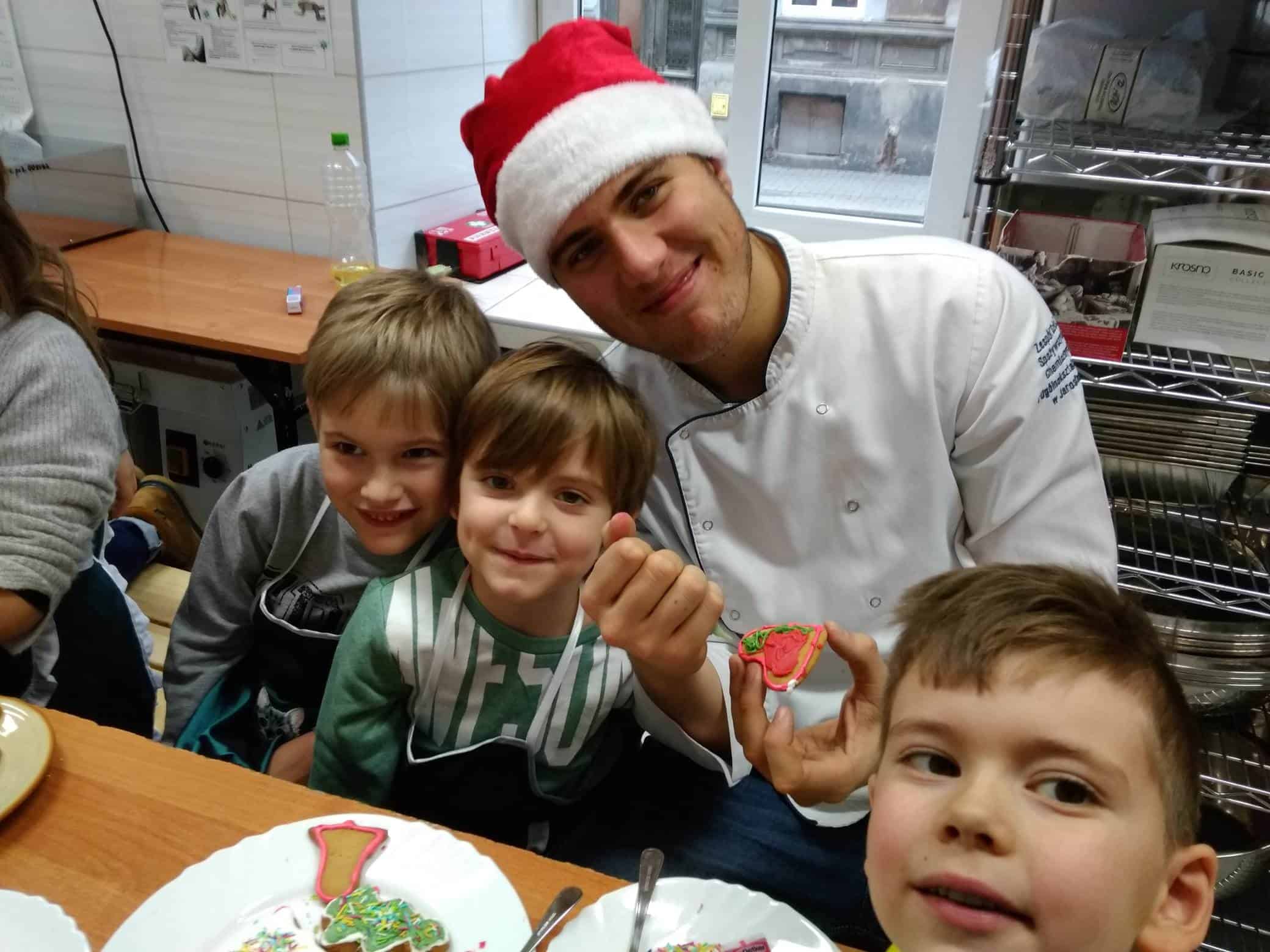 Dzisiaj na zaproszenie mamy Milenki i Elizki uczestniczyliśmy w warsztatach kulinarnych w Zespole Szkół Spożywczych, Chemicznych i Ogólnokształcących w Jarosławiu. Pani Gosia, która jest nauczycielem w tej szkole zaprosiła nas na lekcję pieczenia pierniczków. Zaraz po wejściu do budynku poczuliśmy zapach goździków, cynamonu i wanilii a świąteczny nastrój podkreślały dźwięki śpiewanych kolęd. Okazało się, że w szkole odbywa się kiermasz świątecznych smakołyków; różnorodnych ciast, pierogów, uszek, krokietów.