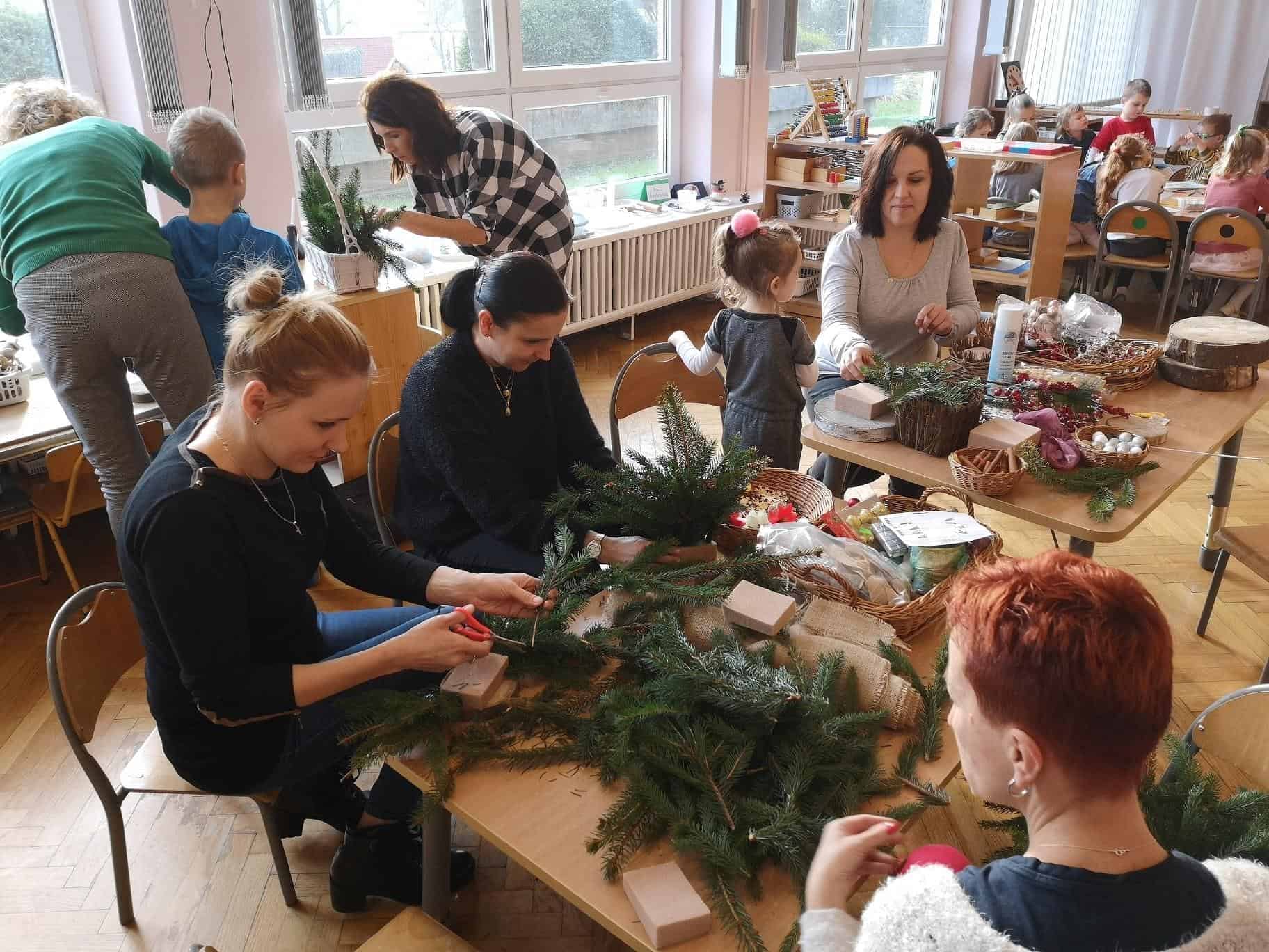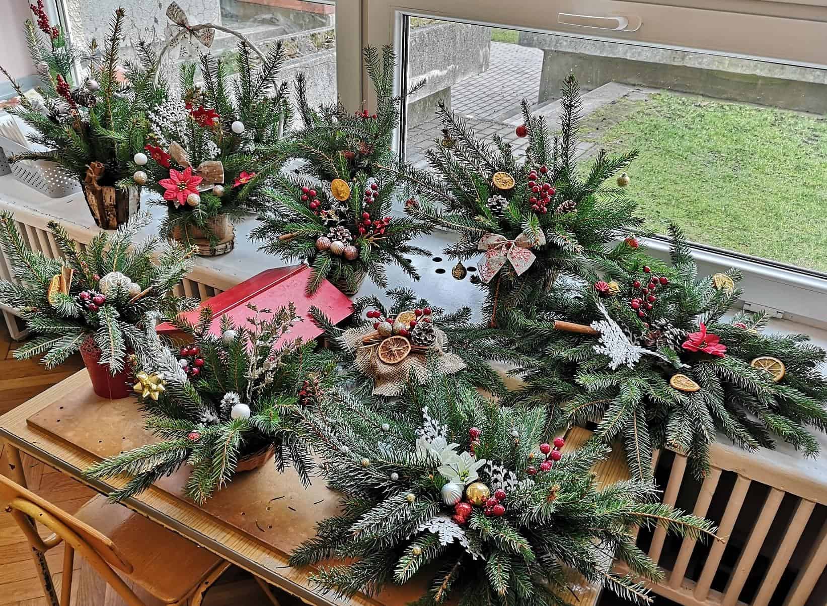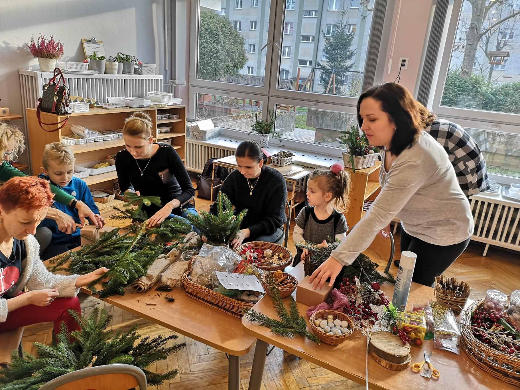 - Na pierwszym stanowisku powstawały świąteczne stroiki. Na stołach pojawiły się pachnące gałązki świerku i jodły oraz inne potrzebne materiały dekoracyjne: bombki, wstążki, kokardki, szyszki, świeczki, suszone pomarańcze, laski cynamonu, sztuczne gałązki żurawiny, głogu, itp.