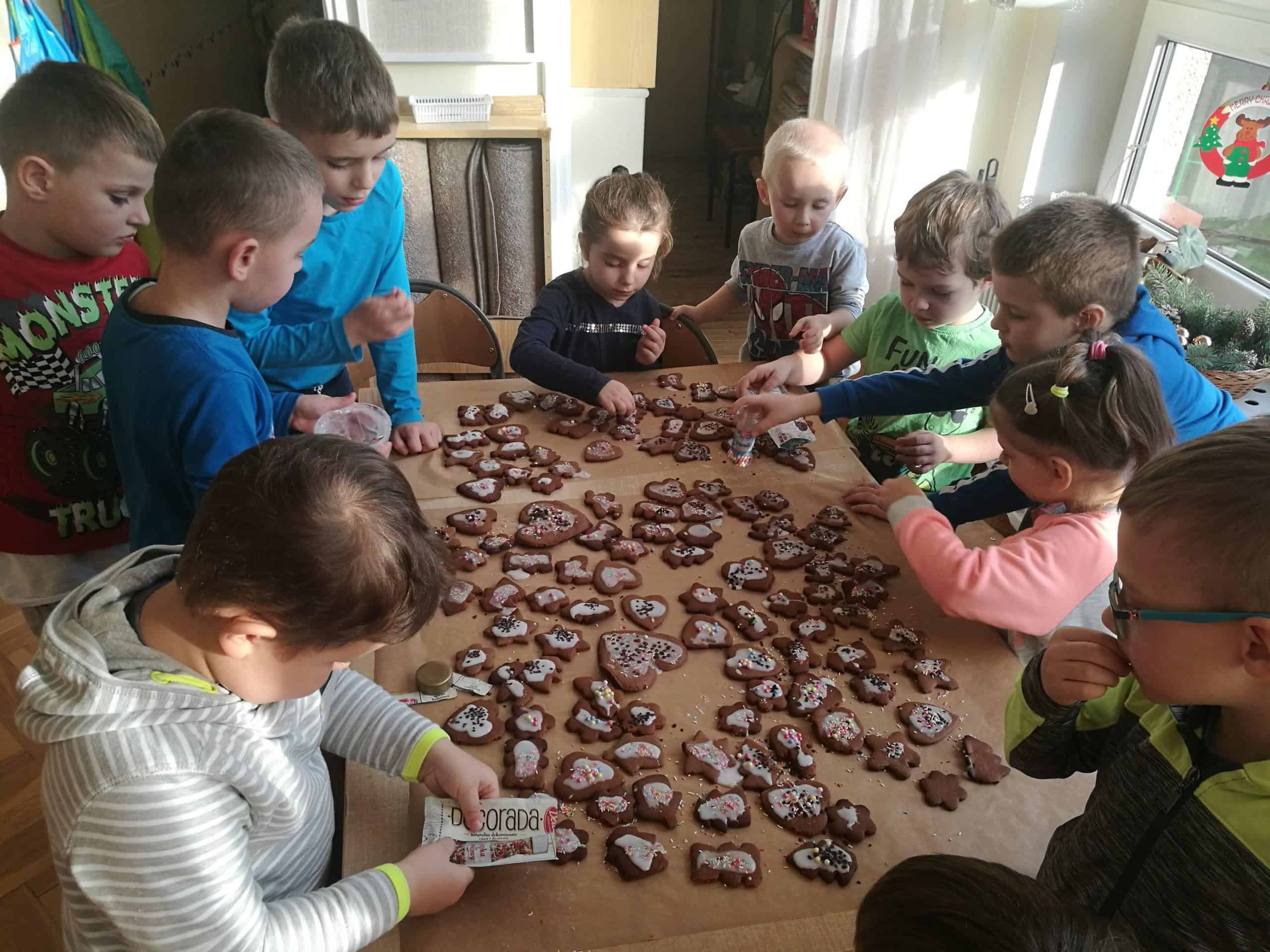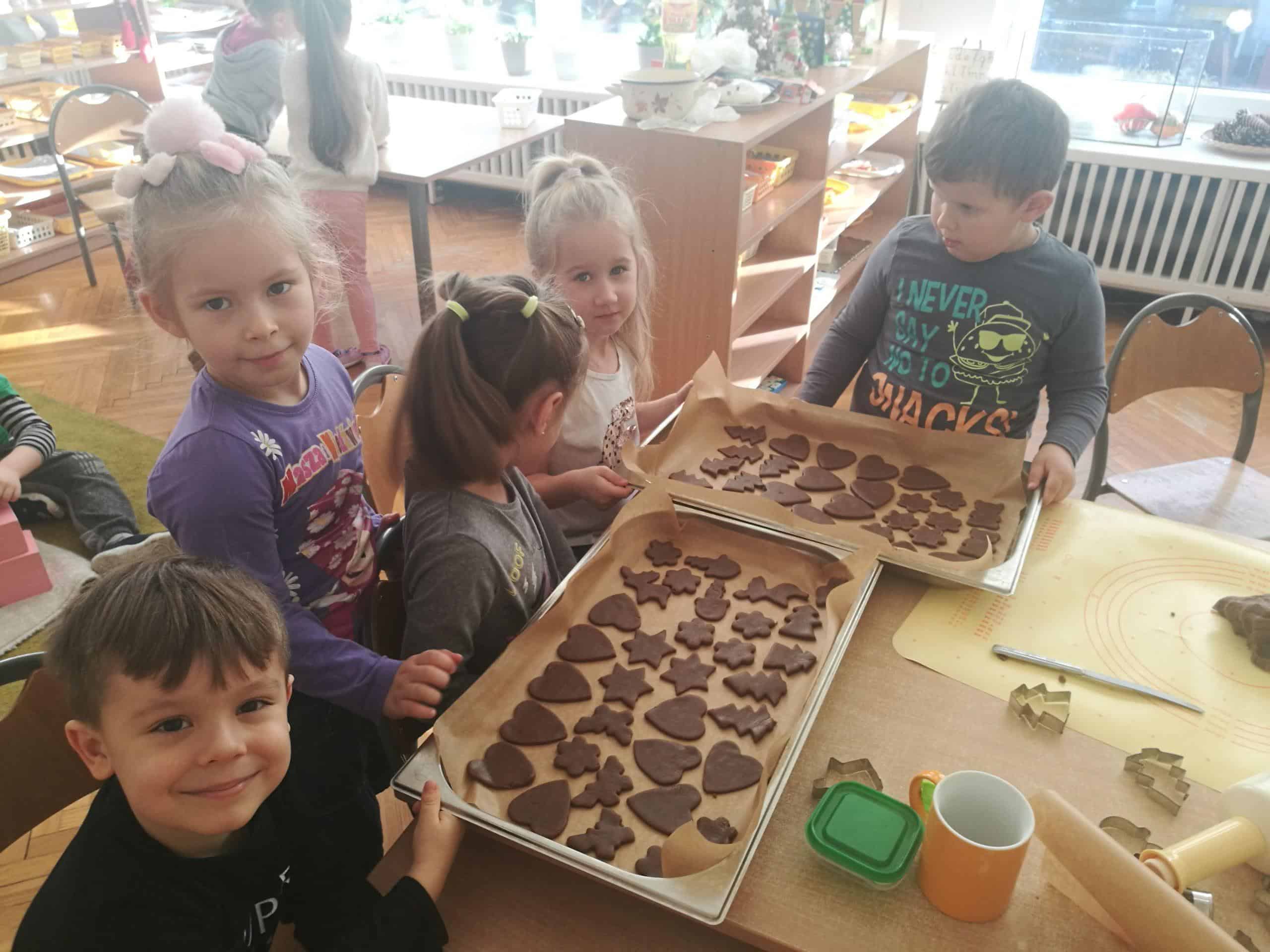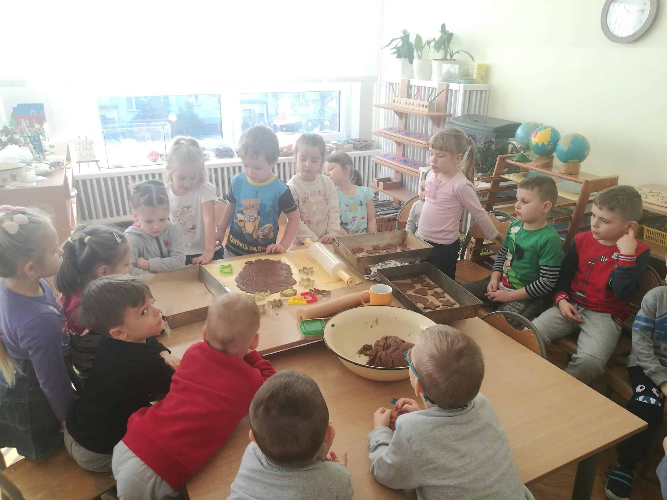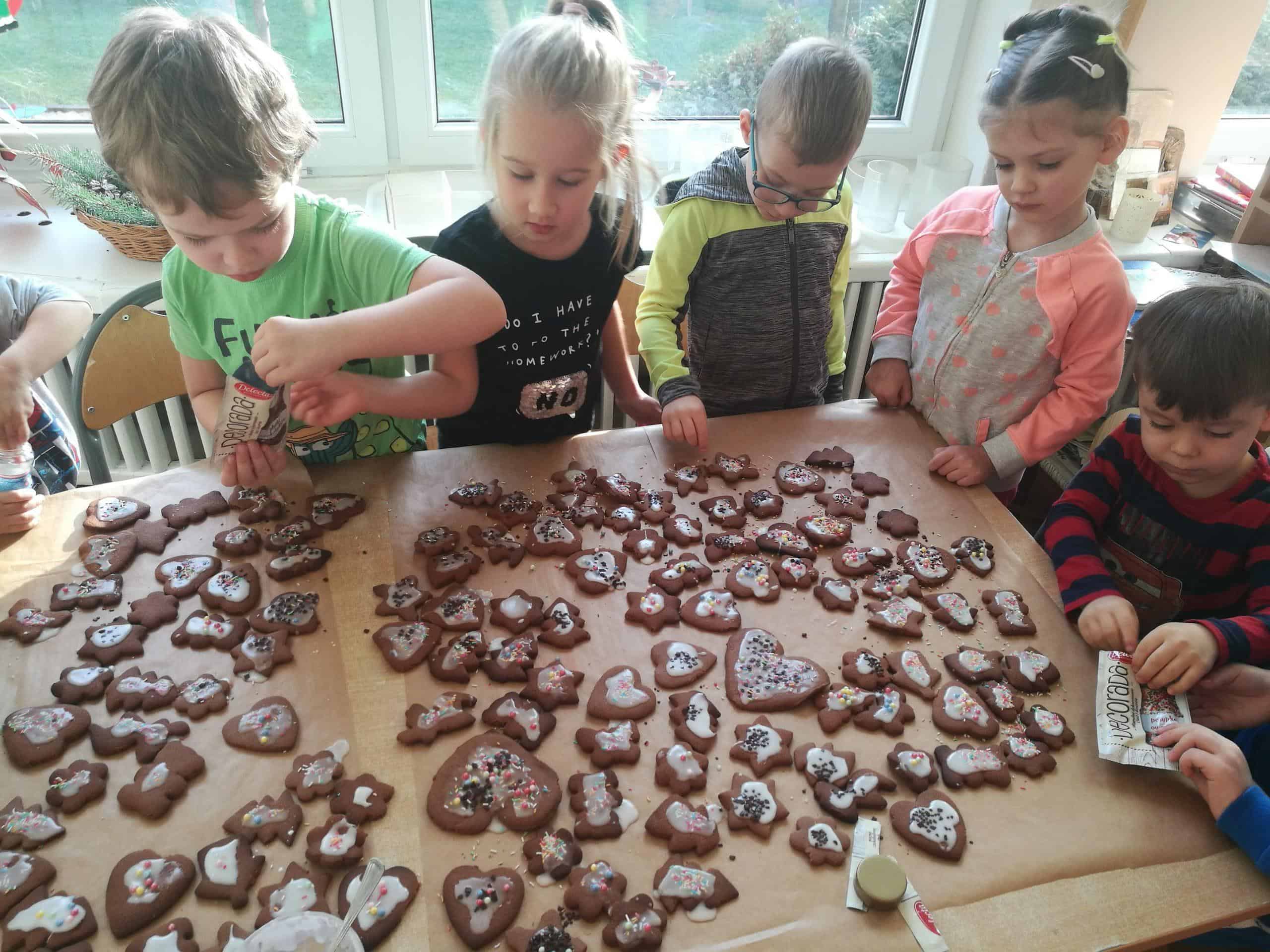 W ostatnich dniach w naszej grupie unosił się zapach korzennych przypraw, ponieważ piekliśmy świąteczne pierniczki. Jak powiedziała Maria Montessori: “Dzieci uczą się wszystkiego, co dzieje się w ich otoczeniu”. Dlatego też, wspólnie przygotowaliśmy ciasto według przepisu dodając niezbędne składniki, następnie dzieci zagniatały i wałkowały ciasto, co okazało się wcale nie łatwym zadaniem. Najbardziej wszystkim podobało się wykrawanie świątecznych kształtów – serduszek, choinek, gwiazdek,bałwanków, domków, motylków, misiów, reniferów – przy pomocy foremek i układaliśmy je na blaszce. Następnie tak przygotowane pierniczki zostały zaniesione do przedszkolnej kuchni i włożone do piekarnika gdzie pod czujnym okiem pań zostały upieczone. A my w naszej sali poczuliśmy piękny unoszący się korzenny zapach, który sprawił, iż cudowny świąteczny nastrój zapanował dookoła. Gdy pierniczki były już gotowe następnego dnia dzieci przystąpiły do ich dekorowania lukrem i barwnymi posypkami. Oczywiście trudno się było oprzeć kolorowym cukiereczkom i słodkiemu lukrowi i nie skosztować choćby odrobinki. Piękne, kolorowe smaczne, lukrowe pierniczki zostaną złożone jako dary dla dzieciątka Jezus podczas uroczystej Wigilii w przedszkolu . Nie zabraknie również ich na naszym stole wigilijnym i w tym uroczystym dla Wszystkich dniu będziemy mogli rozkoszować się ich wspaniałym smakiem.
