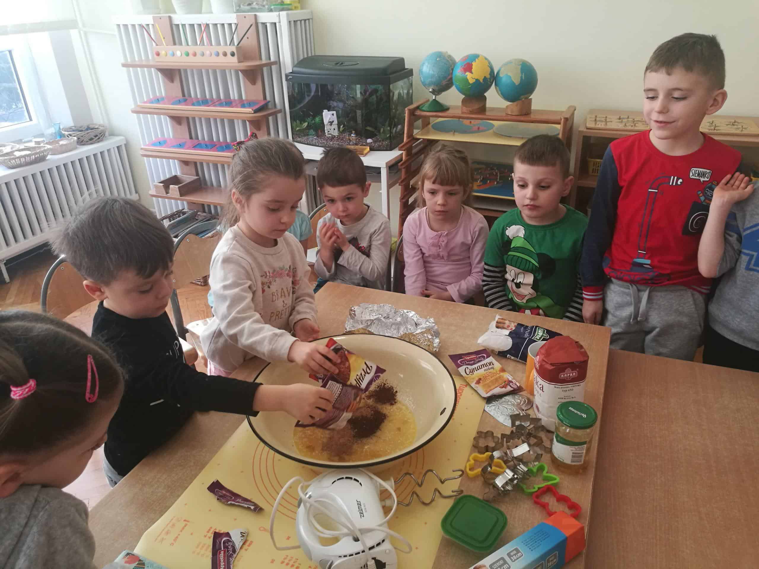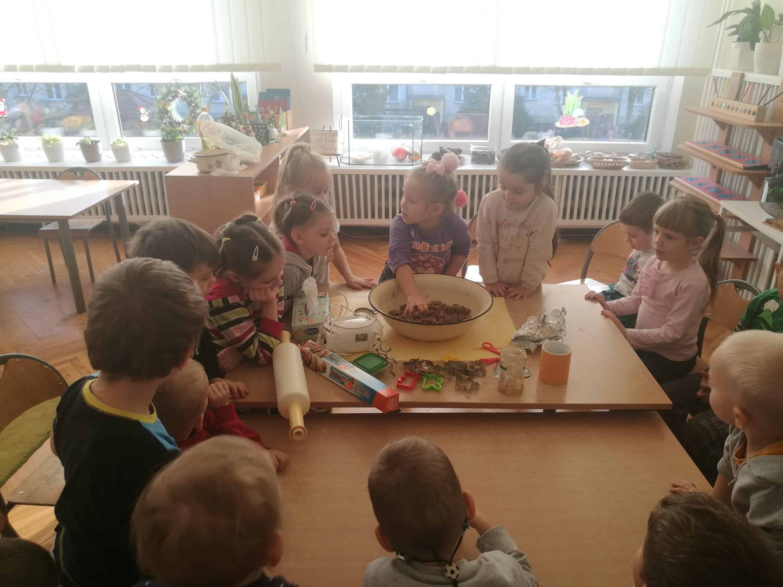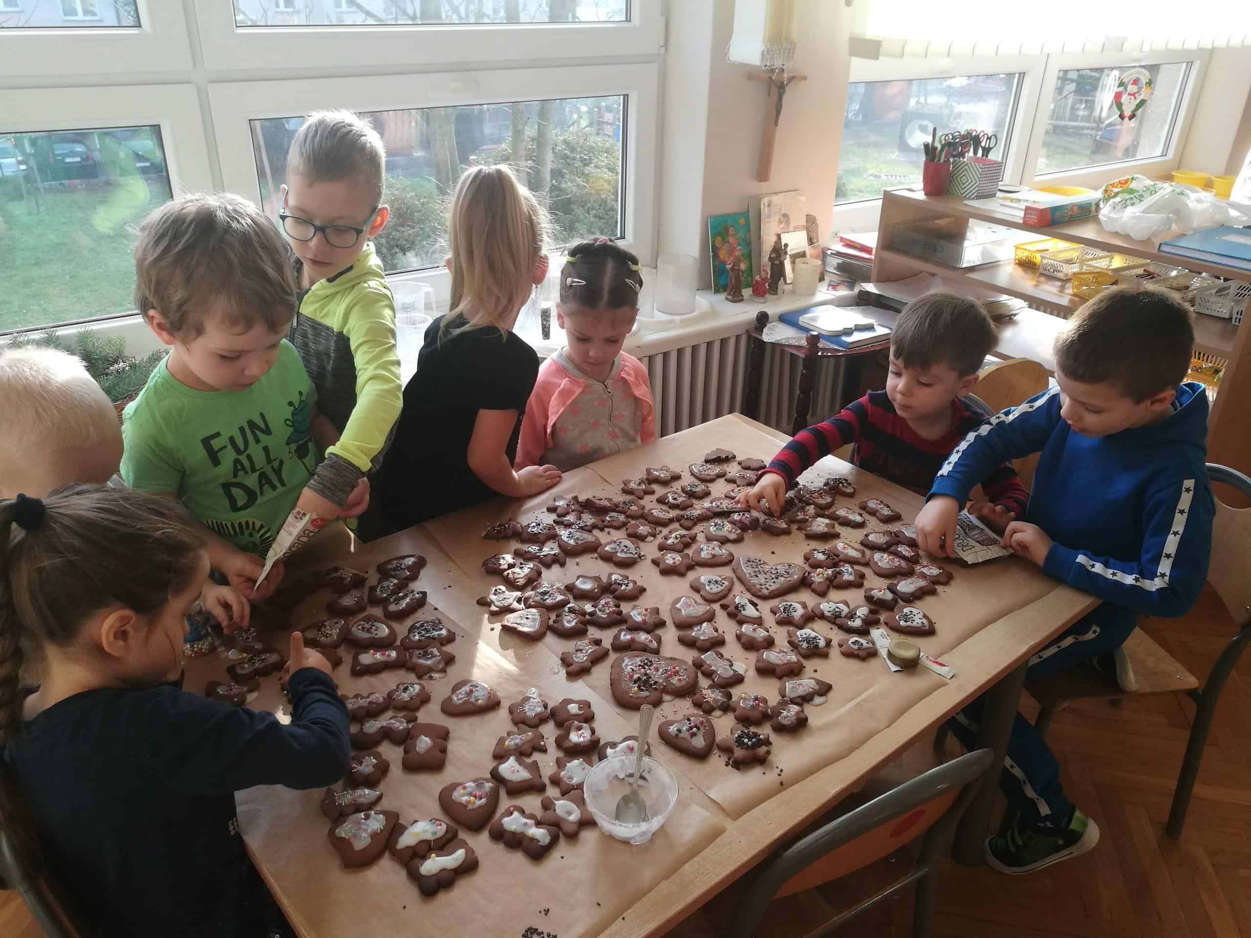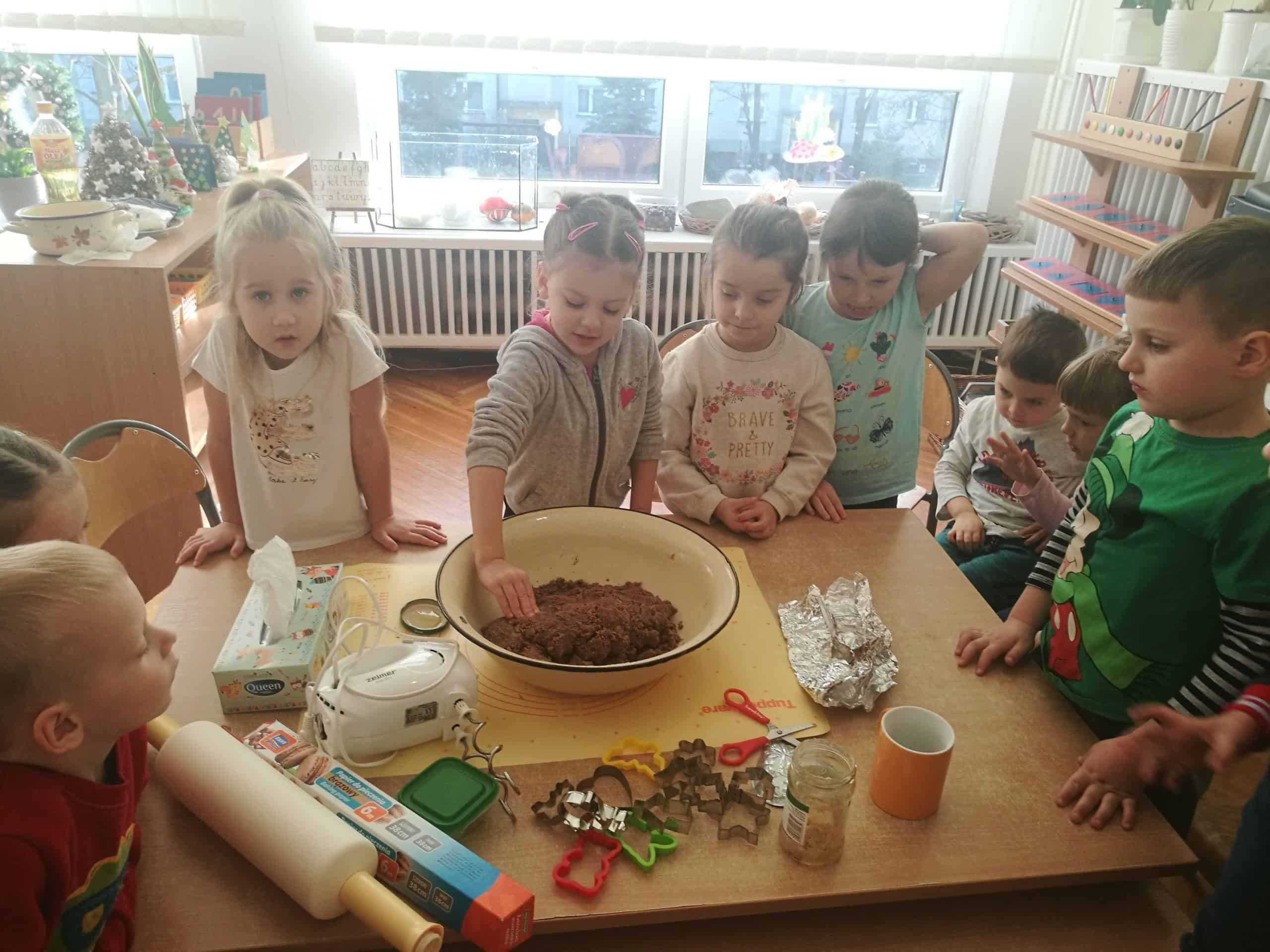 W ostatnich dniach w naszej grupie unosił się zapach korzennych przypraw, ponieważ piekliśmy świąteczne pierniczki. Jak powiedziała Maria Montessori: “Dzieci uczą się wszystkiego, co dzieje się w ich otoczeniu”. Dlatego też, wspólnie przygotowaliśmy ciasto według przepisu dodając niezbędne składniki, następnie dzieci zagniatały i wałkowały ciasto, co okazało się wcale nie łatwym zadaniem. Najbardziej wszystkim podobało się wykrawanie świątecznych kształtów – serduszek, choinek, gwiazdek,bałwanków, domków, motylków, misiów, reniferów – przy pomocy foremek i układaliśmy je na blaszce. Następnie tak przygotowane pierniczki zostały zaniesione do przedszkolnej kuchni i włożone do piekarnika gdzie pod czujnym okiem pań zostały upieczone. A my w naszej sali poczuliśmy piękny unoszący się korzenny zapach, który sprawił, iż cudowny świąteczny nastrój zapanował dookoła. Gdy pierniczki były już gotowe następnego dnia dzieci przystąpiły do ich dekorowania lukrem i barwnymi posypkami. Oczywiście trudno się było oprzeć kolorowym cukiereczkom i słodkiemu lukrowi i nie skosztować choćby odrobinki. Piękne, kolorowe smaczne, lukrowe pierniczki zostaną złożone jako dary dla dzieciątka Jezus podczas uroczystej Wigilii w przedszkolu . Nie zabraknie również ich na naszym stole wigilijnym i w tym uroczystym dla Wszystkich dniu będziemy mogli rozkoszować się ich wspaniałym smakiem.