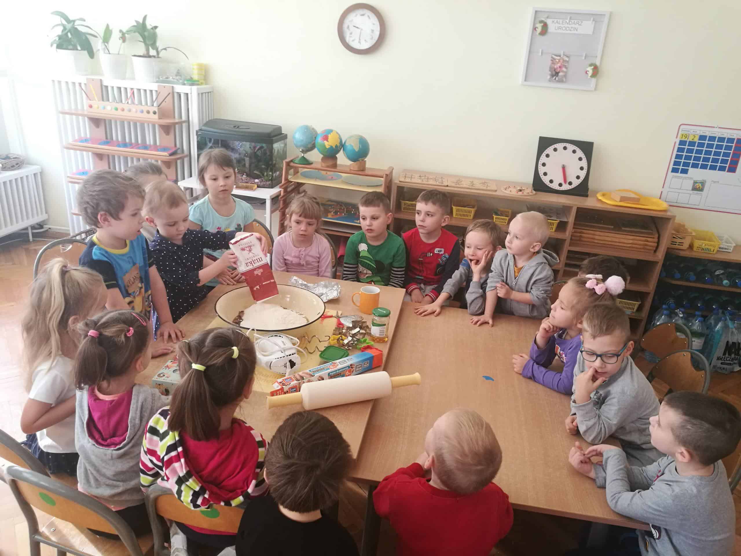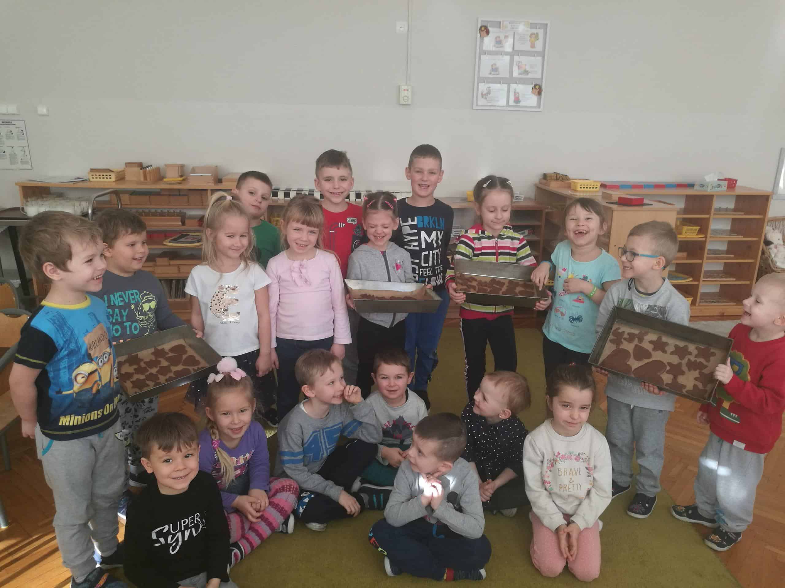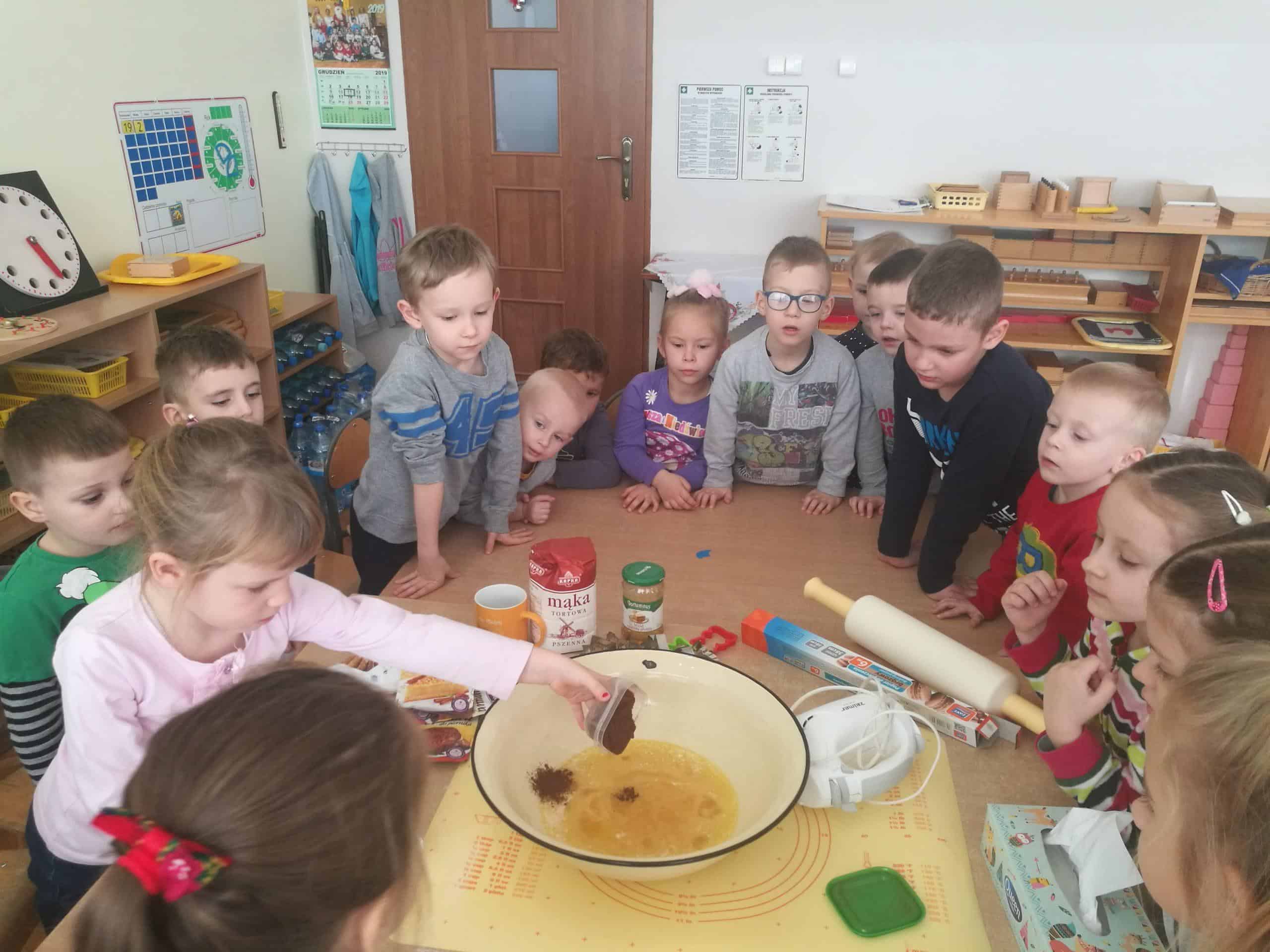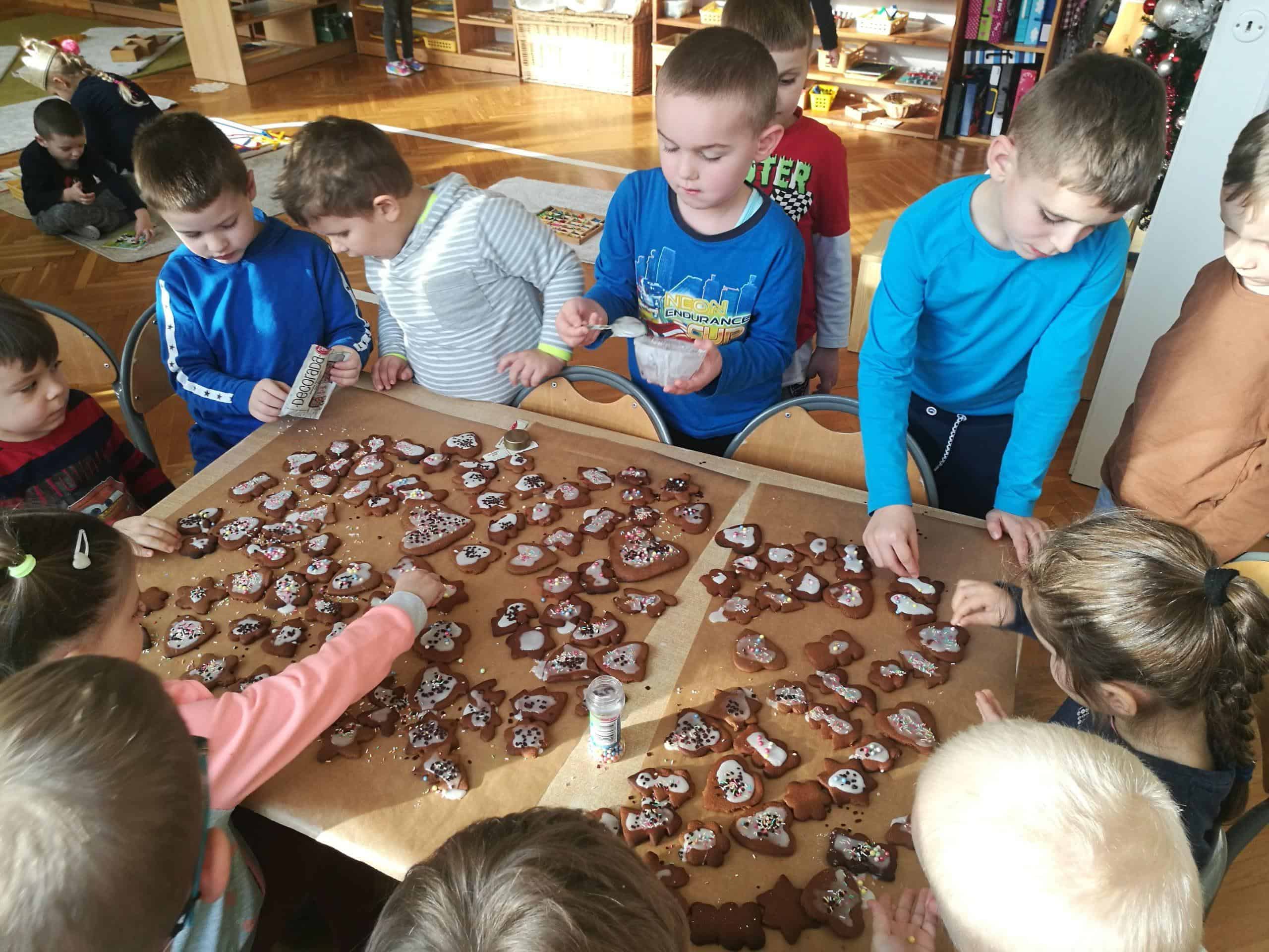 W ostatnich dniach w naszej grupie unosił się zapach korzennych przypraw, ponieważ piekliśmy świąteczne pierniczki. Jak powiedziała Maria Montessori: “Dzieci uczą się wszystkiego, co dzieje się w ich otoczeniu”. Dlatego też, wspólnie przygotowaliśmy ciasto według przepisu dodając niezbędne składniki, następnie dzieci zagniatały i wałkowały ciasto, co okazało się wcale nie łatwym zadaniem. Najbardziej wszystkim podobało się wykrawanie świątecznych kształtów – serduszek, choinek, gwiazdek,bałwanków, domków, motylków, misiów, reniferów – przy pomocy foremek i układaliśmy je na blaszce. Następnie tak przygotowane pierniczki zostały zaniesione do przedszkolnej kuchni i włożone do piekarnika gdzie pod czujnym okiem pań zostały upieczone. A my w naszej sali poczuliśmy piękny unoszący się korzenny zapach, który sprawił, iż cudowny świąteczny nastrój zapanował dookoła. Gdy pierniczki były już gotowe następnego dnia dzieci przystąpiły do ich dekorowania lukrem i barwnymi posypkami. Oczywiście trudno się było oprzeć kolorowym cukiereczkom i słodkiemu lukrowi i nie skosztować choćby odrobinki. Piękne, kolorowe smaczne, lukrowe pierniczki zostaną złożone jako dary dla dzieciątka Jezus podczas uroczystej Wigilii w przedszkolu . Nie zabraknie również ich na naszym stole wigilijnym i w tym uroczystym dla Wszystkich dniu będziemy mogli rozkoszować się ich wspaniałym smakiem.