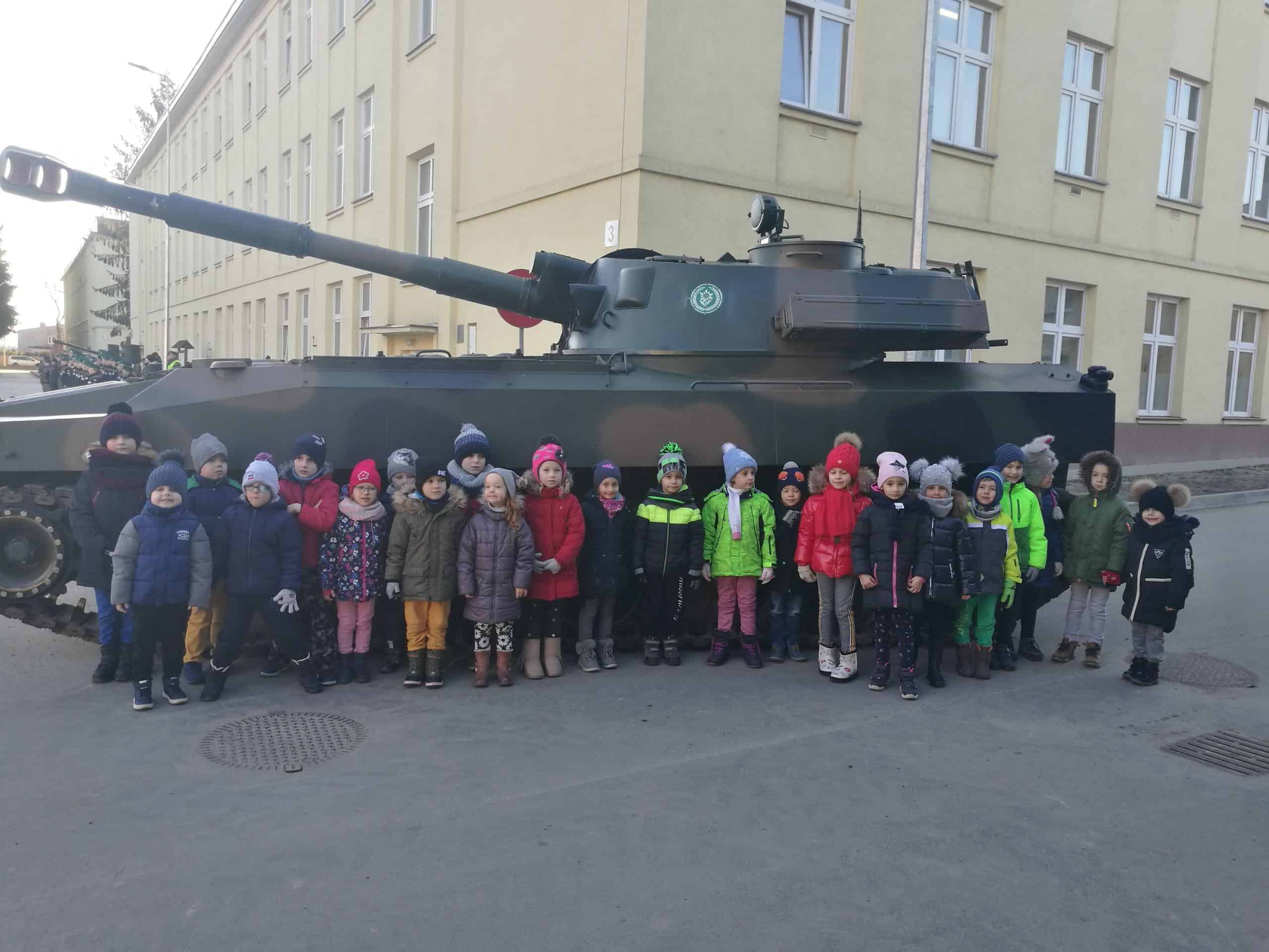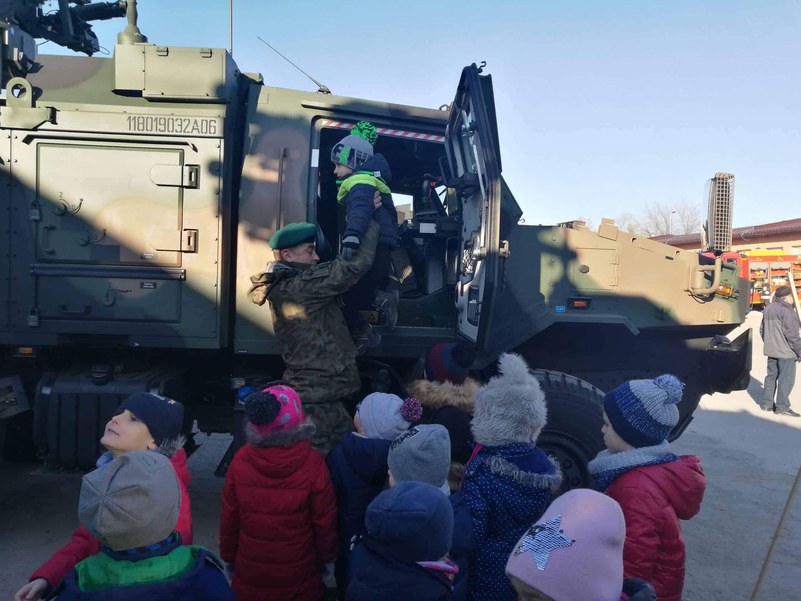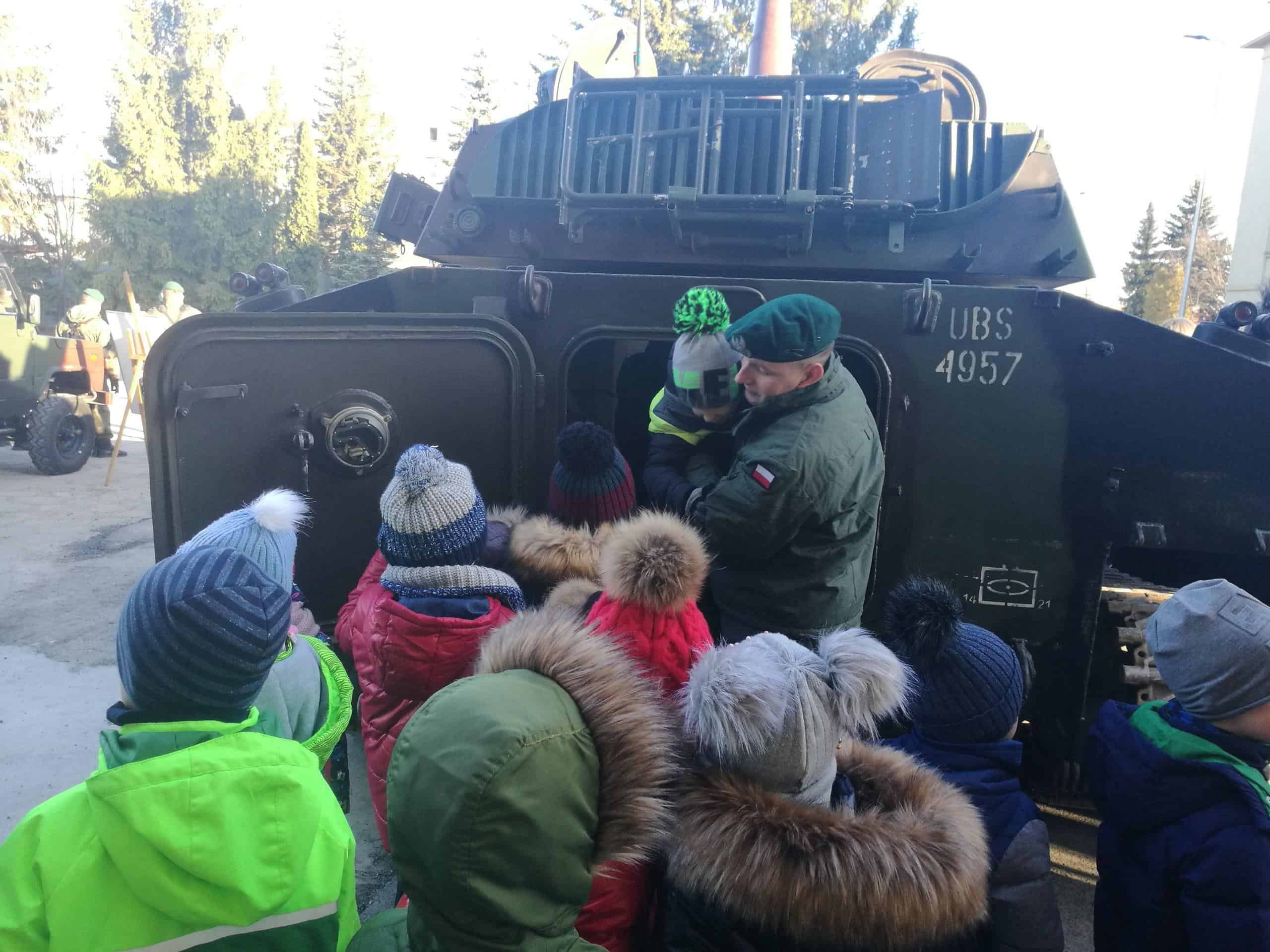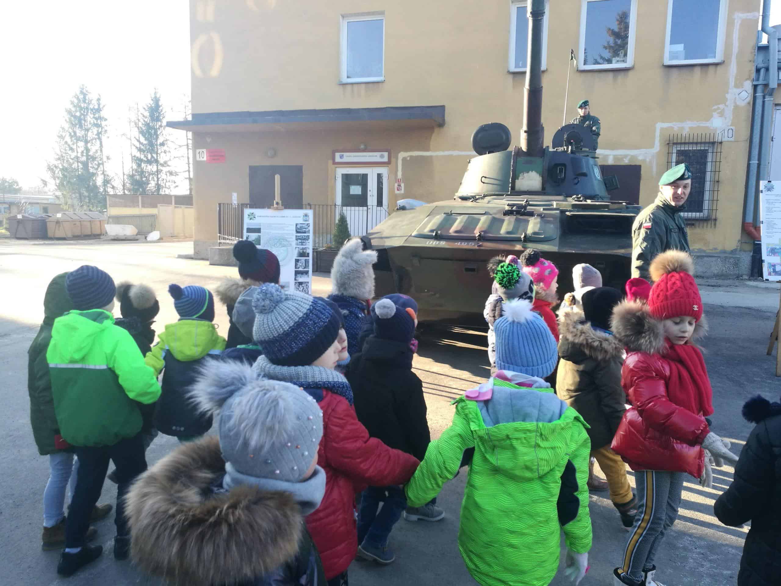 W grudniu starszaki z wszystkich grup przedszkolnych uczestniczyły w organizowanym dla dzieci Dniu Otwartym Koszar w Jednostce Wojskowej w Jarosławiu . Po przybyciu na miejsce dzieci zostały przywitane przez żołnierza. Żołnierze dokonali prezentacji specjalistycznych pojazdów, sprzętu i wyposażenia, a także opowiedzieli o swojej codziennej pracy. Obejrzeliśmy również samochód policyjny, wóz strażacki, pojazdy wojskowe a niecodzienną atrakcją dla dzieci było choć przez moment usiąść za kierownicą. W tym dniu dzieci zastały również ugoszczone wojskową zupą grochową i ciepłą herbatą. Wizyta w Jednostce dostarczyła niezapomnianych wrażeń a także sprawiła, że dzieci wzbogaciły swój zasób wiedzy na temat pracy żołnierzy.