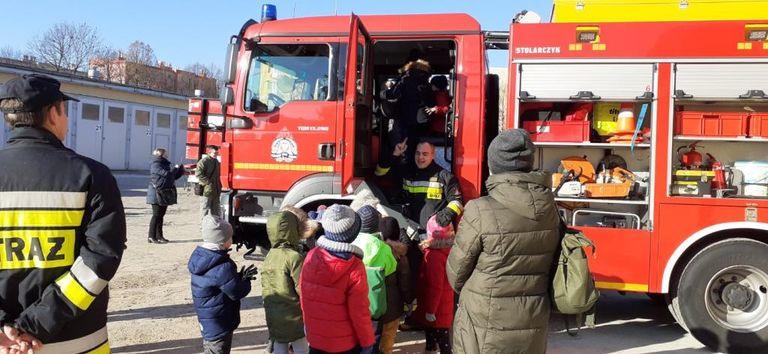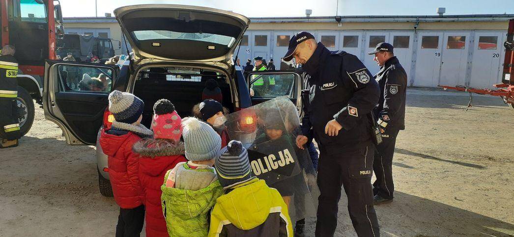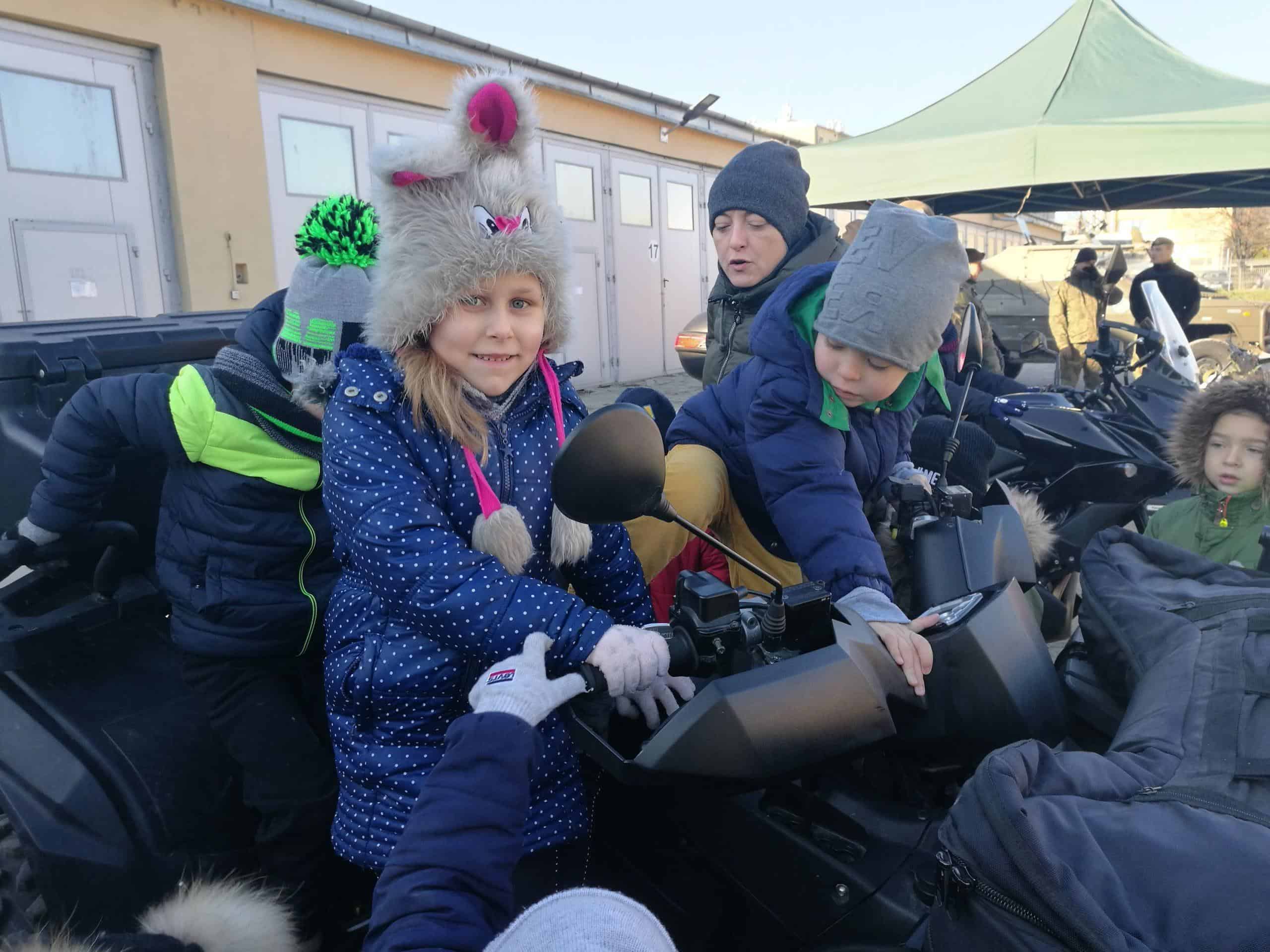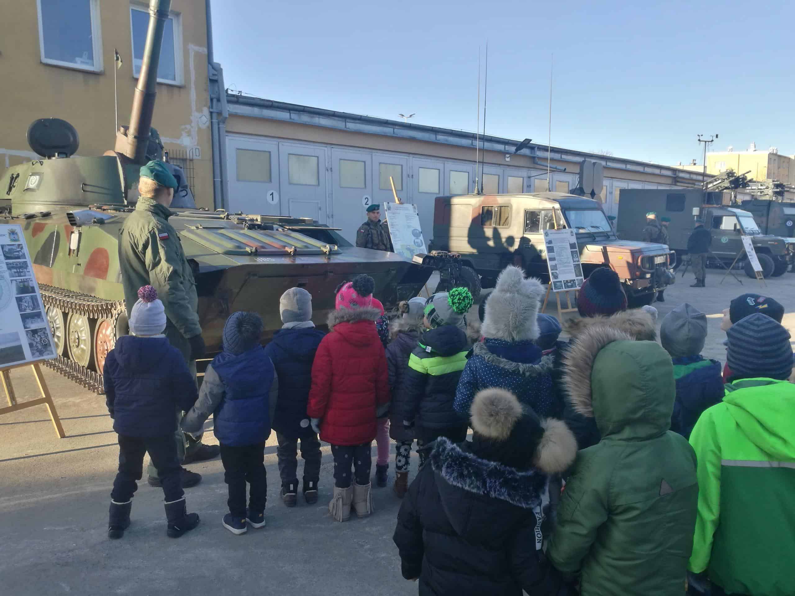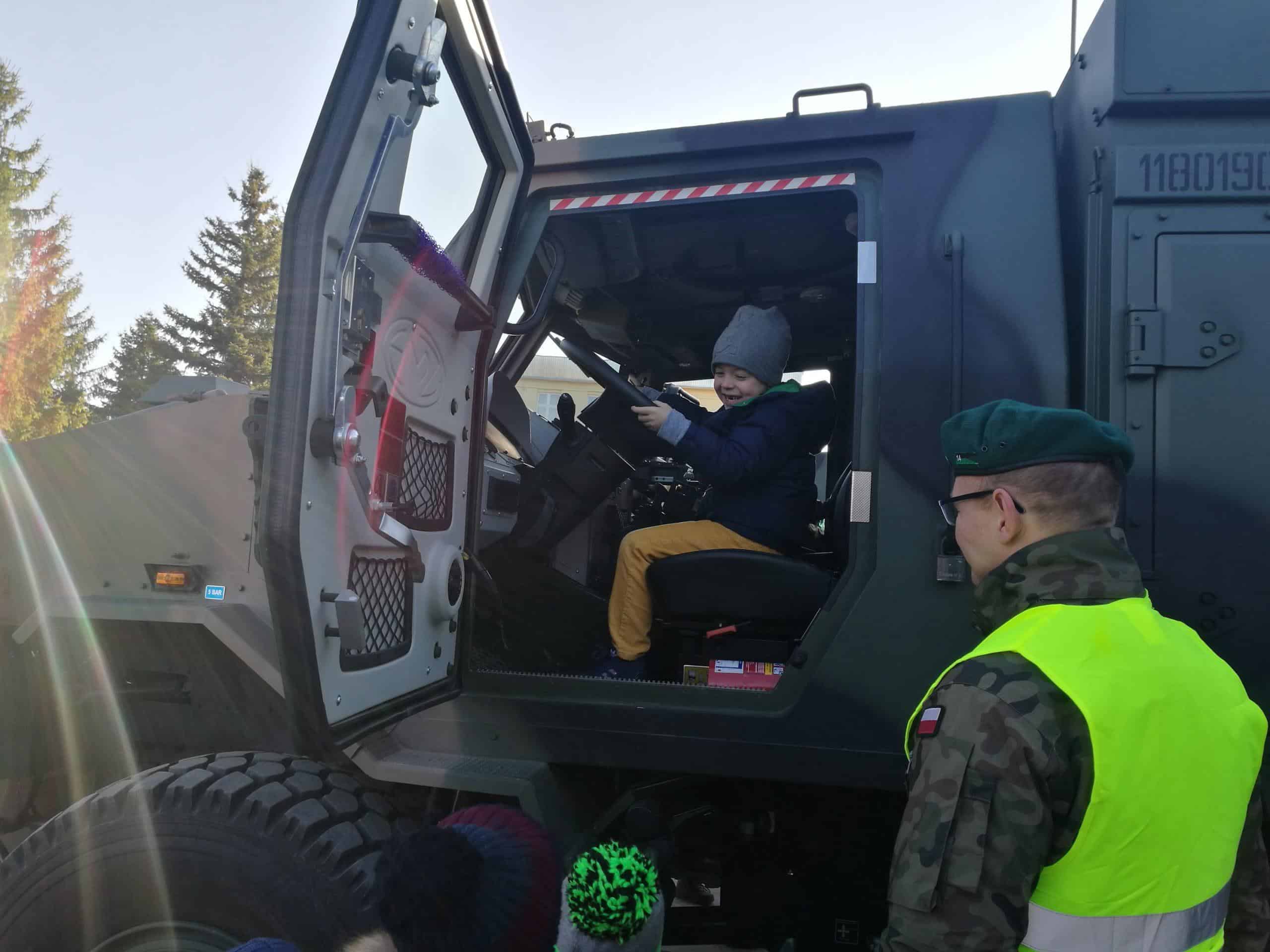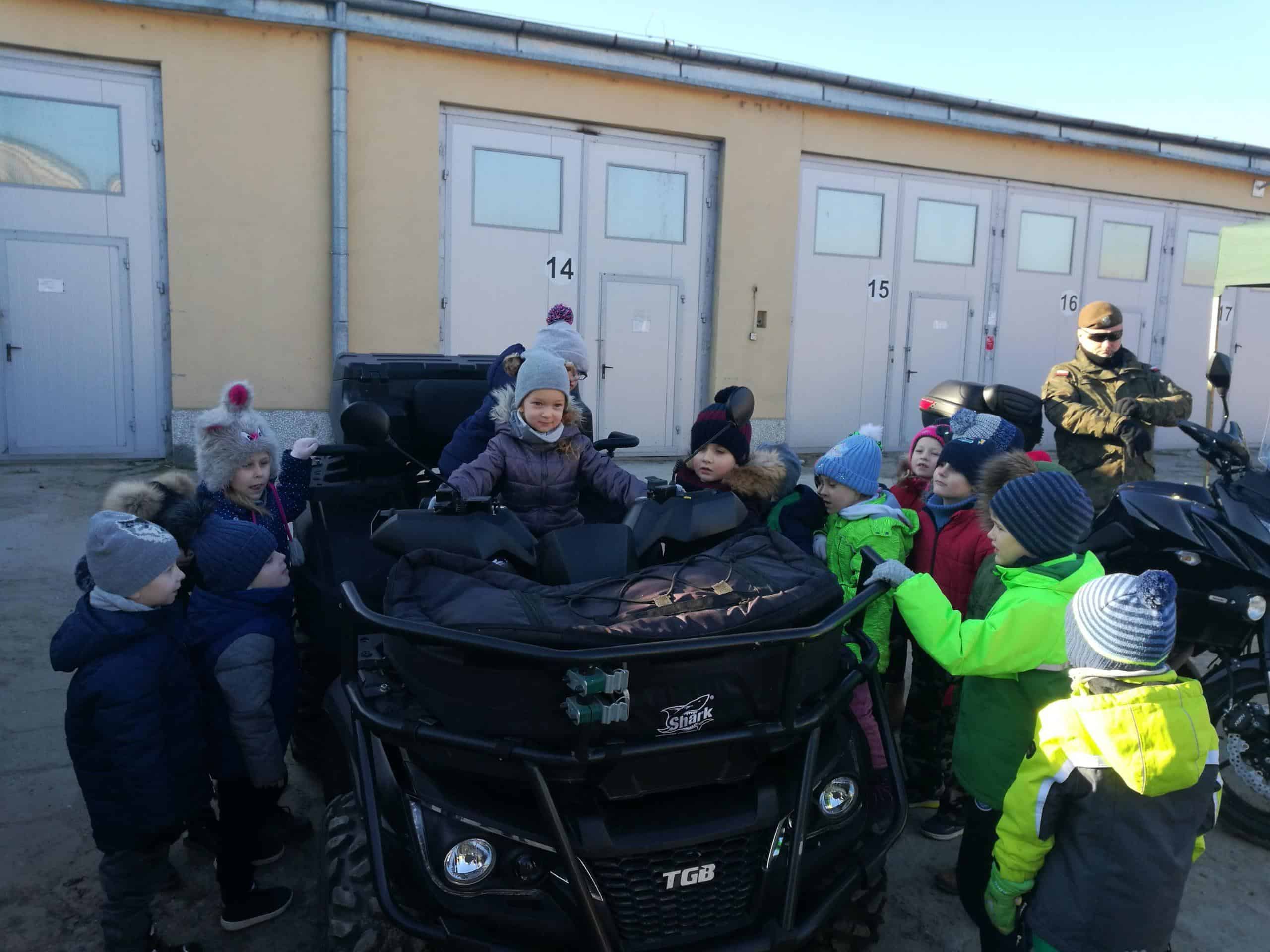 W grudniu starszaki z wszystkich grup przedszkolnych uczestniczyły w organizowanym dla dzieci Dniu Otwartym Koszar w Jednostce Wojskowej w Jarosławiu . Po przybyciu na miejsce dzieci zostały przywitane przez żołnierza. Żołnierze dokonali prezentacji specjalistycznych pojazdów, sprzętu i wyposażenia, a także opowiedzieli o swojej codziennej pracy. Obejrzeliśmy również samochód policyjny, wóz strażacki, pojazdy wojskowe a niecodzienną atrakcją dla dzieci było choć przez moment usiąść za kierownicą. W tym dniu dzieci zastały również ugoszczone wojskową zupą grochową i ciepłą herbatą. Wizyta w Jednostce dostarczyła niezapomnianych wrażeń a także sprawiła, że dzieci wzbogaciły swój zasób wiedzy na temat pracy żołnierzy.