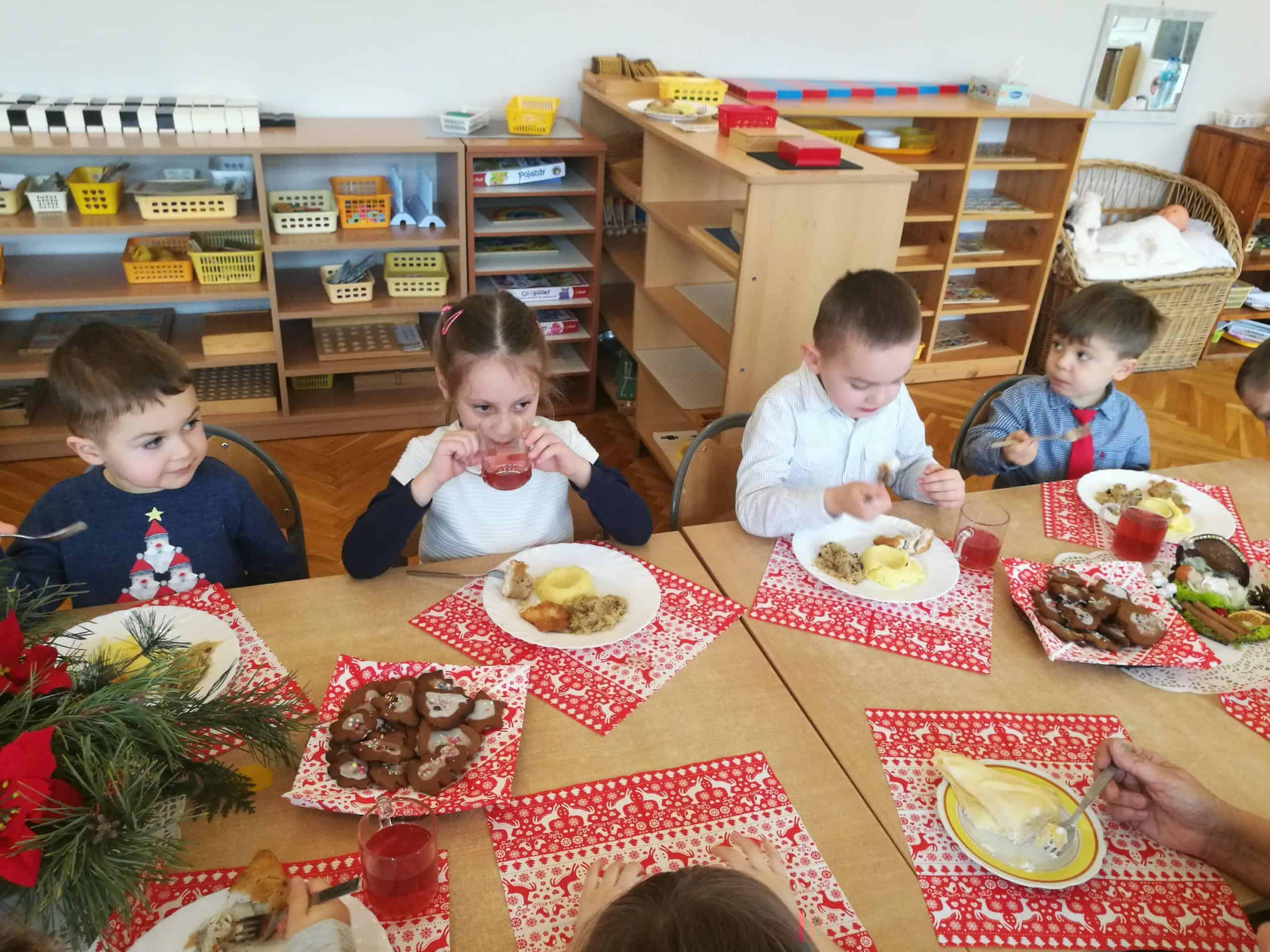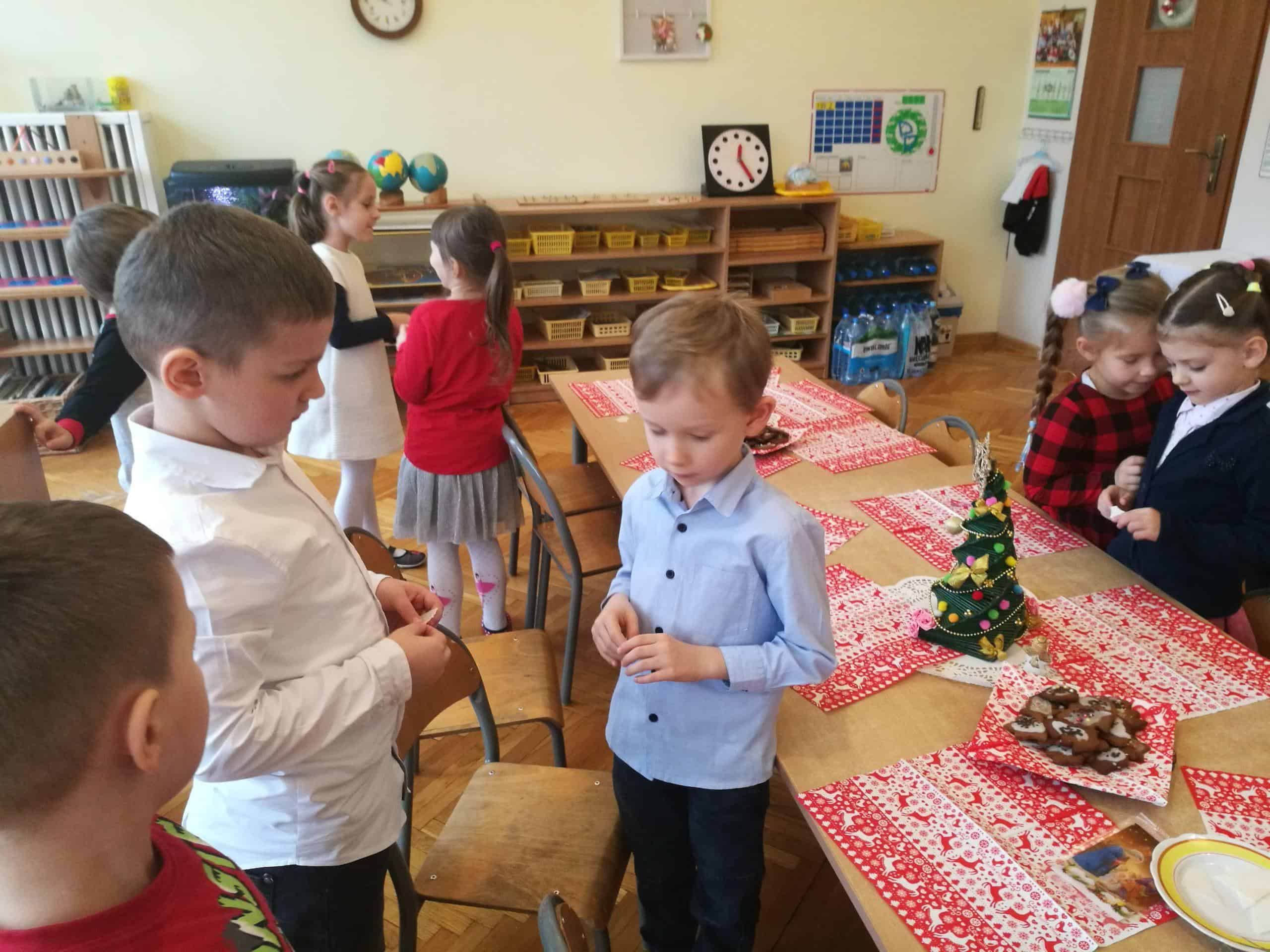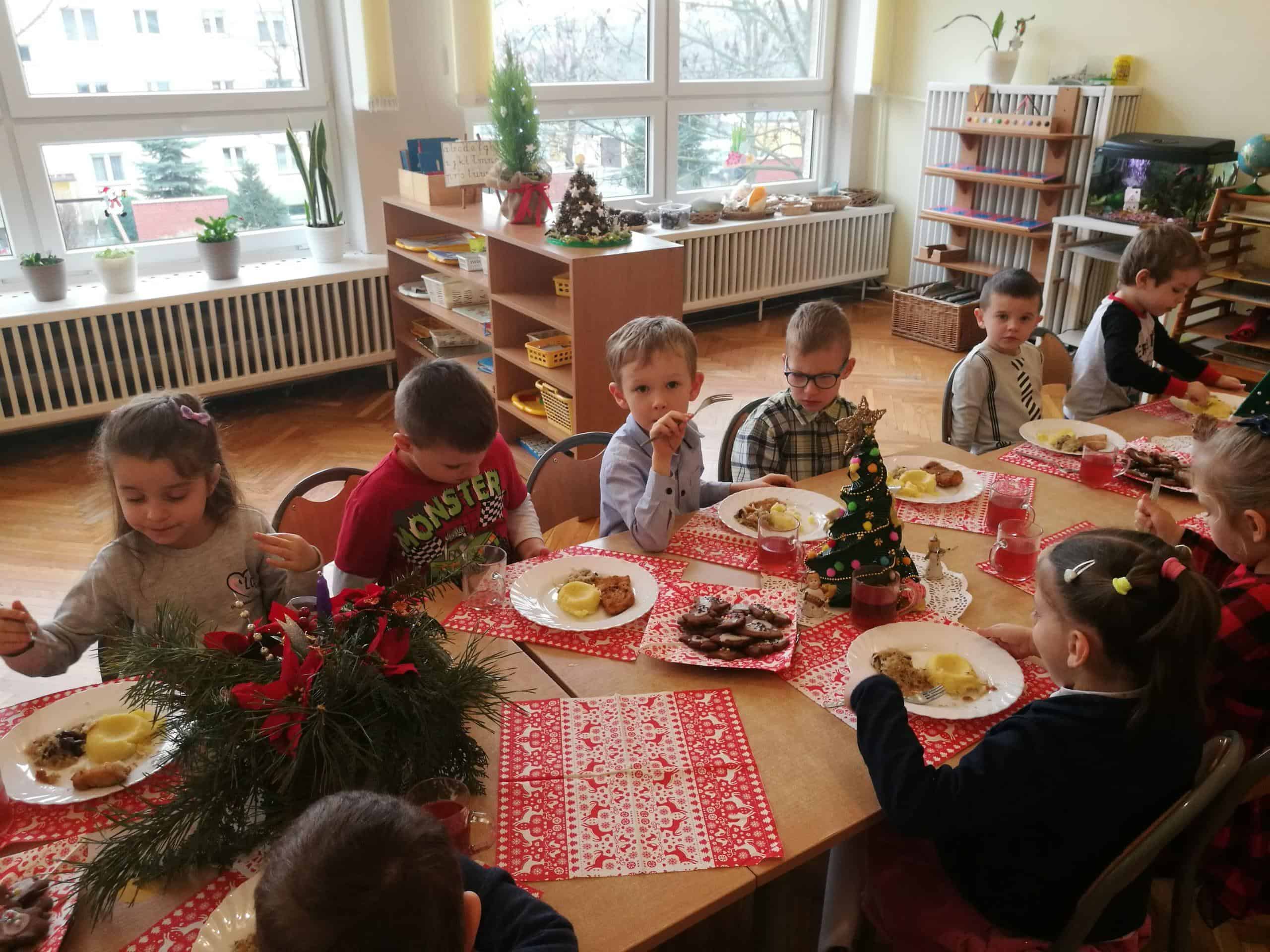 Święta Bożego Narodzenia to szczególny czas. Ten niezwykły czas oczekiwania w naszym przedszkolu zakończył się w dniu dzisiejszym uroczystym spotkaniem Wigilijnym. Do tego dnia przygotowywaliśmy się przez cały okres Adwentu. Codziennie uczestniczyliśmy w uroczystej godzince adwentowej na holu przedszkolnym, poznawaliśmy tradycje i zwyczaje świąteczne, aktywnie uczestniczyliśmy w przygotowaniach poprzez wykonywanie ozdób, ubieranie choinki, wykonanie kartek świątecznych, pieczenie pierników, wspólne śpiewanie kolęd i pastorałek. W uroczystym dniu łamiąc się opłatkiem wszyscy składaliśmy sobie życzenia, zasiedliśmy przy odświętnie nakrytym, z pustym miejscem wigilijnym stole, smakowaliśmy wigilijnych potraw, nuciliśmy kolędy i pastorałki. Dzieląc się radością płynącą z tajemnicy Narodzenia Pana składamy wszystkim dzieciom i Rodzicom najserdeczniejsze życzenia aby Miłość, która narodzi się w Betlejem darzyła radością i spokojem. Na nadchodzące święta Bożego Narodzenia i Nowy Rok 2020 życzymy szczęścia, radości, ludzkiej życzliwości oraz niosącego Pokój Bożego Błogosławieństwa. Niech Boża Dziecina darzy zdrowiem, licznymi łaskami oraz błogosławi na każdy dzień Nowego Roku.