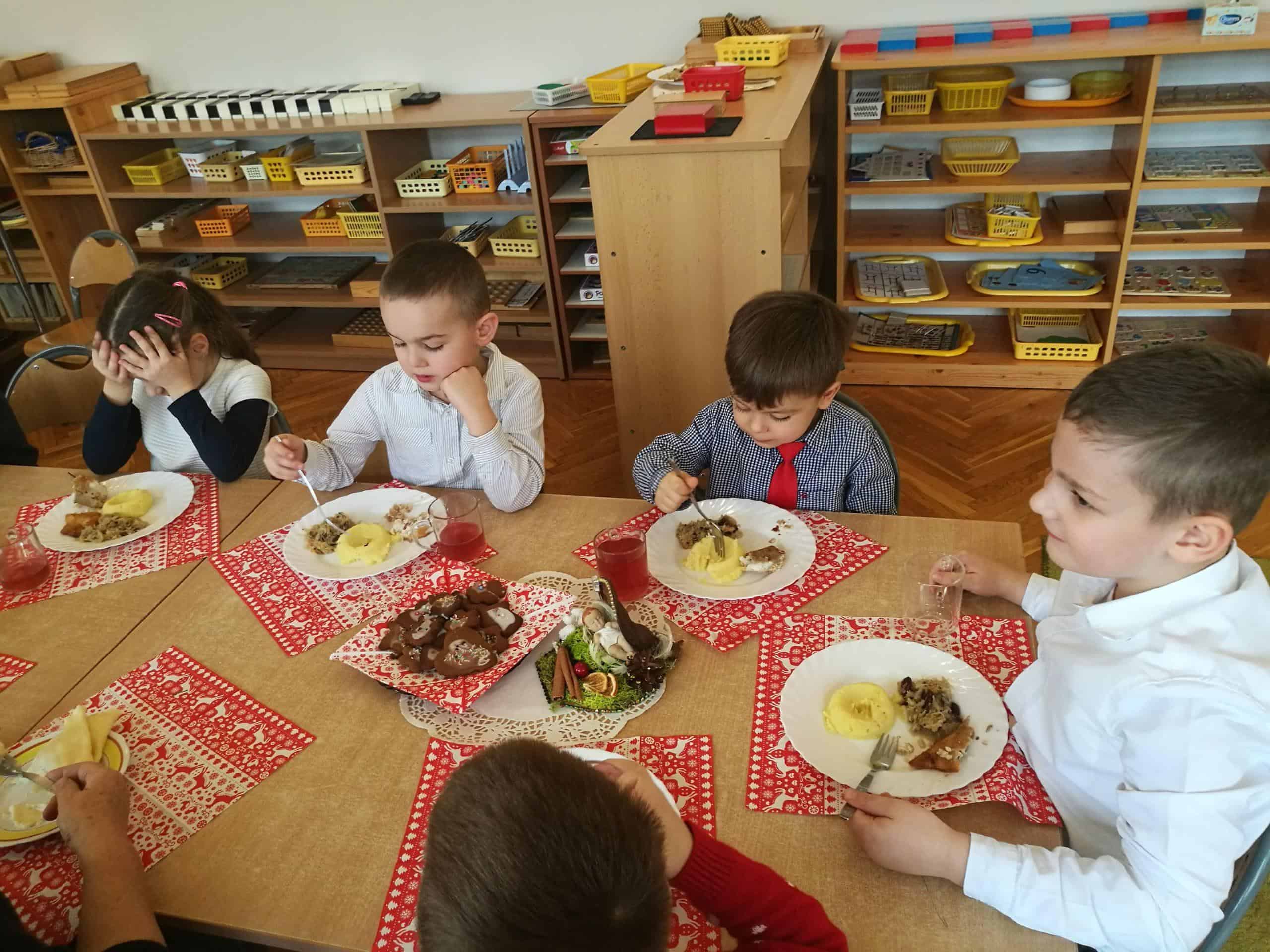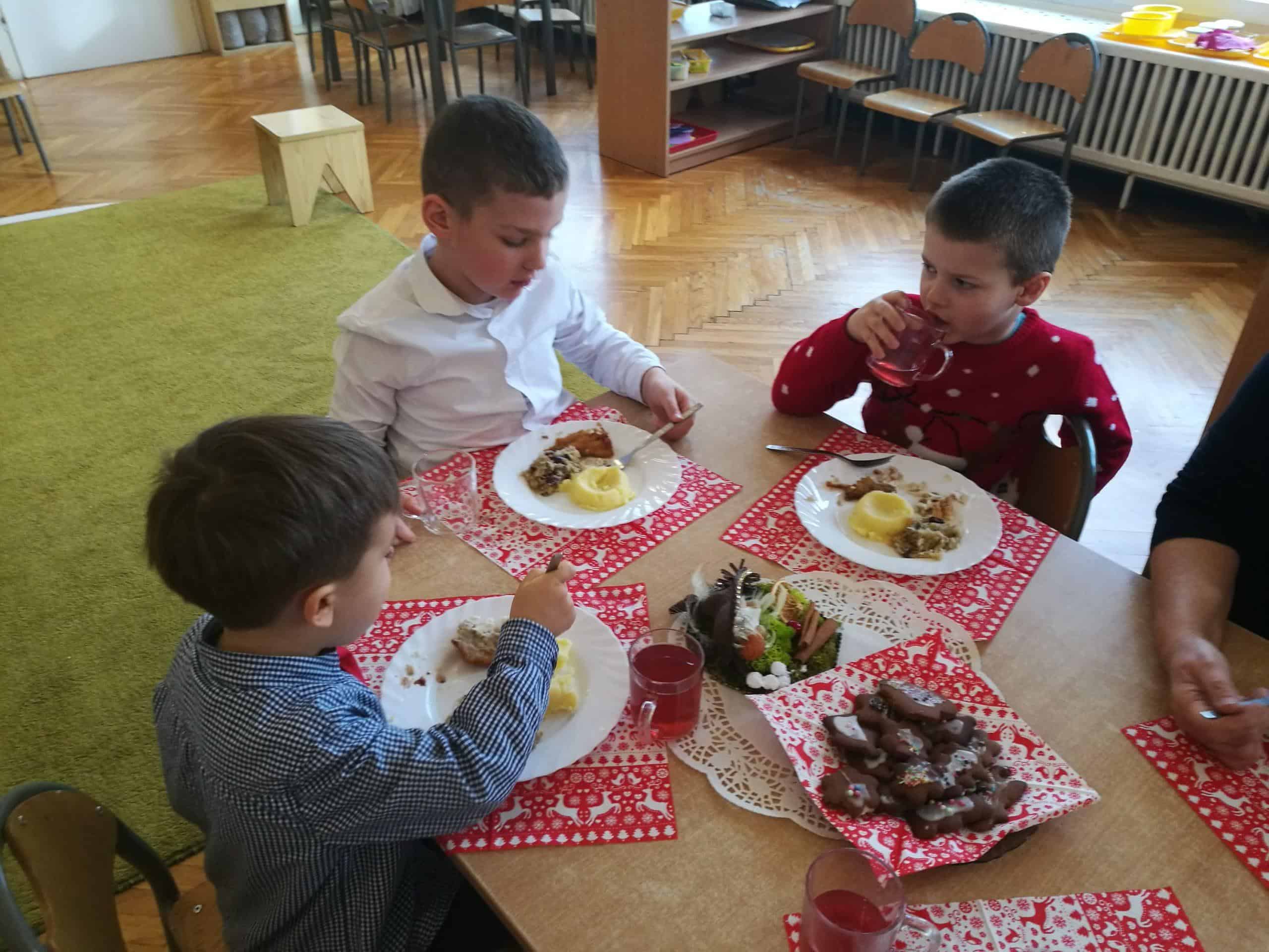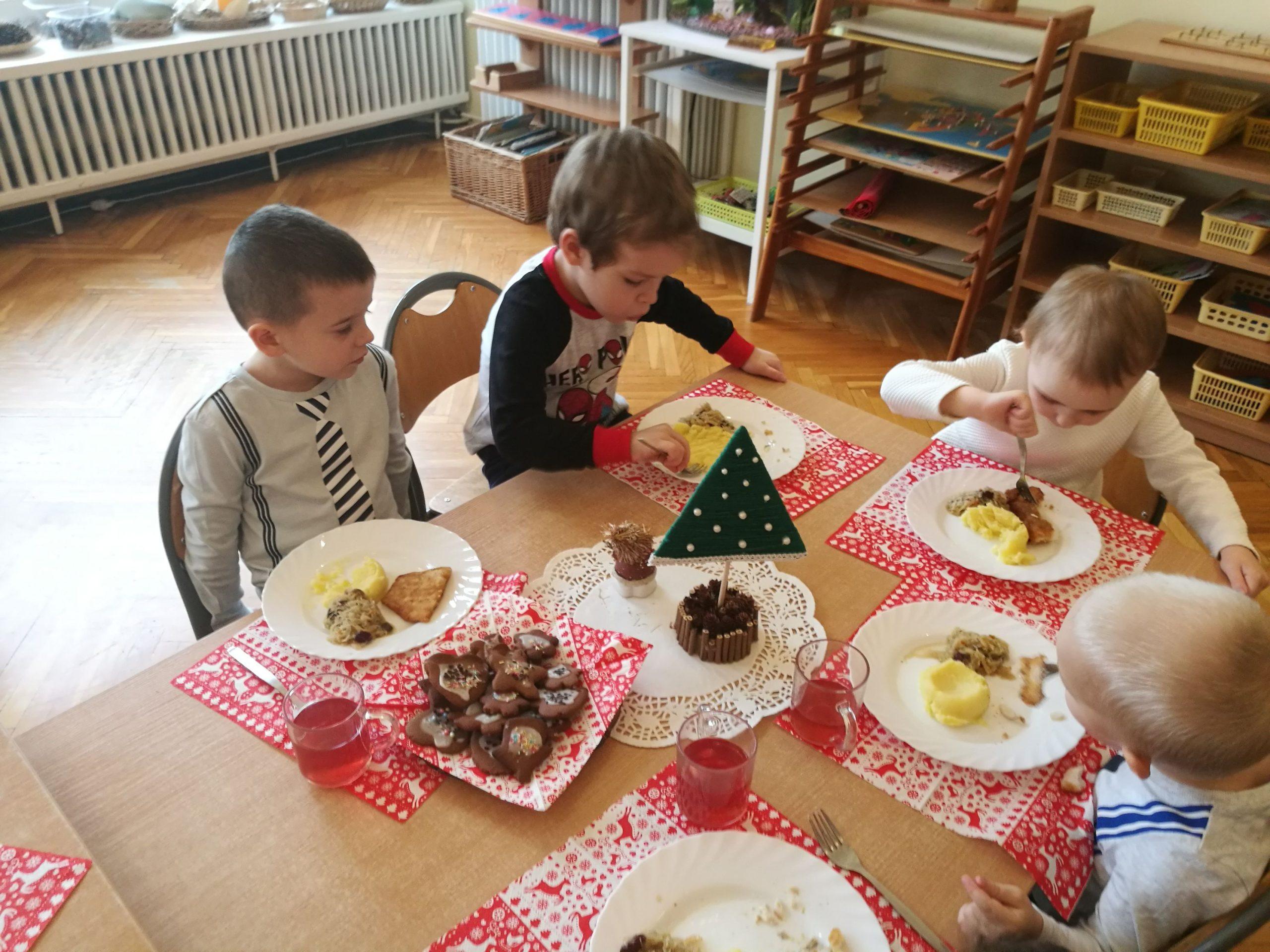 Święta Bożego Narodzenia to szczególny czas. Ten niezwykły czas oczekiwania w naszym przedszkolu zakończył się w dniu dzisiejszym uroczystym spotkaniem Wigilijnym. Do tego dnia przygotowywaliśmy się przez cały okres Adwentu. Codziennie uczestniczyliśmy w uroczystej godzince adwentowej na holu przedszkolnym, poznawaliśmy tradycje i zwyczaje świąteczne, aktywnie uczestniczyliśmy w przygotowaniach poprzez wykonywanie ozdób, ubieranie choinki, wykonanie kartek świątecznych, pieczenie pierników, wspólne śpiewanie kolęd i pastorałek. W uroczystym dniu łamiąc się opłatkiem wszyscy składaliśmy sobie życzenia, zasiedliśmy przy odświętnie nakrytym, z pustym miejscem wigilijnym stole, smakowaliśmy wigilijnych potraw, nuciliśmy kolędy i pastorałki. Dzieląc się radością płynącą z tajemnicy Narodzenia Pana składamy wszystkim dzieciom i Rodzicom najserdeczniejsze życzenia aby Miłość, która narodzi się w Betlejem darzyła radością i spokojem. Na nadchodzące święta Bożego Narodzenia i Nowy Rok 2020 życzymy szczęścia, radości, ludzkiej życzliwości oraz niosącego Pokój Bożego Błogosławieństwa. Niech Boża Dziecina darzy zdrowiem, licznymi łaskami oraz błogosławi na każdy dzień Nowego Roku.