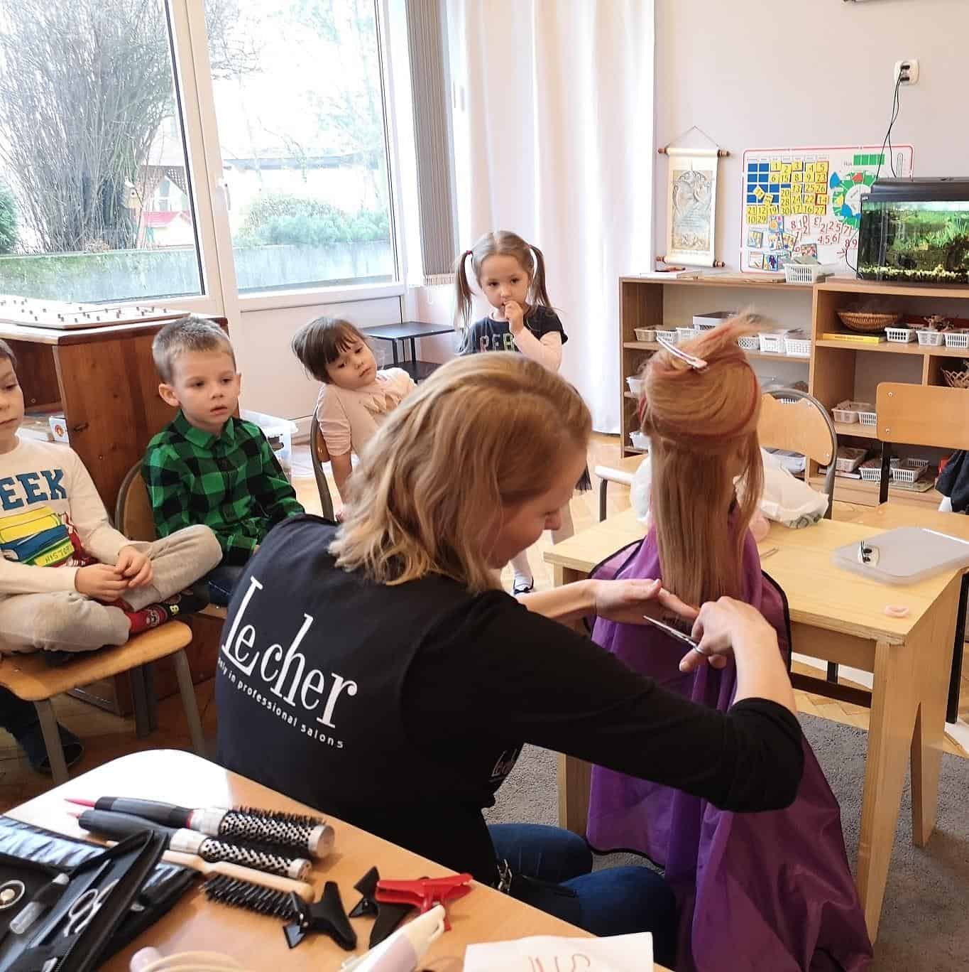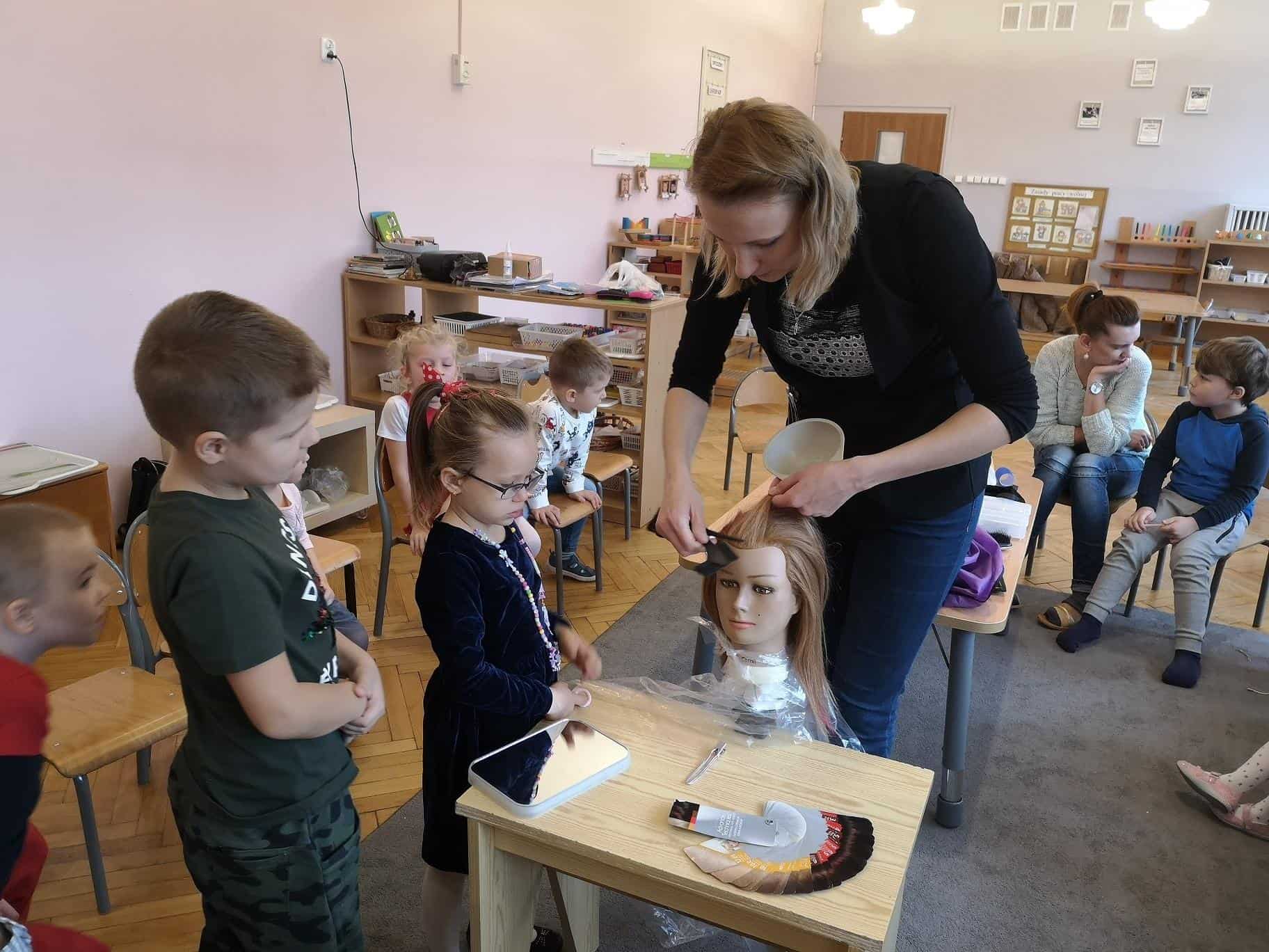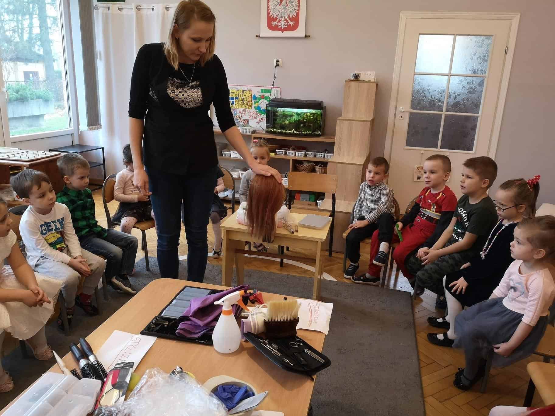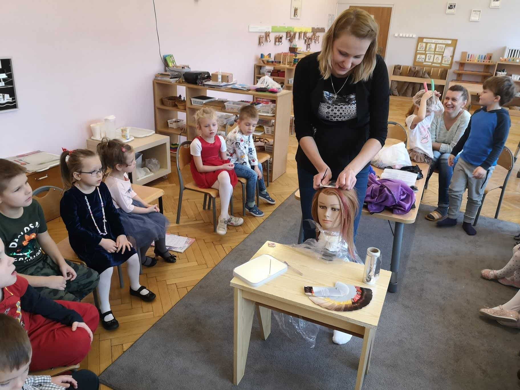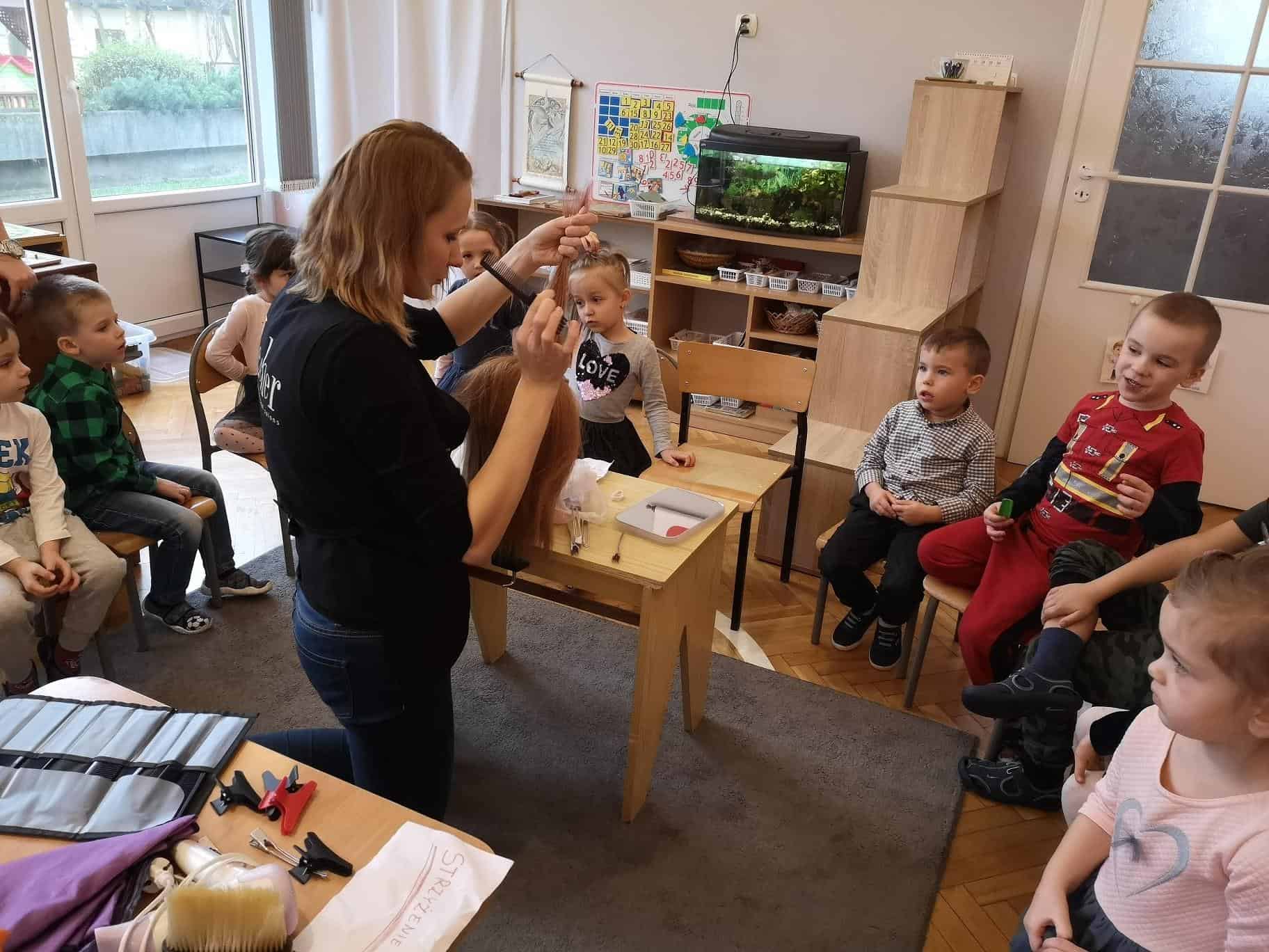 We wtorek 26 listopada odwiedziła nas w grupie mamusia Amelki – Pani Ewelina, która jest fryzjerką. W sposób praktyczny pokazała dzieciom na czym polega zawód fryzjera, przedstawiła poszczególne etapy zabiegów fryzjerskich takich jak: strzyżenie, koloryzacja (farbowanie), stylizacja (modelowanie), czesanie (upięcia), trwała ondulacja. Zaprezentowała sprzęt oraz różne atrybuty jakie używa podczas swojej pracy: fartuch fryzjerski z kieszeniami, pelerynę, różnego rodzaju grzebienie, szczotki, nożyczki klasyczne, nożyczki degażówki (które służą do przerzedzania włosów, ich zadaniem jest wykończenie fryzury i uzyskanie efektu lekkości), suszarkę, wałki, papiloty, klamerki, żabki, wsuwki, spinki, sprężynki, pętelki, szczotkę karkówkę z końskiego włosia (która służy do usuwania obciętych włosów), itp. Dowiedzieliśmy się co to jest „pasmo pamięci” – czyli pasmo włosów według którego odmierzane są długości pozostałych pasm włosów.