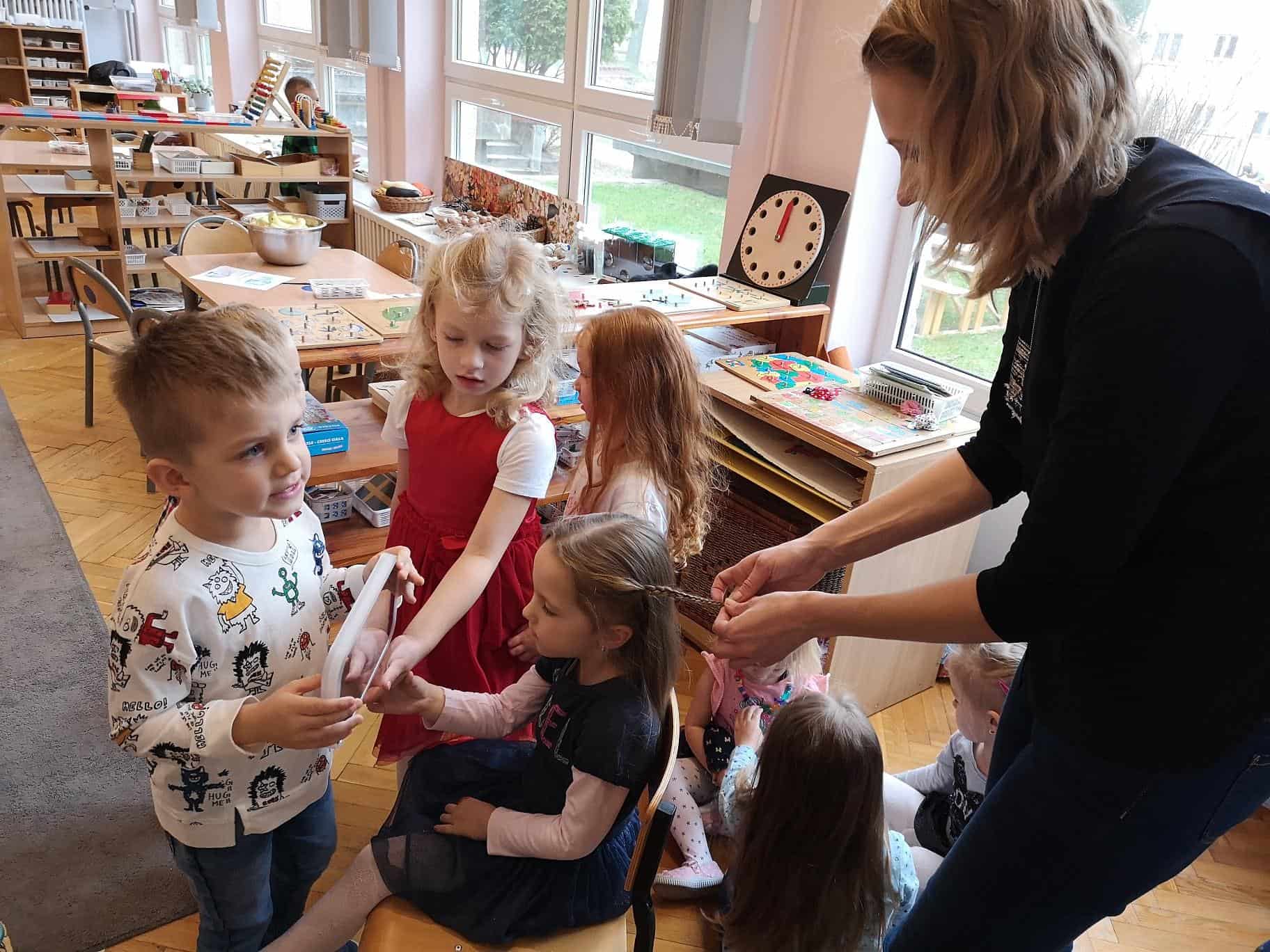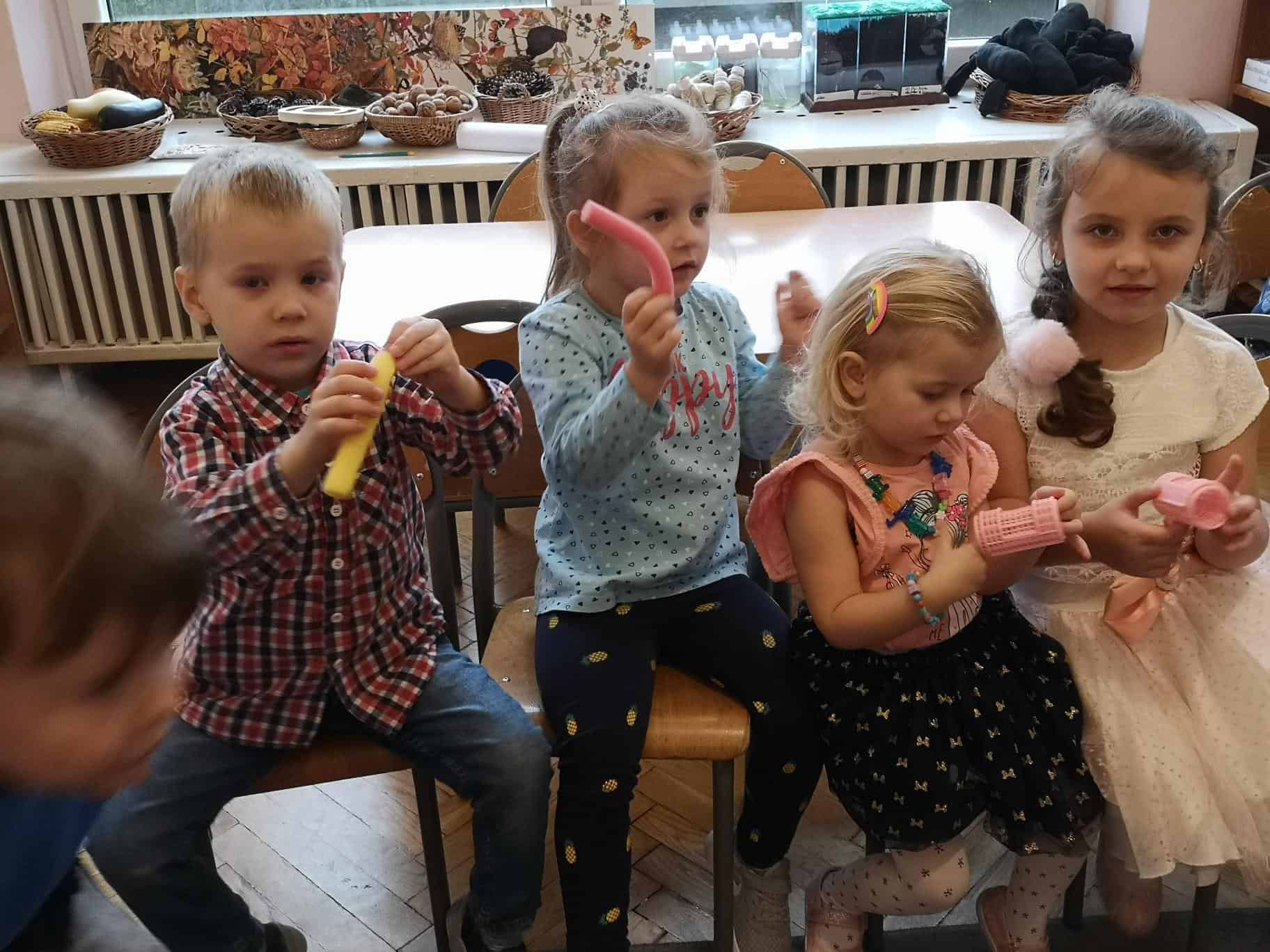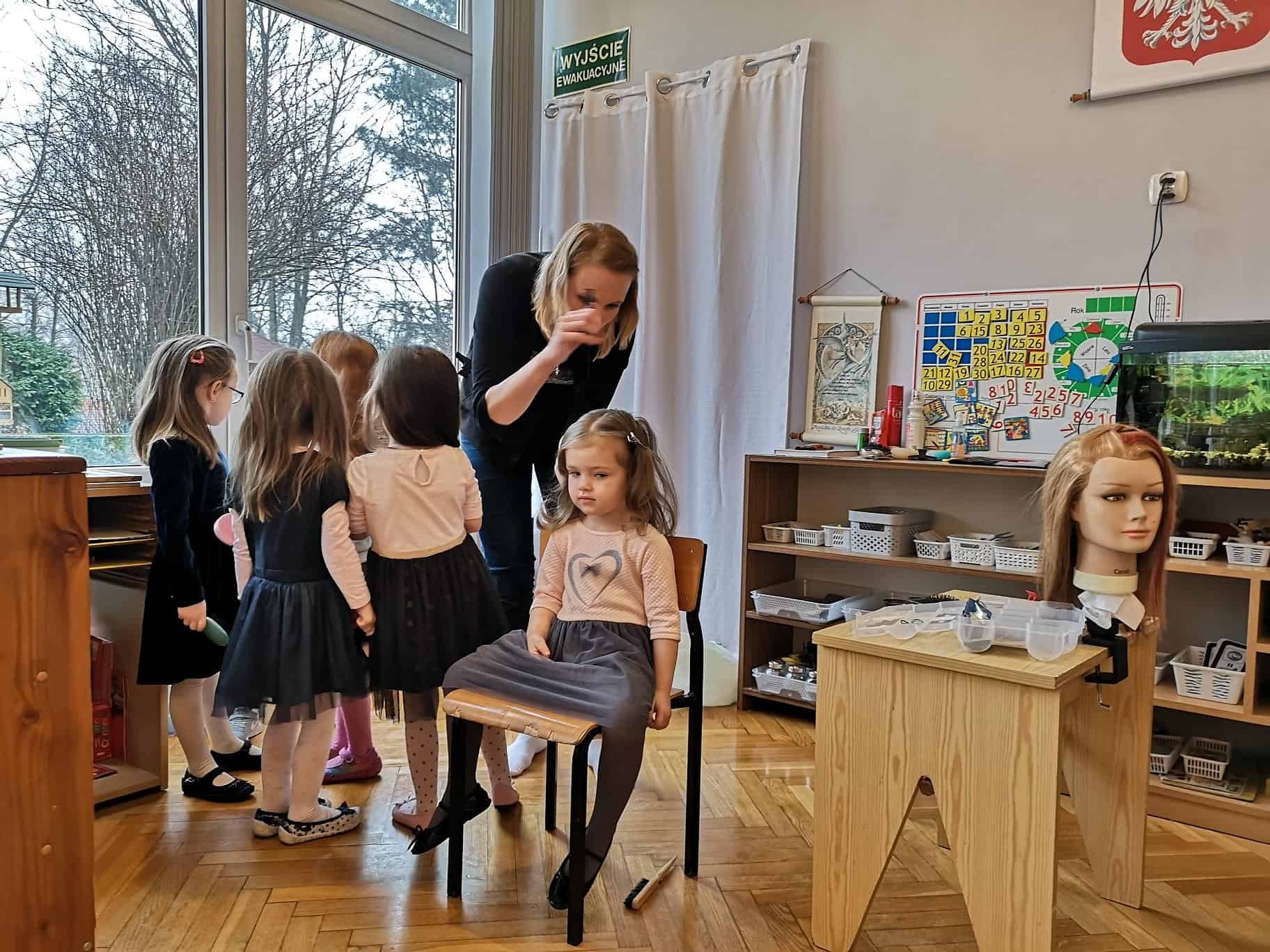 Kolejną częścią spotkania było uczesanie fryzur naszym przedszkolakom. Dzieci rezerwowały sobie kolejkę, nie mogły doczekać się kiedy w końcu usiądą na „fotelu fryzjerskim”. Pierwszeństwo miały dziewczynki, rozpuściły włosy i z niecierpliwością czekały na swoją kolej, chłopcy asystowali koleżankom z grupy trzymając lusterko, aby mogły się przyglądać. W między czasie przedszkolaki próbowały własnych sił – treningowa główka fryzjerska była wręcz rozchwytywana – dzieci oddały się temu zadaniu z wielkim zaangażowaniem.
