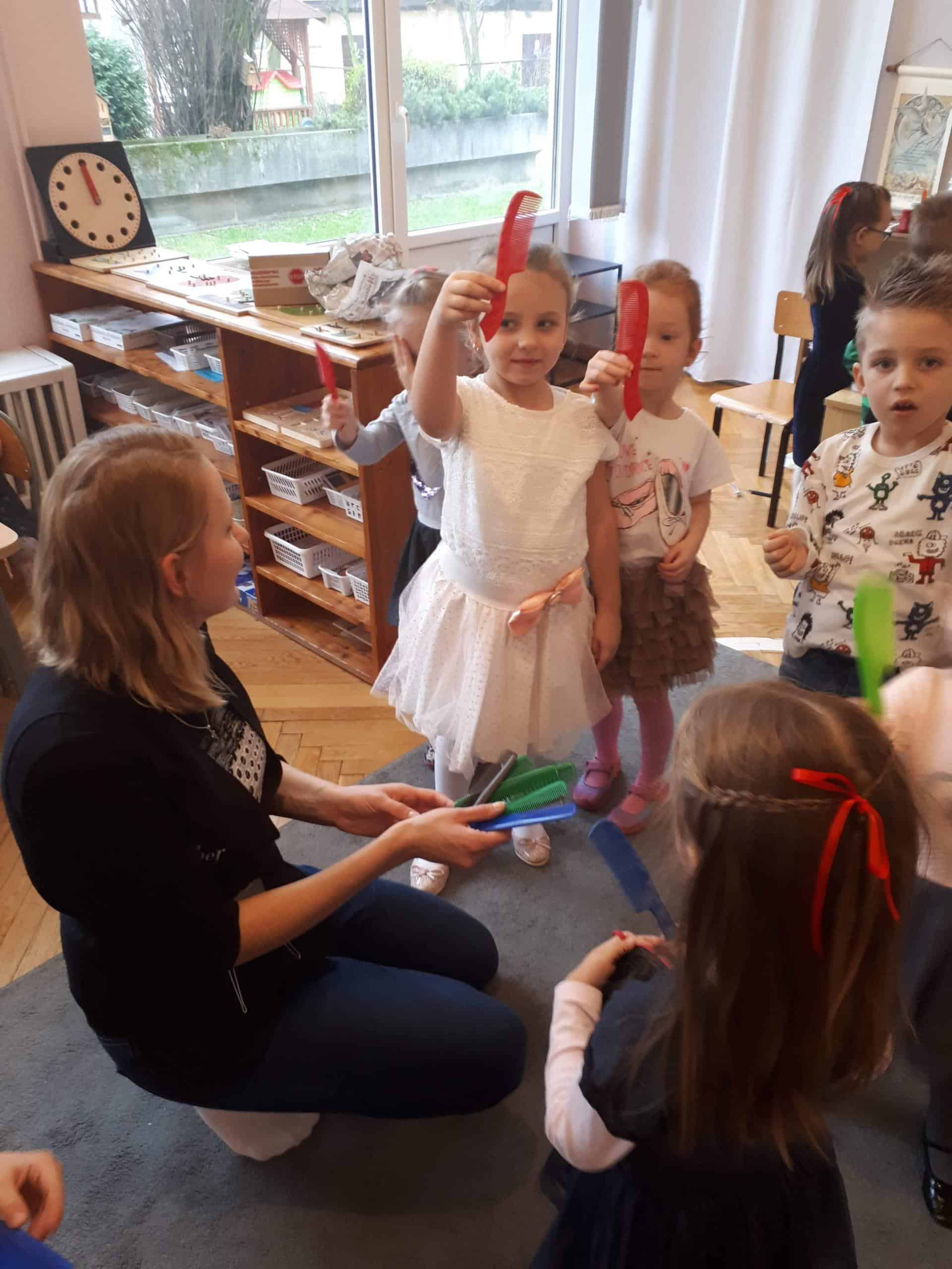 Na zakończenie tego spotkania Pani Ewelinka wręczyła dzieciom upominki – kolorowe grzebienie, które wszystkim bardzo się podobały. Po tak wspaniałym spotkaniu każdy na pewno z chęcią będzie chodził do fryzjera.
