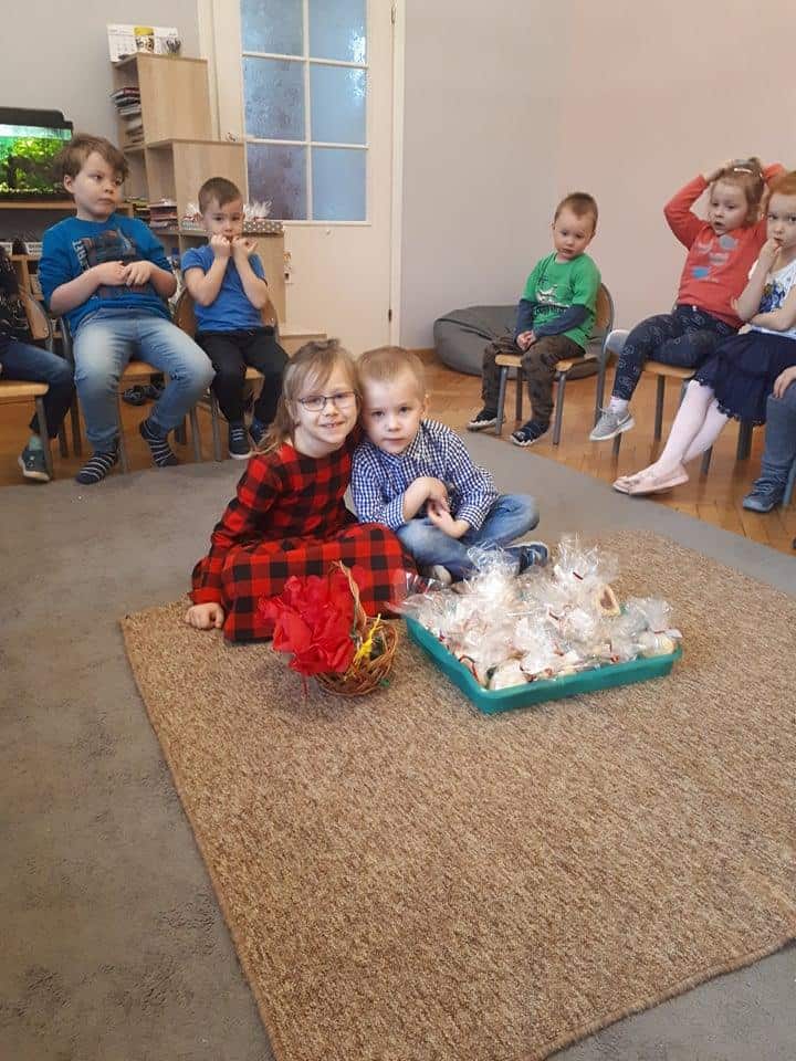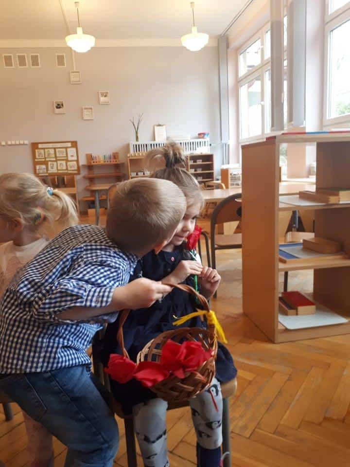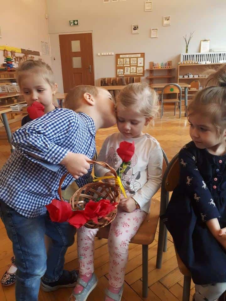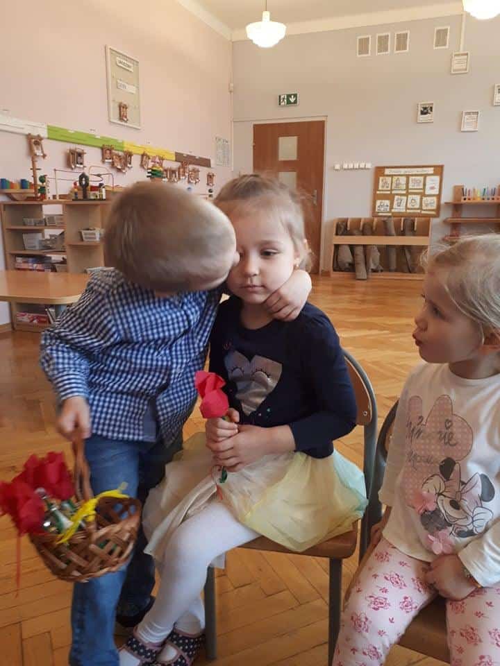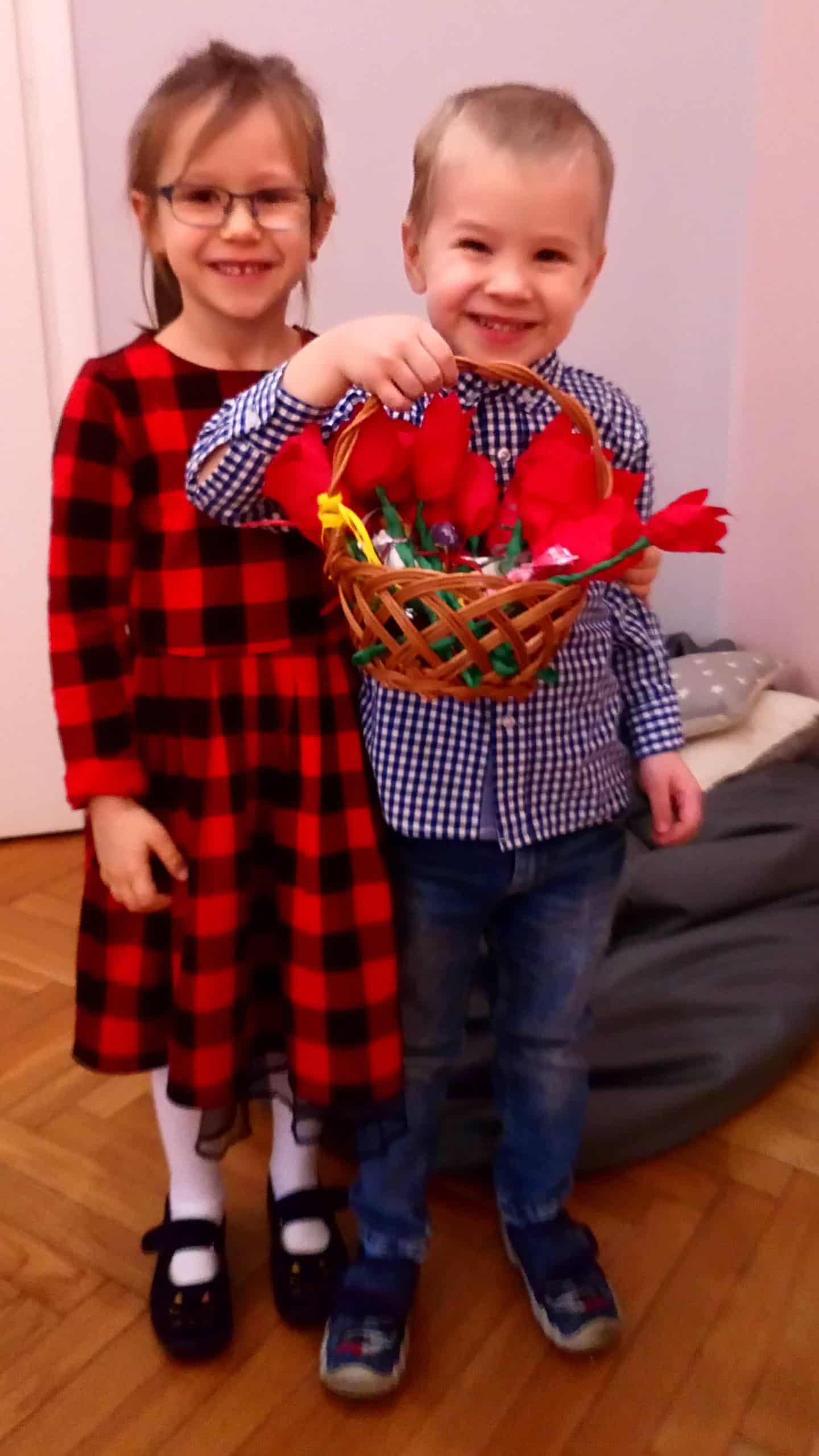 „Jaki poranek, taki cały dzień” – powiadają niektórzy i…..mają rację, bo u nas sprawdziło się to w zupełności. Po prezencie od Zosi, przyszedł czas na Marysię i Hubercika, który wchodząc do sali trzymał w koszyczku piękne, własnoręcznie robione tulipany i obdarowywał nimi wszystkie dziewczynki z naszej grupy. Nawet Panie, które według Hubercika są takimi starszymi, dłuższymi i grubszymi dziewczynkami otrzymały te piękne kwiaty 🙂