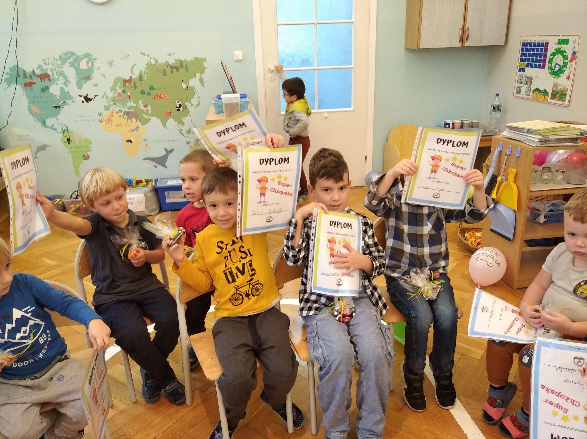 30 września z okazji Dnia Chłopaka dziewczynki z naszej grupy przygotowały słodki poczęstunek,życzenia i upominki. Każdy chłopak otrzymał dyplom nadania zaszczytnego tytułu „Super chłopak”. W tym wyjątkowym dniu przypomnieliśmy sobie jakie cechy powinien posiadać każdy ” dżentelmen”w naszej grupie. Dzień upłynął nam na wspólnej zabawie i tańcach z balonami.
