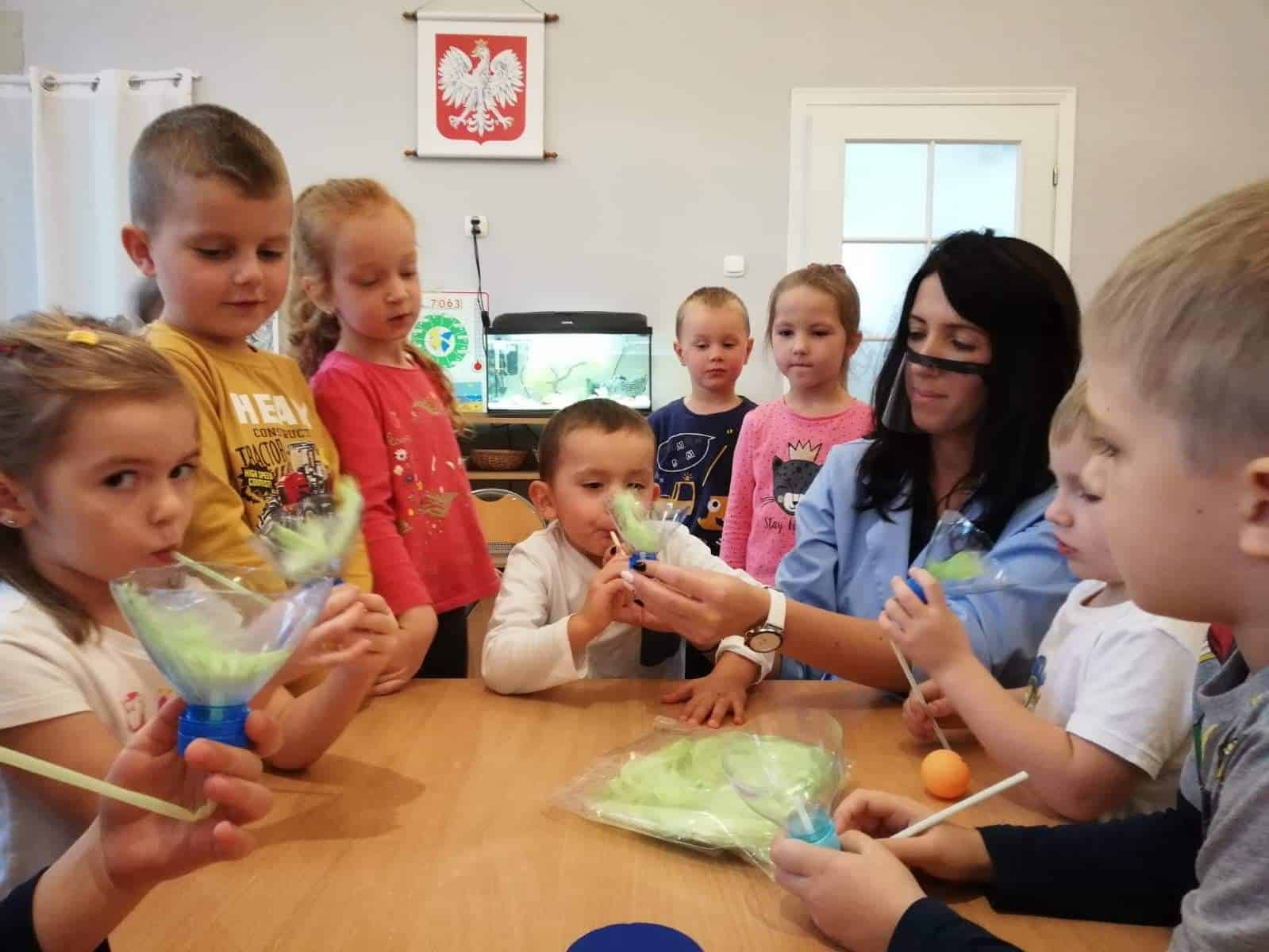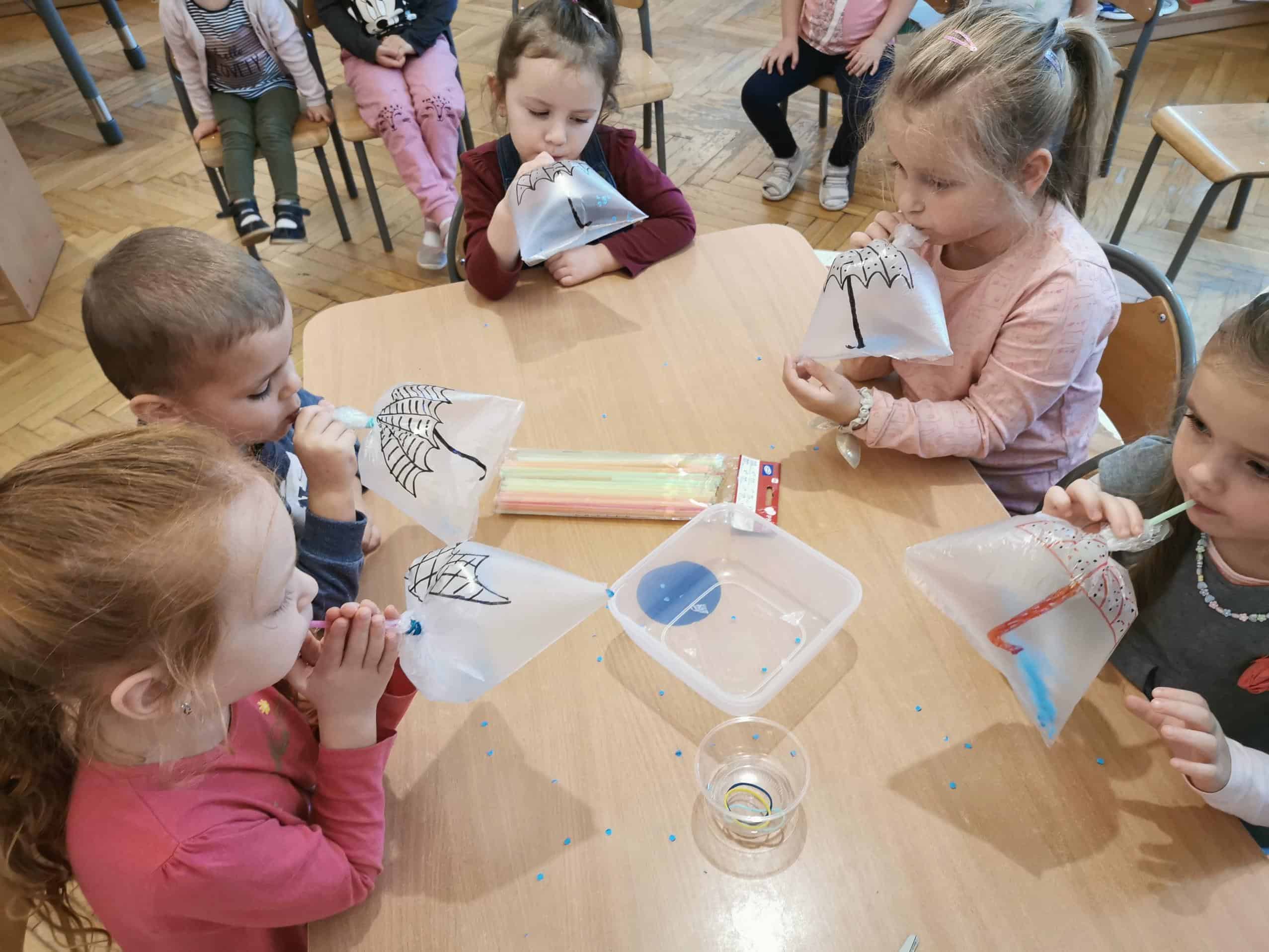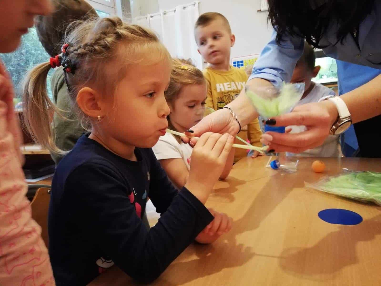 W słomkę można dmuchać, a tym samym przesuwać za jej pomocą do celu lekki pomponik, czy odszukiwać ukryty pod warstwą kaszy manny obrazek. Barwne słomki wkładamy do otworu w puszce tego samego koloru, co słomka. Zabawy z użyciem słomek usprawniają pracę oka i ręki, ćwiczą narządy artykulacyjne.