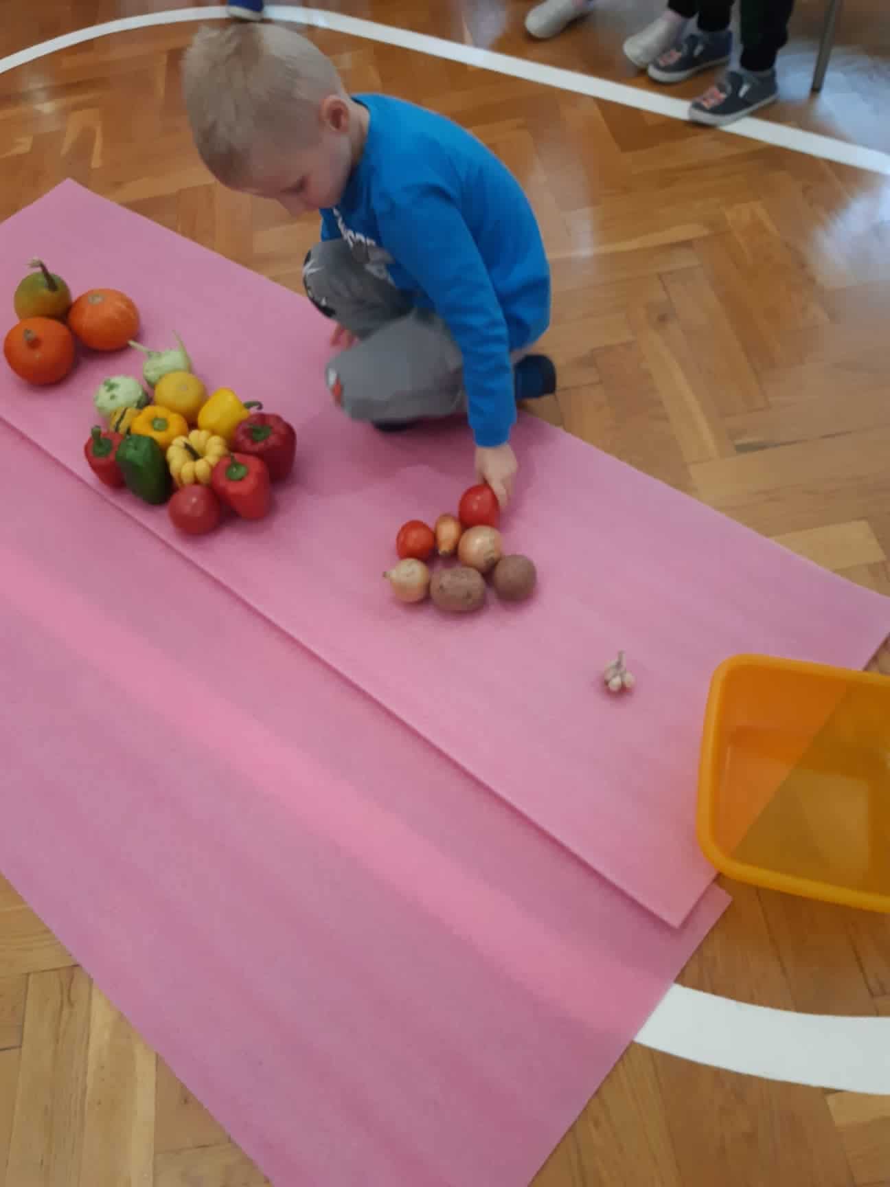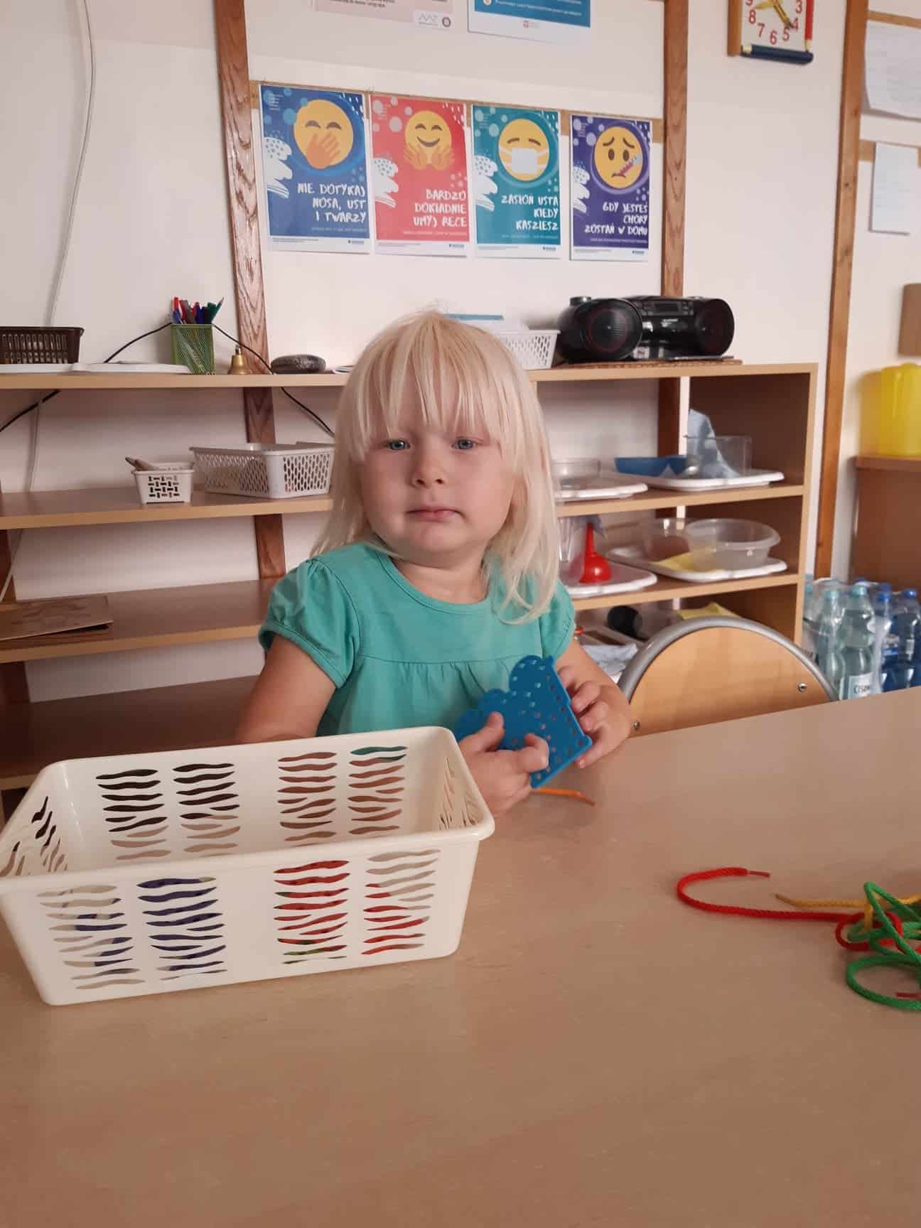 Sznurkiem przeplatamy górną część kosza na bieliznę. Na dnie kosza umieszczamy przedmioty, które dziecko musi wyjąć, pokonując „labirynt” zrobiony ze sznurka. Prosimy dziecko, aby spośród wszystkich znajdujących się w koszu przedmiotów wyjęło np. tylko pluszowe zwierzątka albo tylko zielone piłeczki i czerwone woreczki…