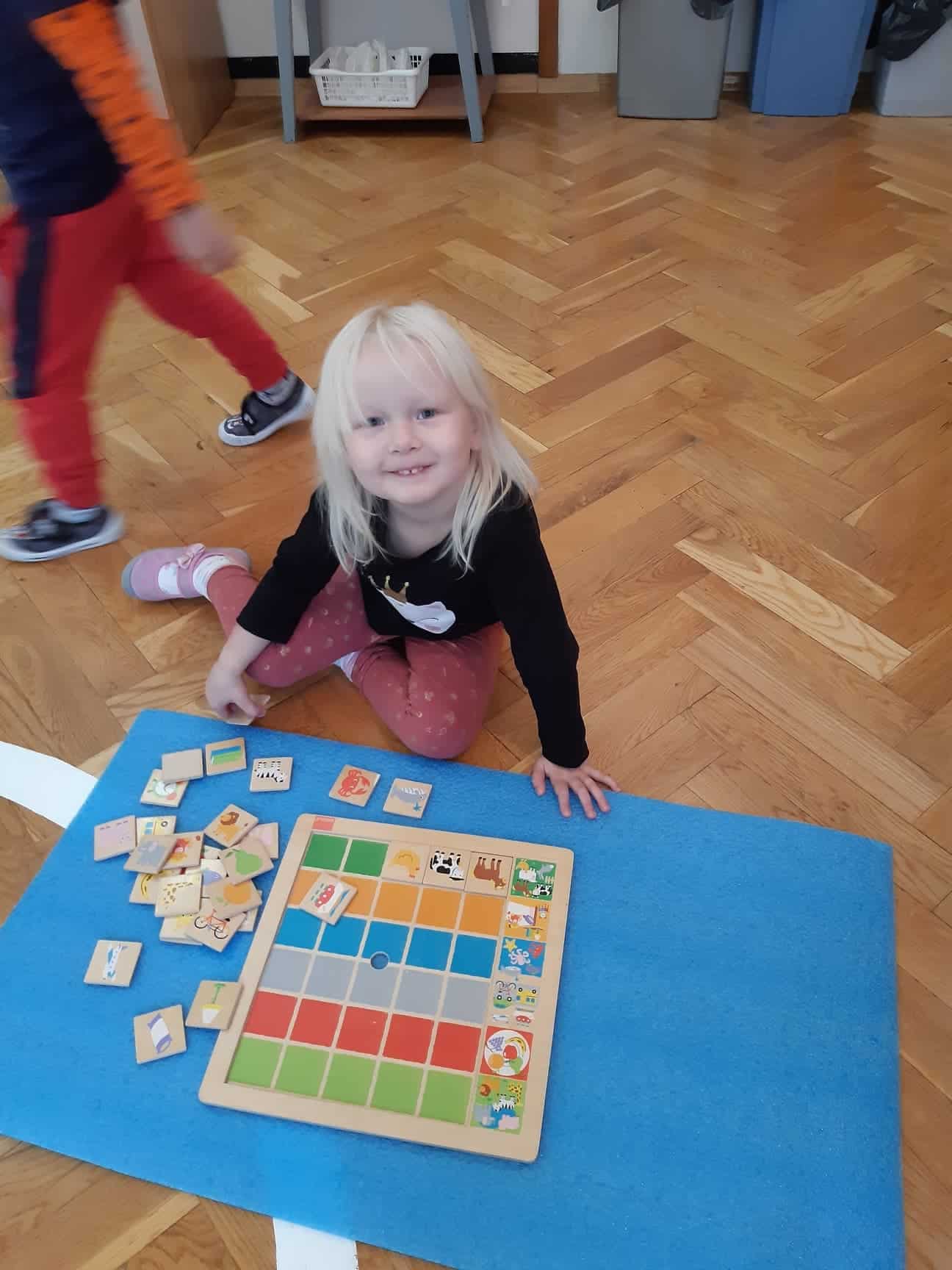 W otwory wytłaczanki po jednej stronie układamy klocki. Zadaniem dziecka jest w identyczny sposób ułożyć klocki w otworach po drugiej stronie wytłaczanki. Zadaniem trudniejszym jest ułożenie w otworach klocków według wzoru narysowanego na kartce. Inna wersja tej zabawy polega na wkładaniu drobnych klocków w otwory pojemnika do robienia kostek lodu.