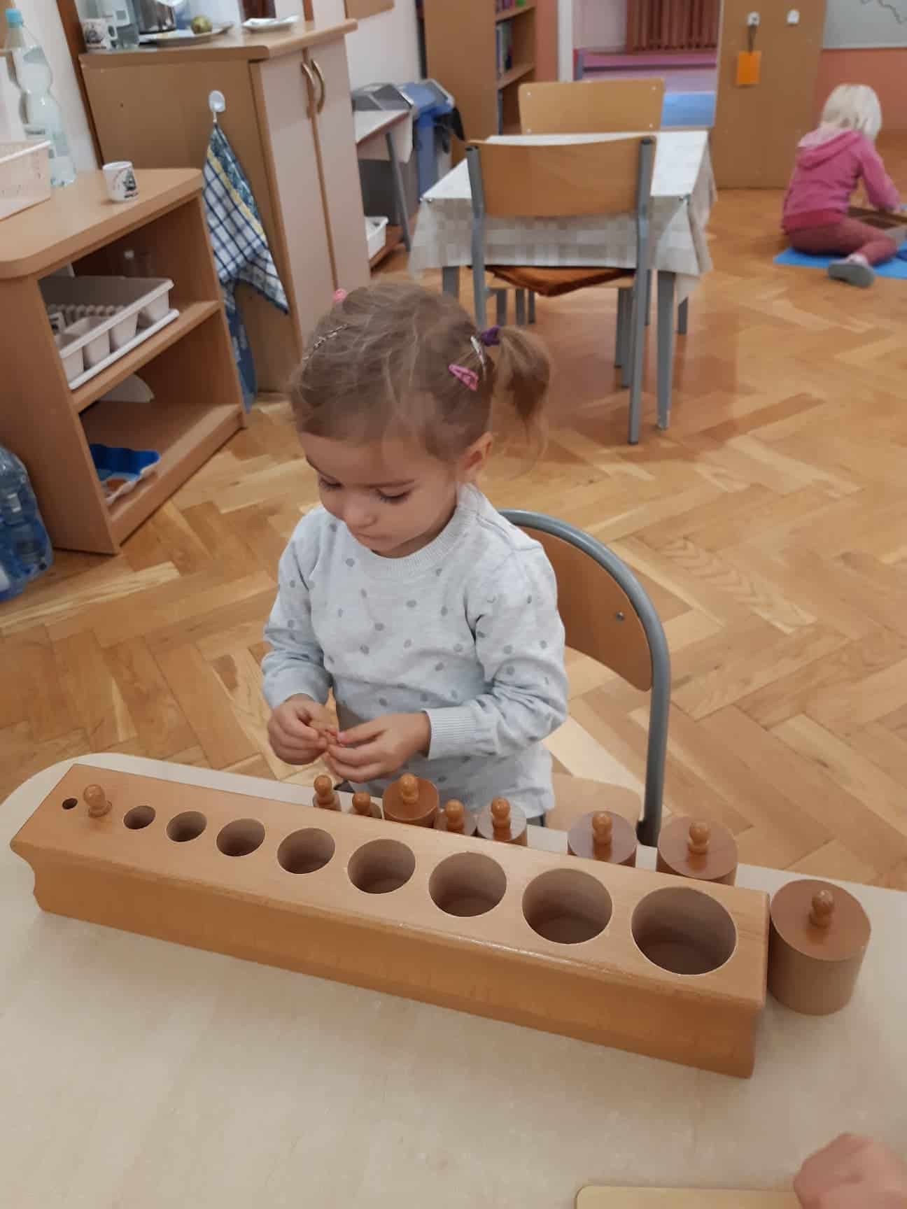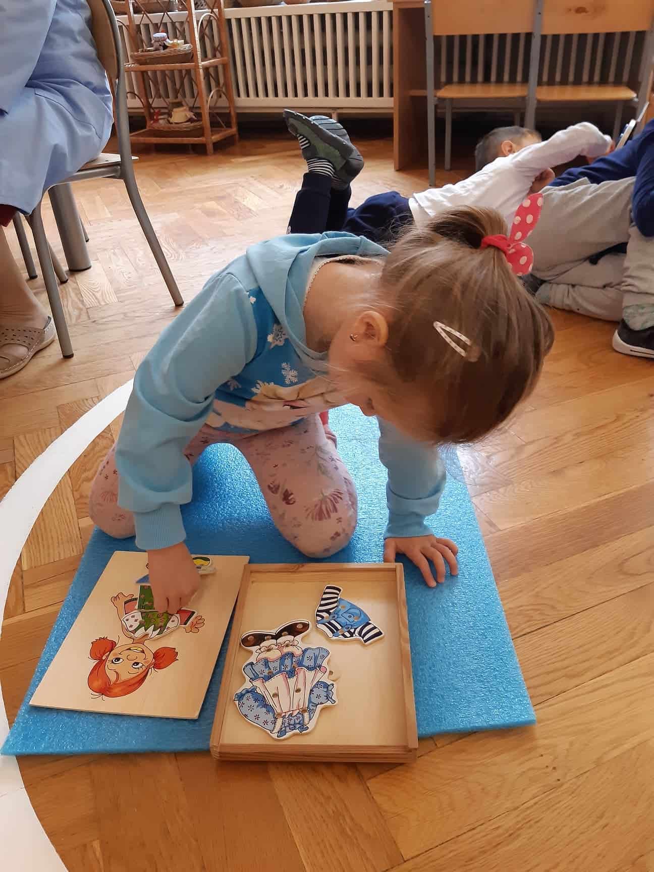 Proponujemy dziecku dopinanie klamerek – do miseczki, do rozwieszonego sznurka, do sztywnej kartki lub do papierowego talerzyka. Dobieramy klamerki według koloru, według napisanej na papierowym talerzyku liczby. Klamerkami dopinamy na sznurku ubranka dla lalek, skarpetki, obrazki…Starszym dzieciom proponujemy dopinanie drewnianych klamerek z literkami do obrazków w taki sposób, aby powstała nazwa tego, co znajduje się na danym obrazku. W ten atrakcyjny sposób utrwalamy znajomość liter, uczymy odczytywać wyrazy i kojarzyć je z obrazem graficznym.