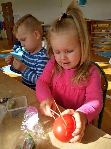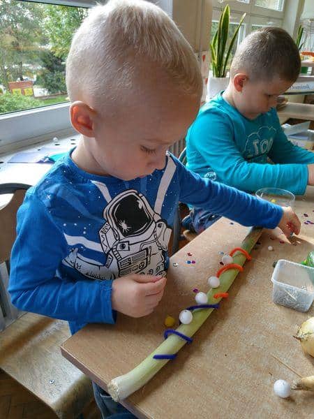 Sznurowadła przewlekamy przez otwory w plastikowych koszyczkach i pojemnikach. Na sznurowadła nawlekamy korale, duże guziki lub pocięte kolorowe słomki. Sznurowadła przewlekamy przez otwory wycięte po obydwu stronach tekturowej kartki, tworząc „gorsecik”.