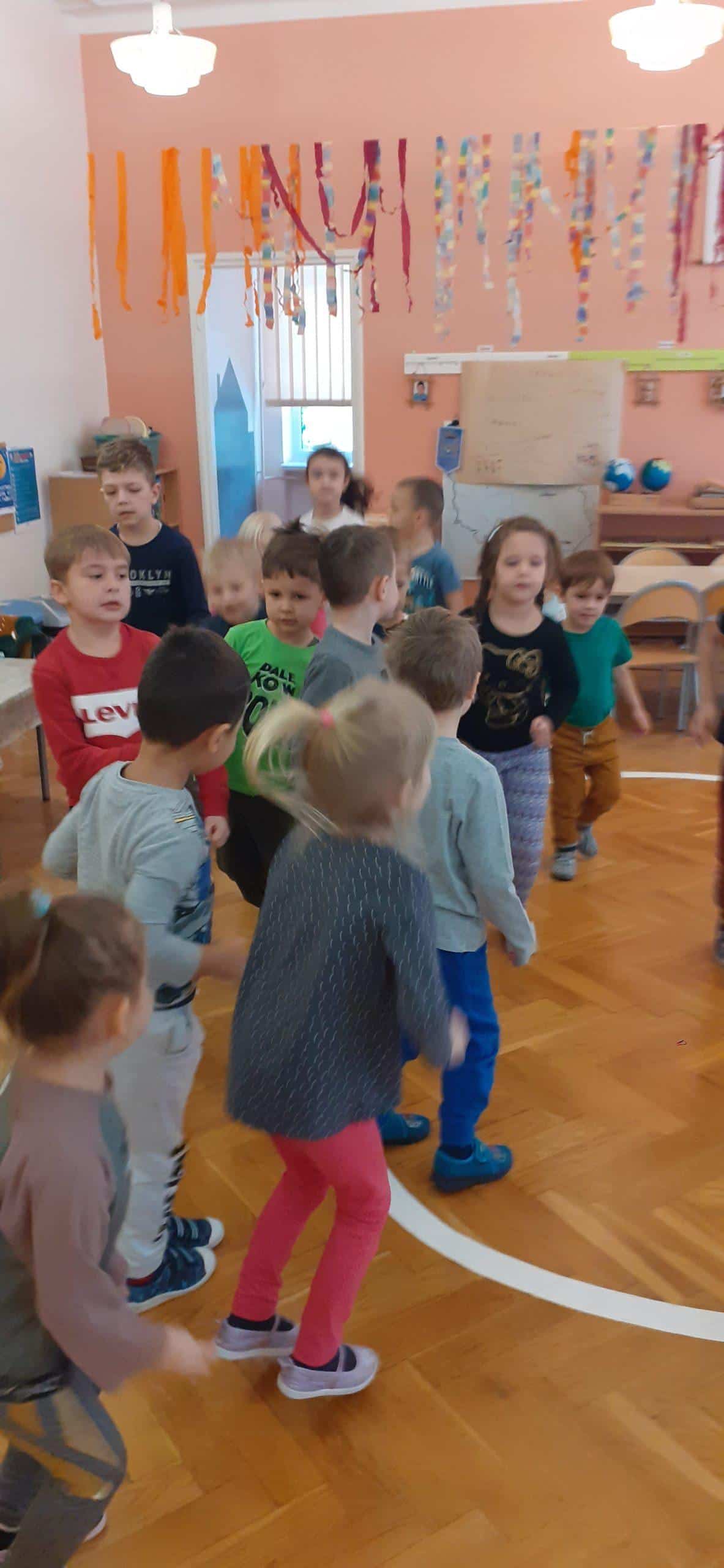W piątek, 27 listopada, odbyła się w naszej grupie zabawa andrzejkowa. Po obiedzie przystroiliśmy sale i rozpoczęliśmy naszą zabawę. W tym roku, ze względu na sytuację pandemiczną, miała ona nieco inny charakter, bo nie bawiliśmy się wspólnie ze wszystkimi grupami w naszym przedszkolnym holu pod przewodnictwem Pana Dominika, ale w swojej sali jako jedna grupa, ale to wcale nie oznacza, że było gorzej. Zabawy ruchowe, historie muzyczne opowiadane ruchem i inne znane dzieciom przeboje rozbrzmiewały głośnym echem z naszej sali. W trakcie zabawy na przedszkolaków czekała słodka niespodzianka w postaci cukierków i soczku. Po zregenerowaniu sił kontynuowaliśmy wspólną imprezę. Miło było popatrzeć na radosne i zadowolone miny dzieci.
