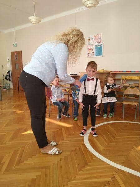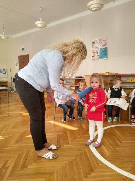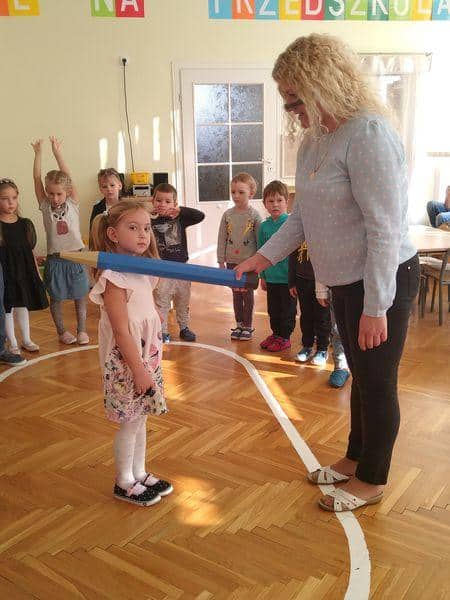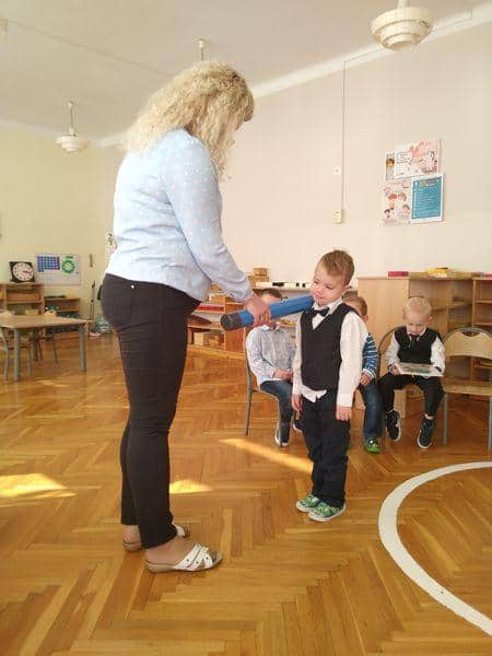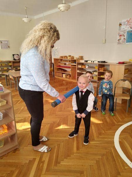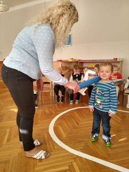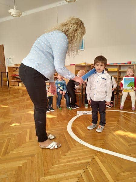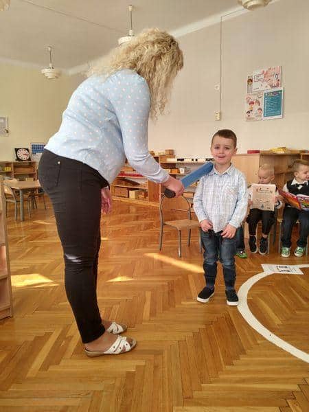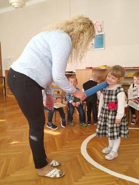 Po złożeniu przyrzeczenia każdy nowy PRZEDSZKOLAK został pasowany na … jak to mówią starsze dzieci: prawdziwego przedszkolaka. Każdy z nich wysłuchał formuły pasowania, którą wypowiadała pani Magdalena Zagrobelny. Dotykając kredką ramienia dziecka mówiła:„Pasuję Cię na przedszkolaka”. Potem dzieci odbierały dyplomy, książki i gratulacje. Pani Madzia osłodziła wydarzenie częstując wszystkich cukiereczkami.