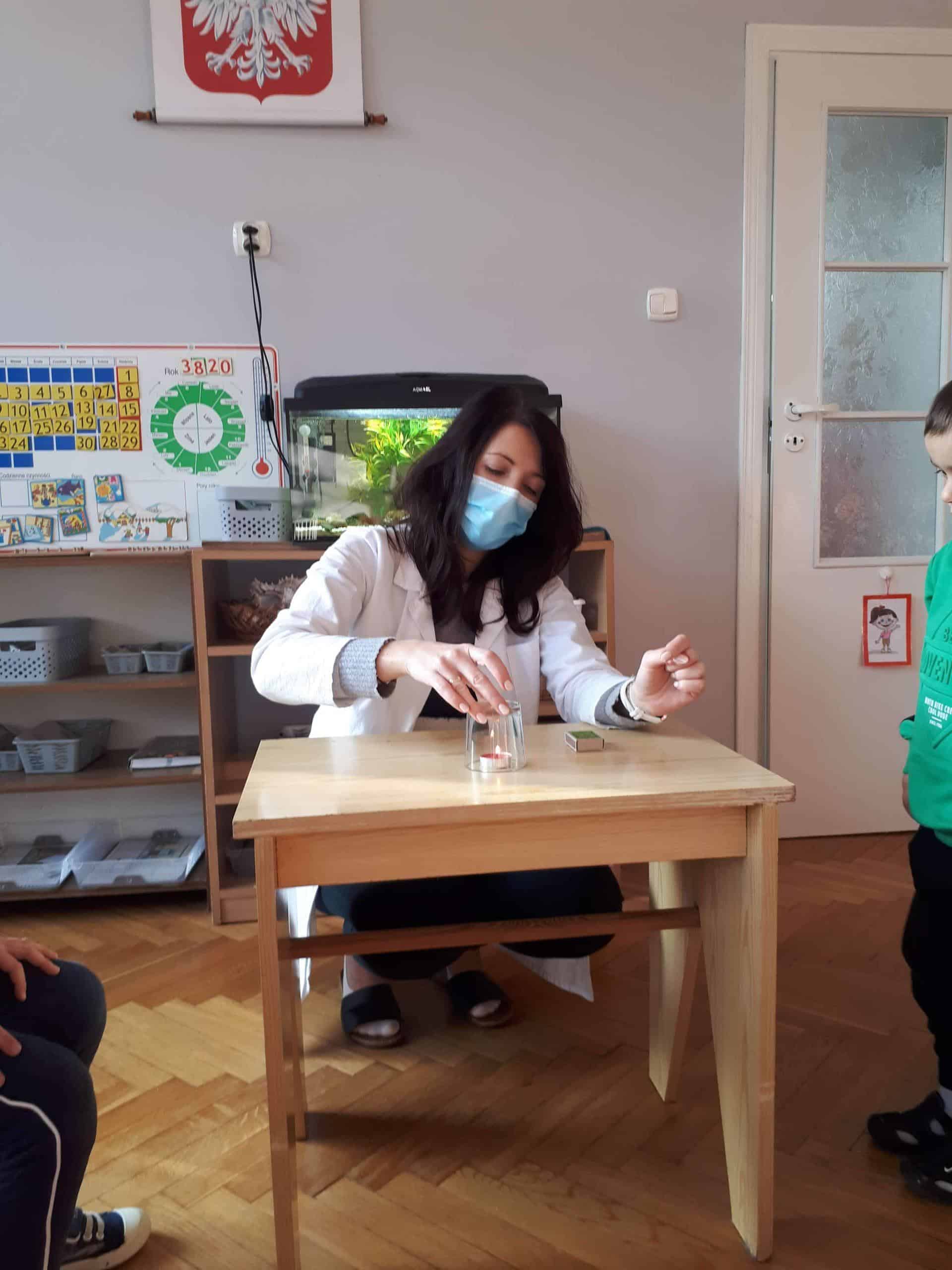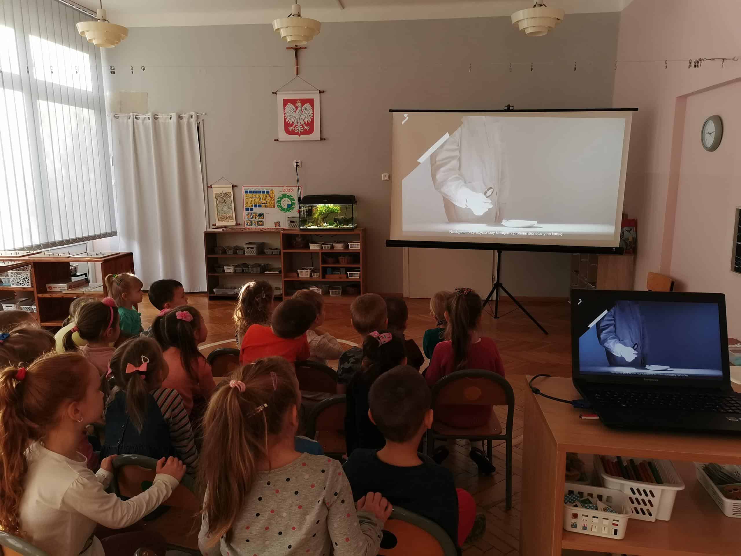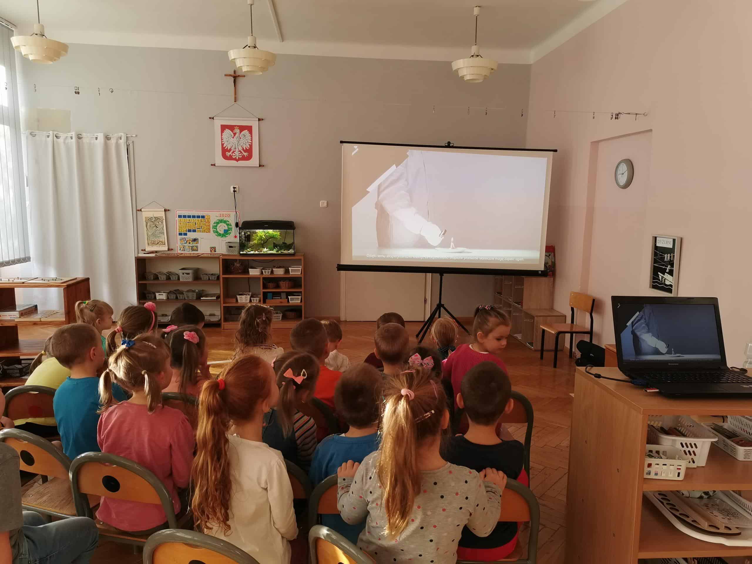 Nie udało nam się wykonać eksperymentu – Powstawanie ognia, ale obejrzeliśmy jego przebieg na ekranie projekcyjnym. Eksperyment był inspiracją do dyskusji na temat ochrony naszej przyrody. Zostawione w lesie śmieci, szklane butelki, które będą niczym lupa, pod wpływem działania promieni słonecznych mogą wywołać pożar lasu. Dzieci stwierdziły, że nigdy nie będą zanieczyszczać naszej planety, bo nie dość, że będzie brudna to jeszcze może się spalić.