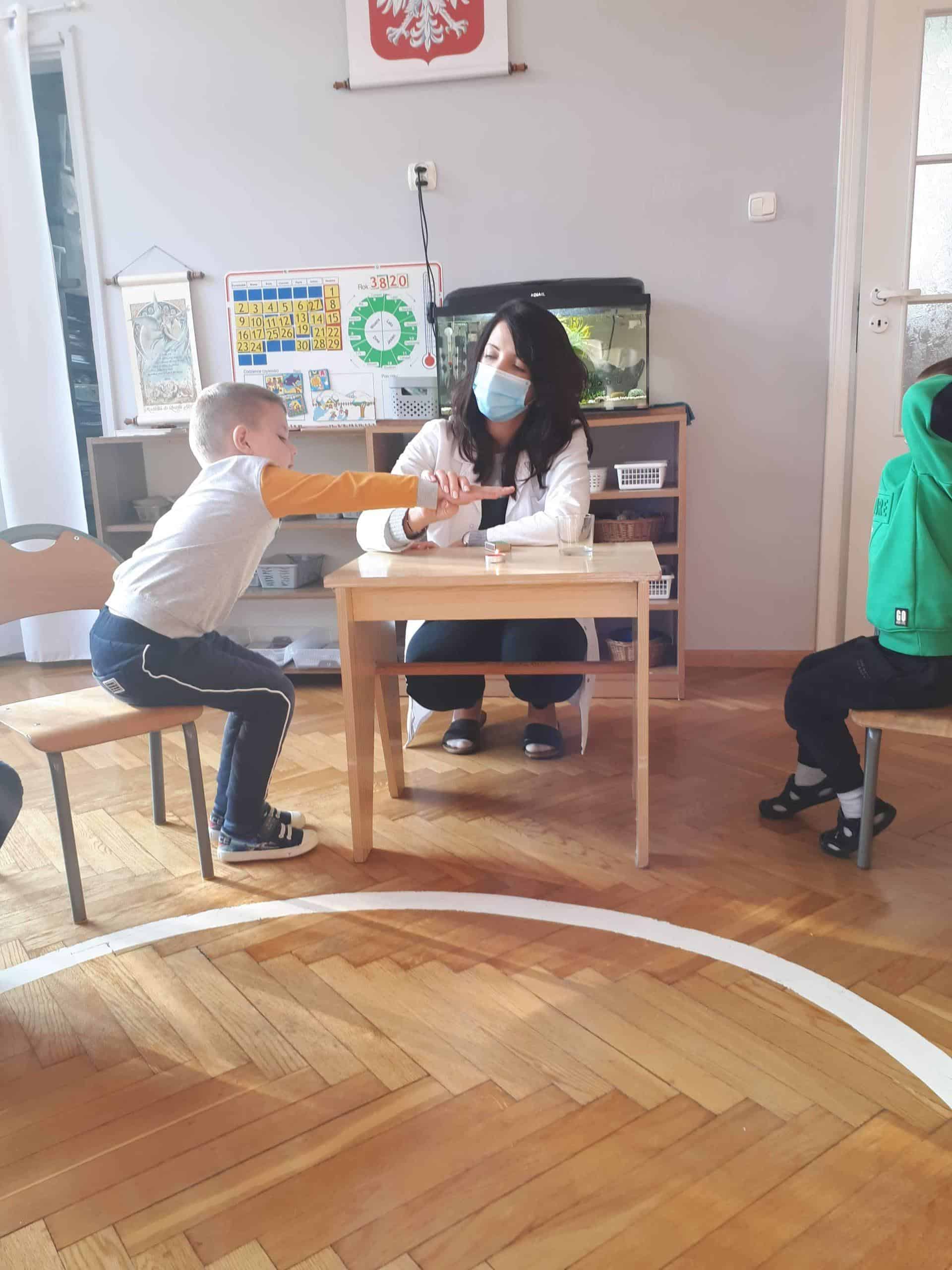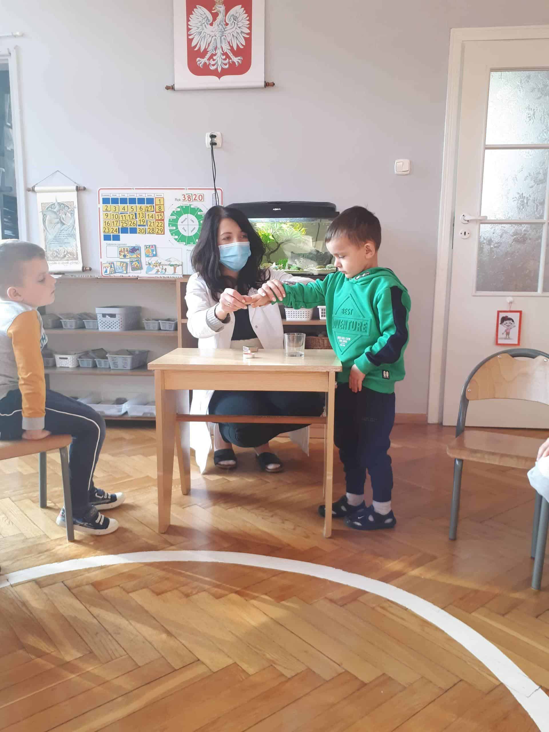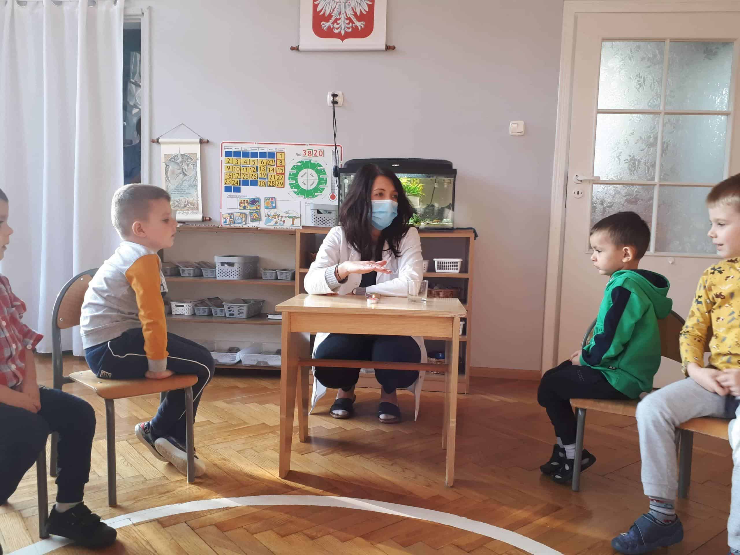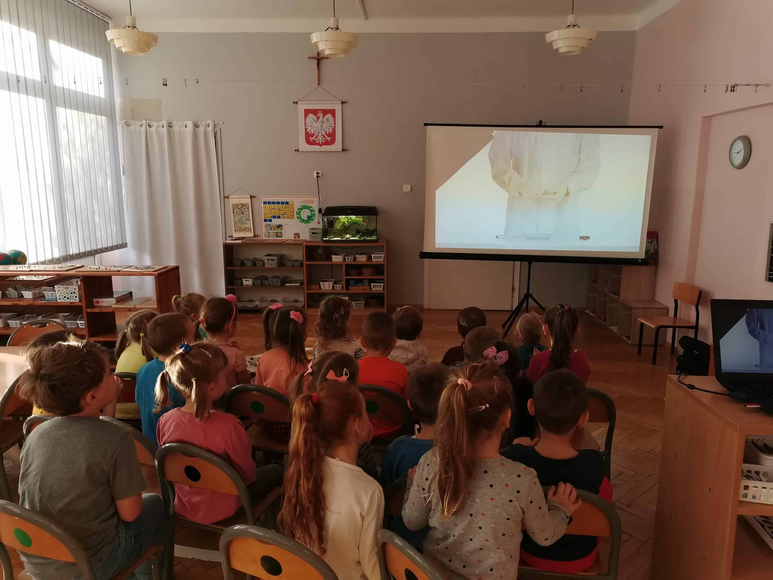 Nie udało nam się wykonać eksperymentu – Powstawanie ognia, ale obejrzeliśmy jego przebieg na ekranie projekcyjnym. Eksperyment był inspiracją do dyskusji na temat ochrony naszej przyrody. Zostawione w lesie śmieci, szklane butelki, które będą niczym lupa, pod wpływem działania promieni słonecznych mogą wywołać pożar lasu. Dzieci stwierdziły, że nigdy nie będą zanieczyszczać naszej planety, bo nie dość, że będzie brudna to jeszcze może się spalić.