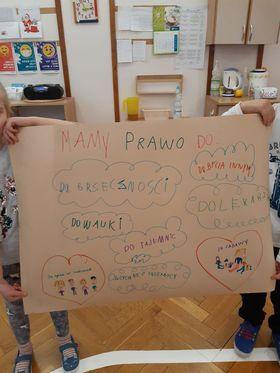 Dzieci obejrzały prezentację multimedialną, która w przystępny i zrozumiały dla nich sposób zapoznała ich z Konwencją Praw Dziecka, poznały swoje prawa i w oparciu o ilustracje próbowały wyrazić swoją interpretację poszczególnych praw. Nauczyciel uświadomił dzieciom, że mają swoje prawa i, że zawsze mogą liczyć na pomoc ze strony dorosłych oraz to, że nie są sami ze swoimi problemami.