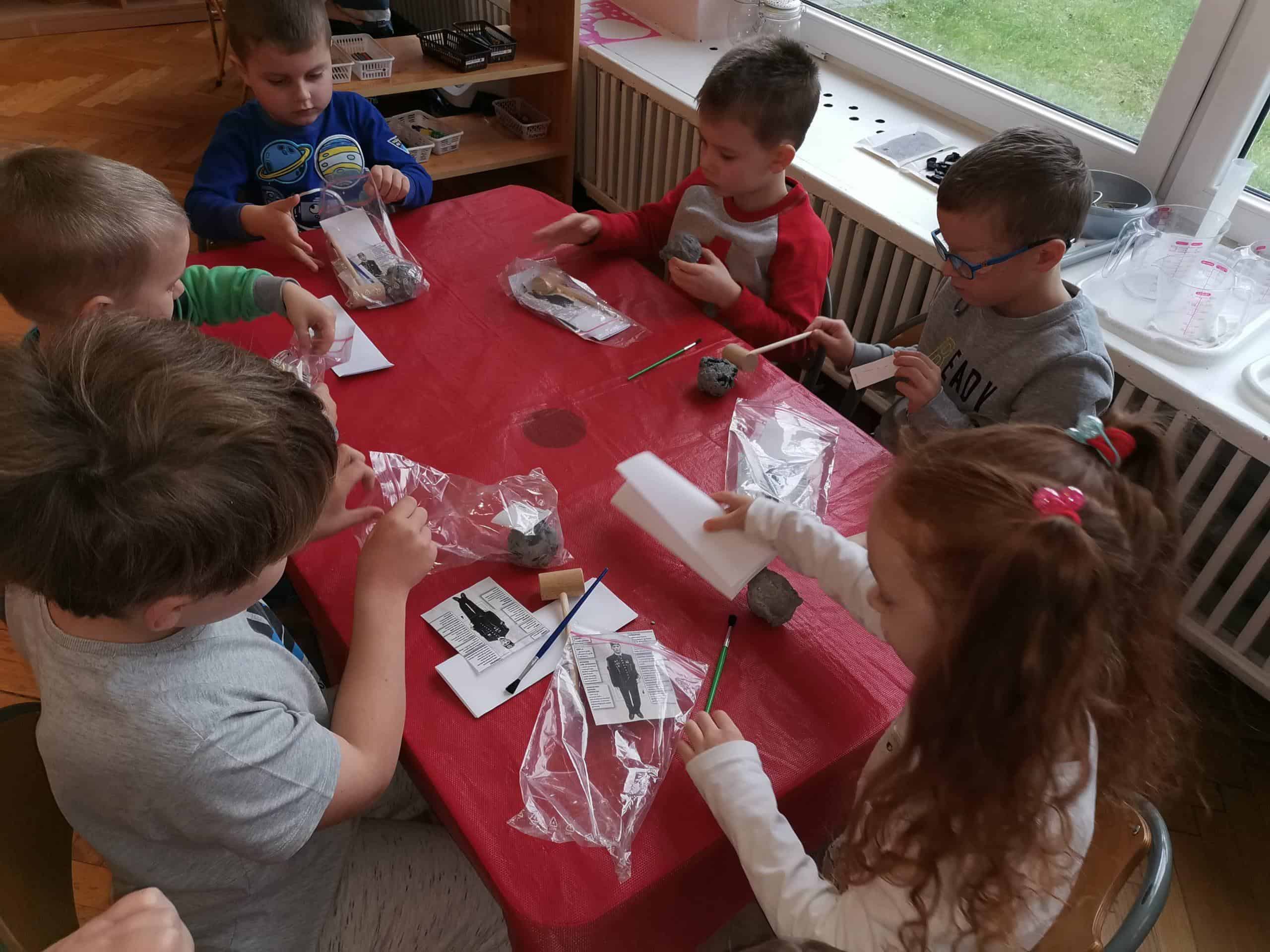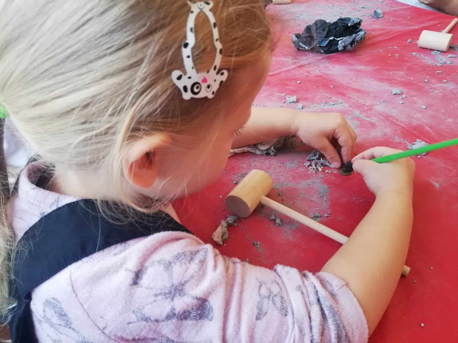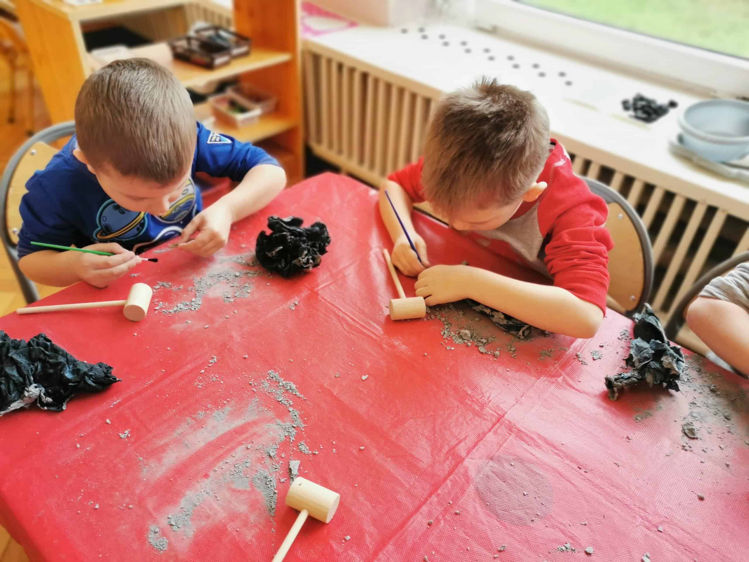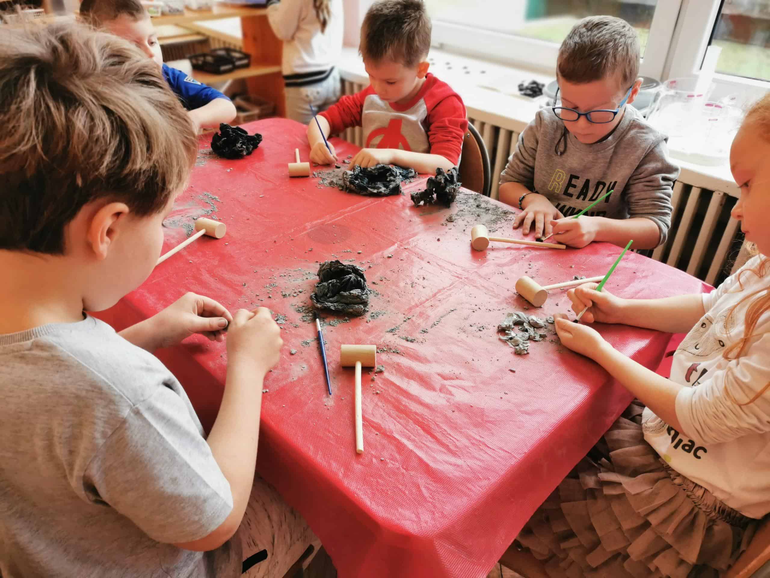 Następnie dzieci stały się prawdziwymi odkrywcami, musiały wydobyć z bryły węgla monety. Młoteczkiem rozbijały węgiel, gdy znalazły monety pędzelkiem oczyszczały je z pyłu. Na zakończenie dzieci odbijały przy użyciu węgla monety na kartce papieru metodą frottage.