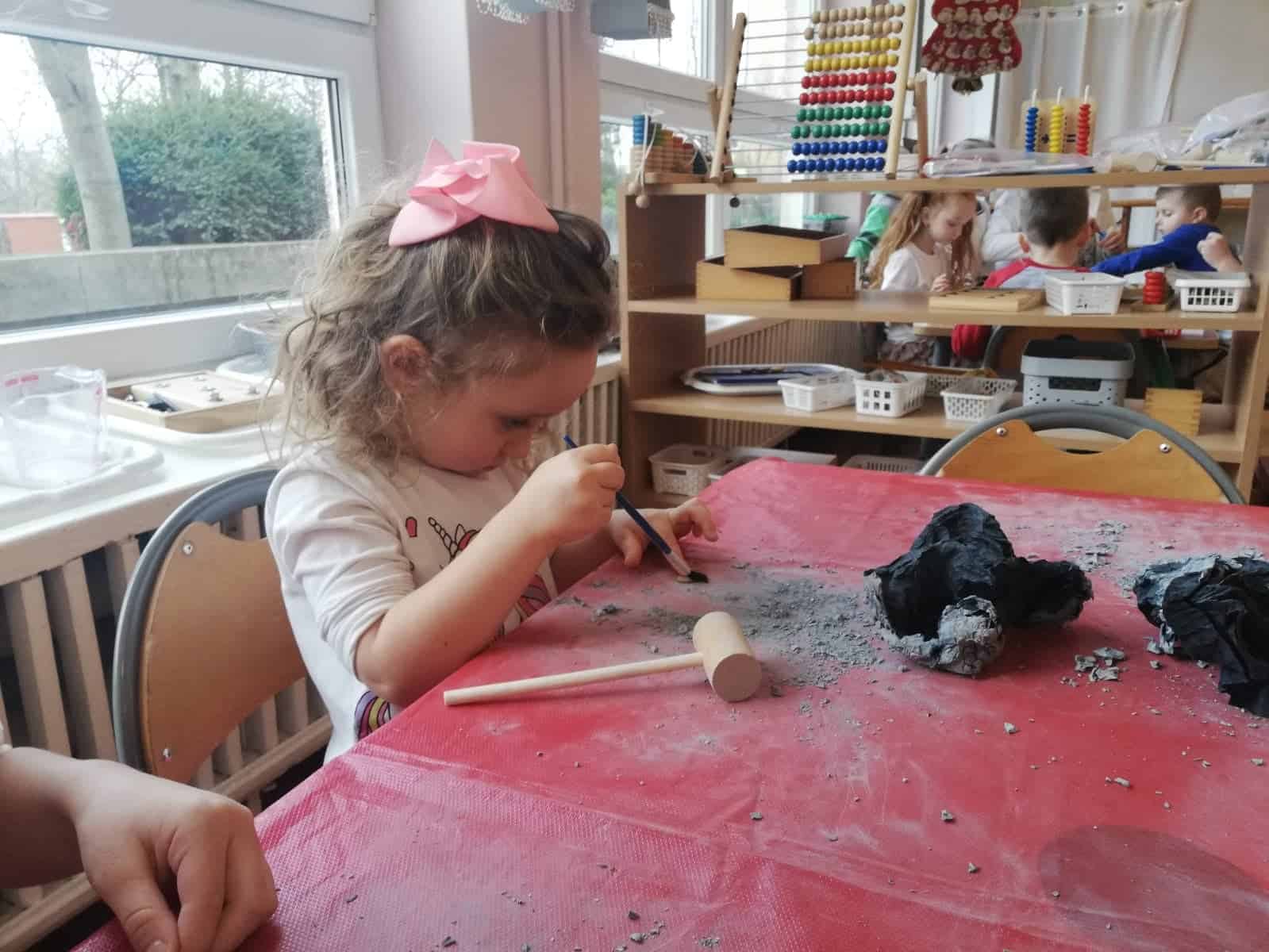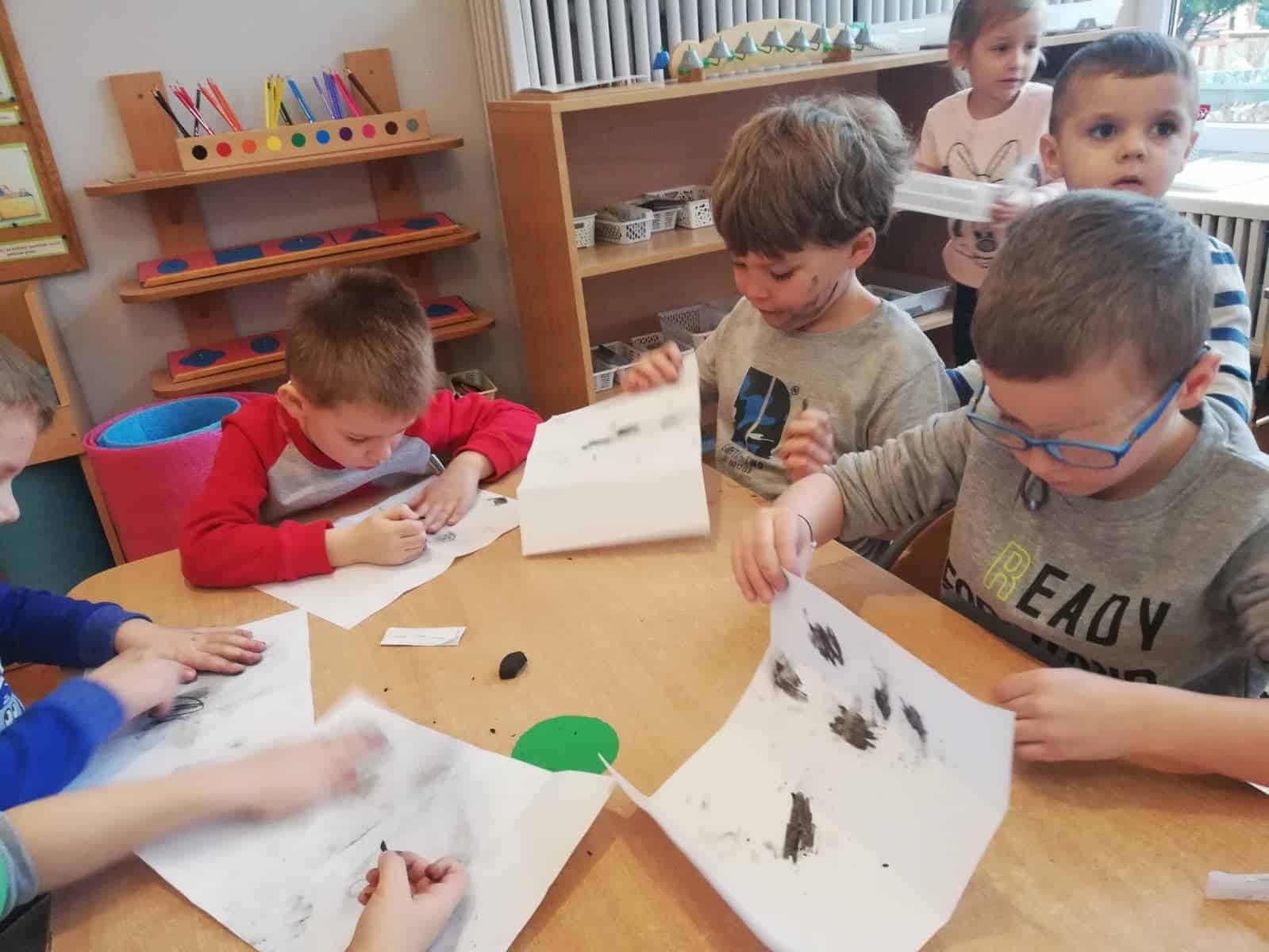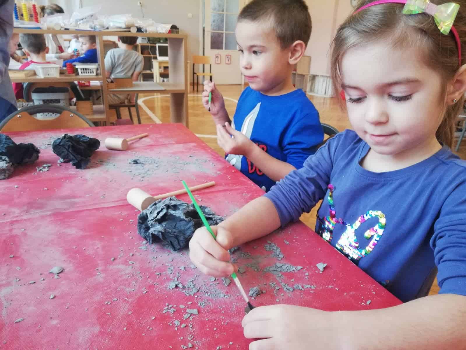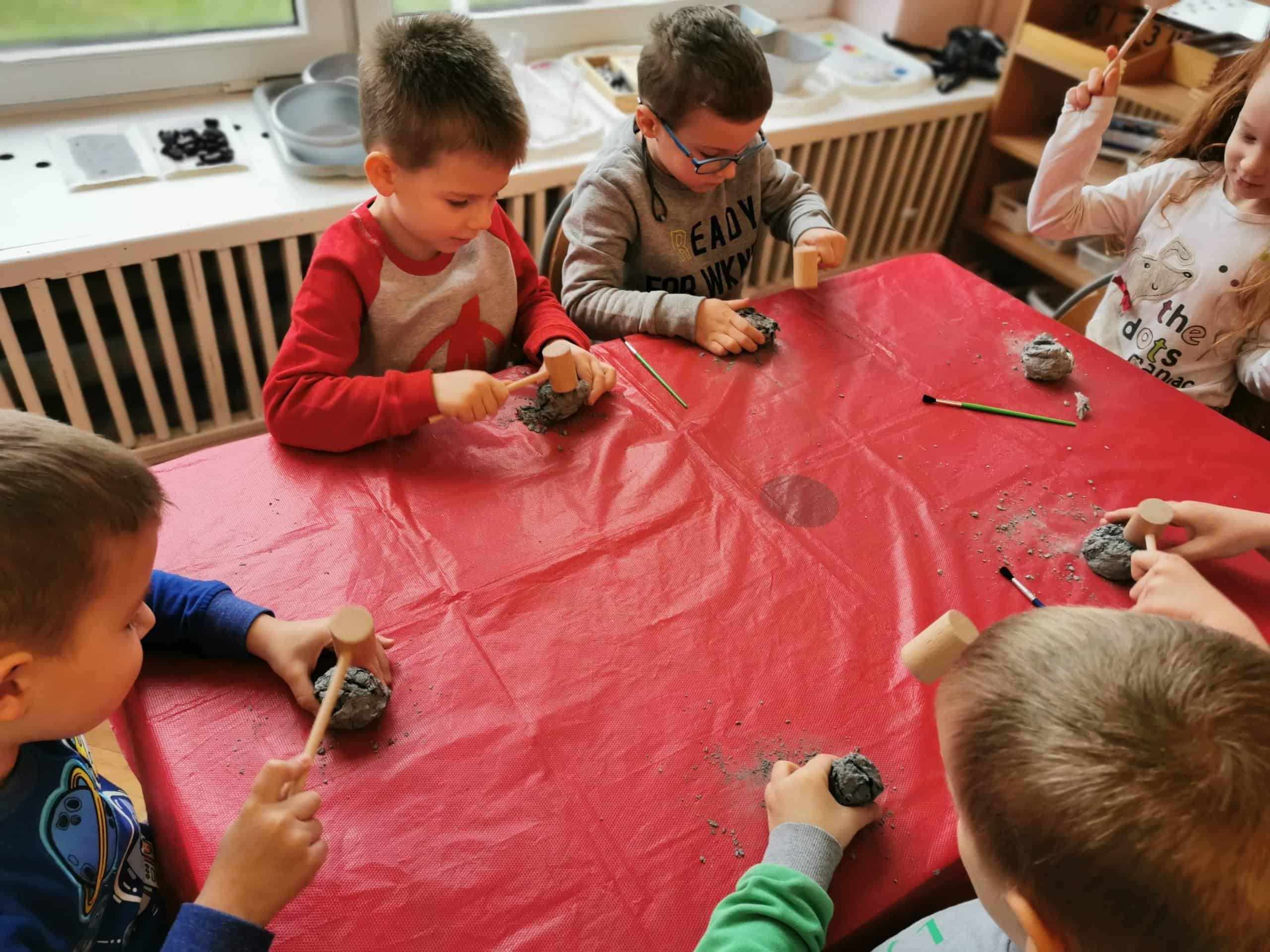 Następnie dzieci stały się prawdziwymi odkrywcami, musiały wydobyć z bryły węgla monety. Młoteczkiem rozbijały węgiel, gdy znalazły monety pędzelkiem oczyszczały je z pyłu. Na zakończenie dzieci odbijały przy użyciu węgla monety na kartce papieru metodą frottage.