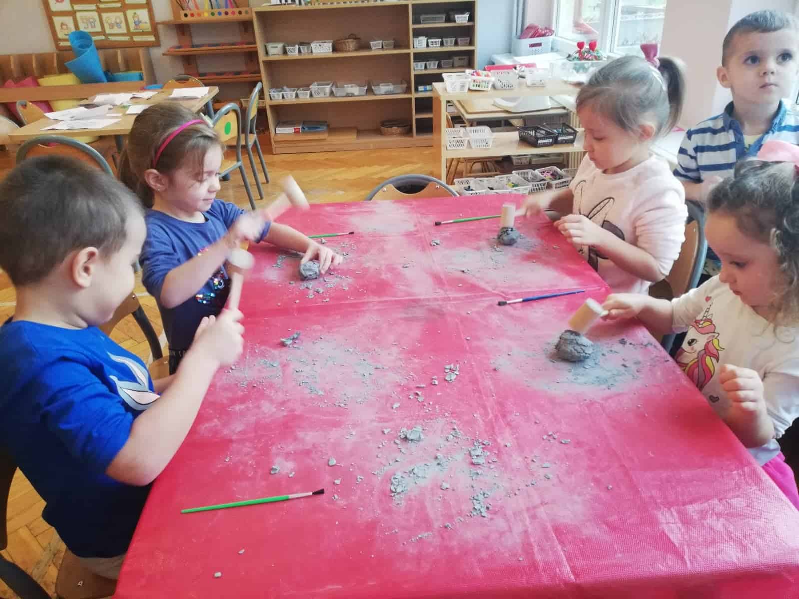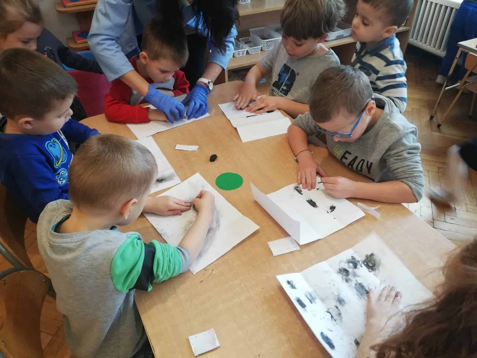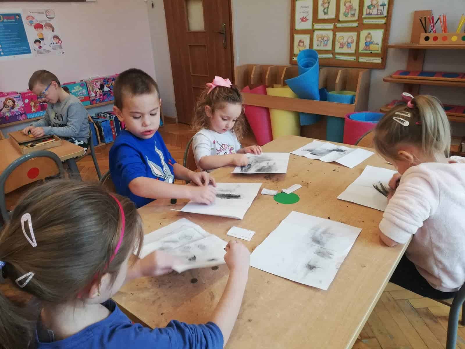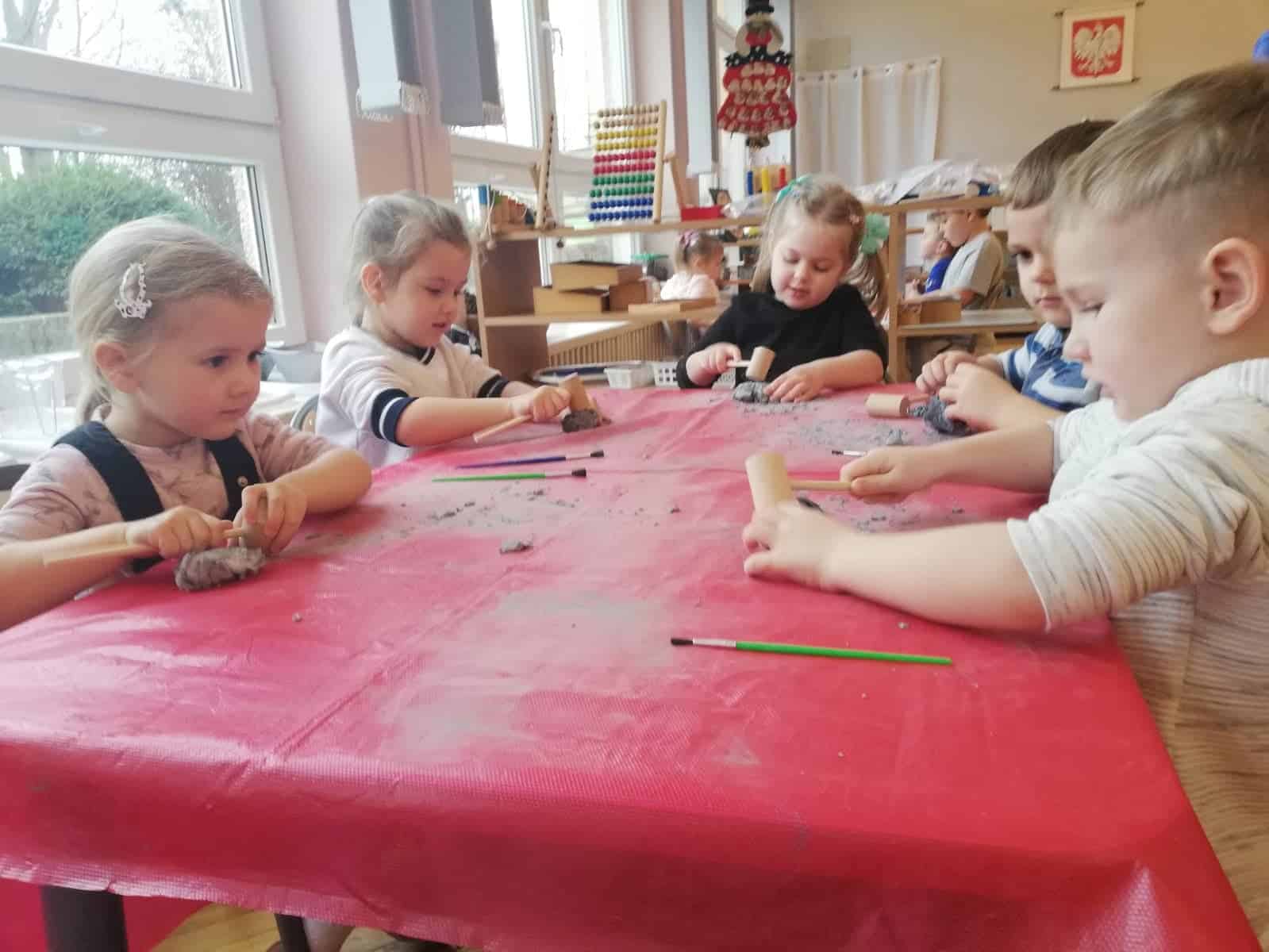 Następnie dzieci stały się prawdziwymi odkrywcami, musiały wydobyć z bryły węgla monety. Młoteczkiem rozbijały węgiel, gdy znalazły monety pędzelkiem oczyszczały je z pyłu. Na zakończenie dzieci odbijały przy użyciu węgla monety na kartce papieru metodą frottage.