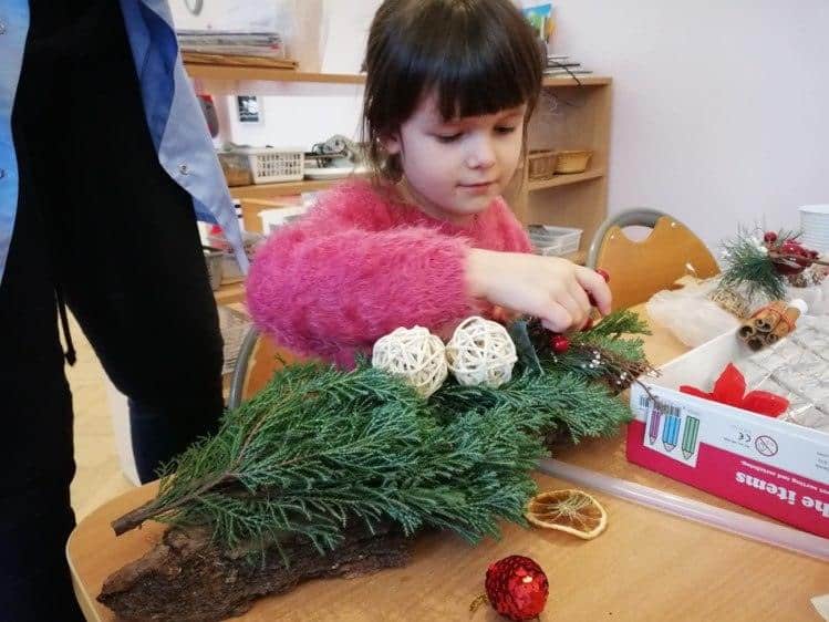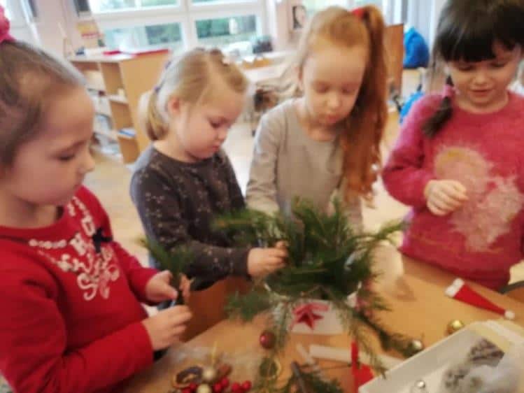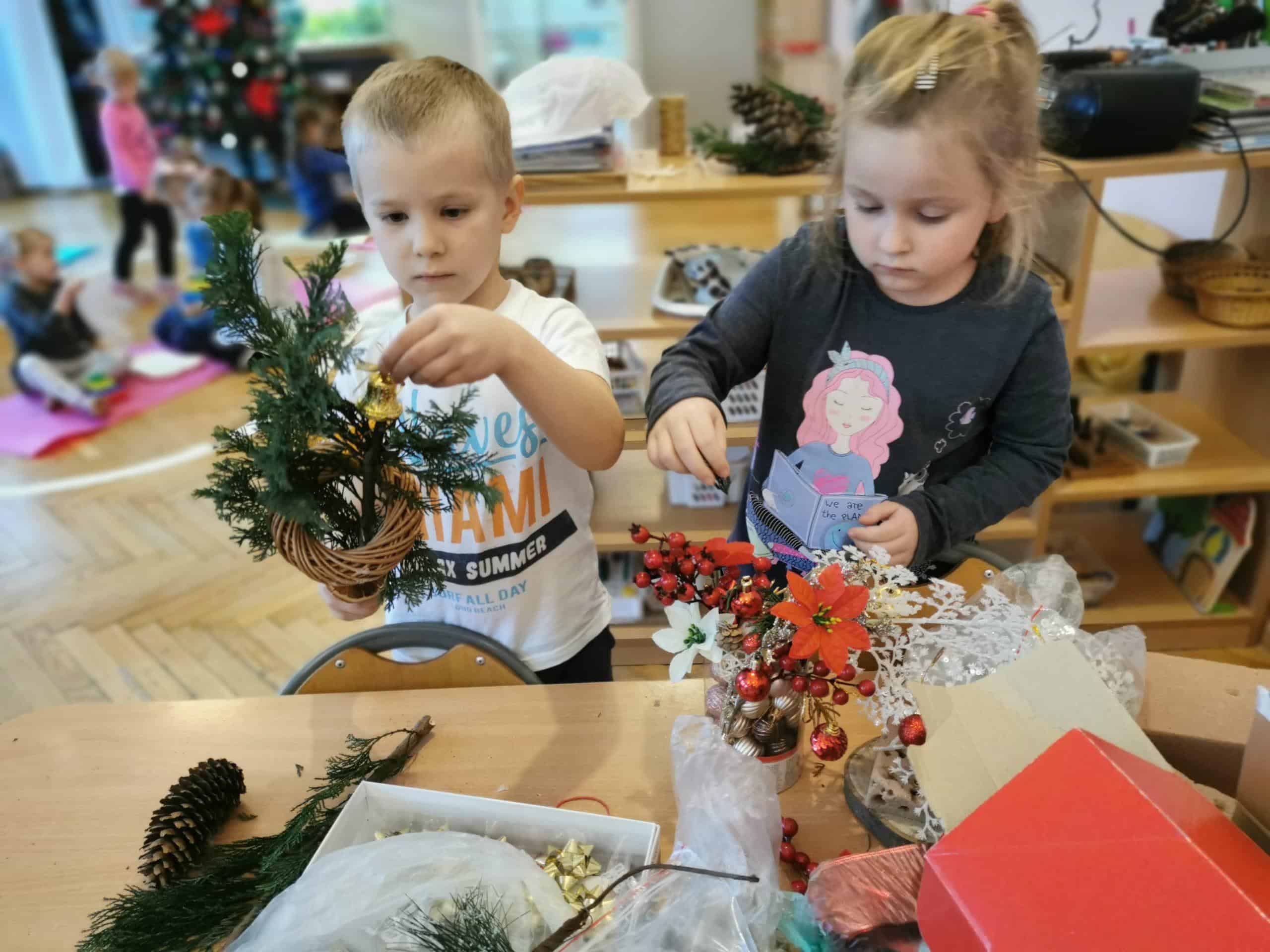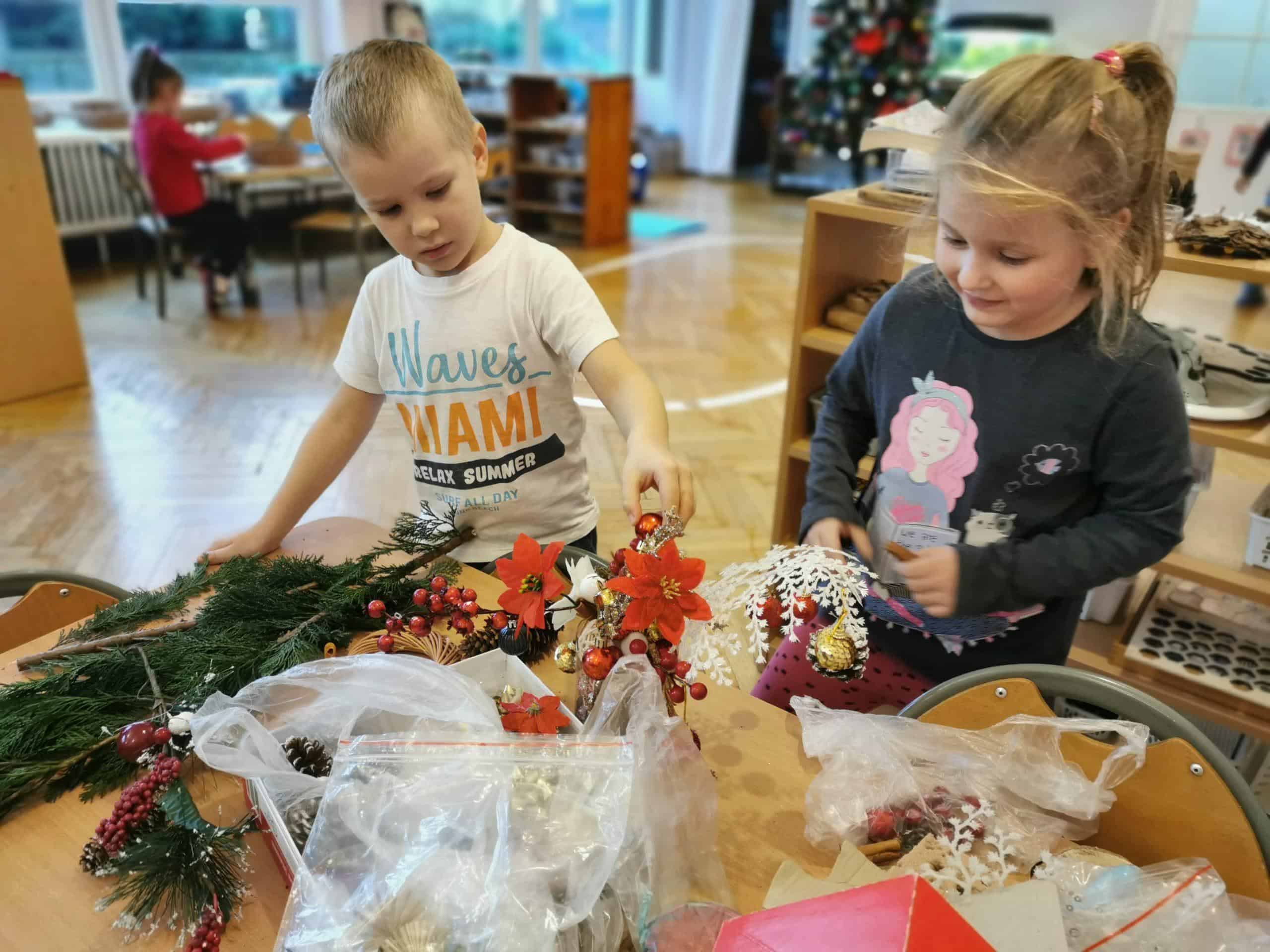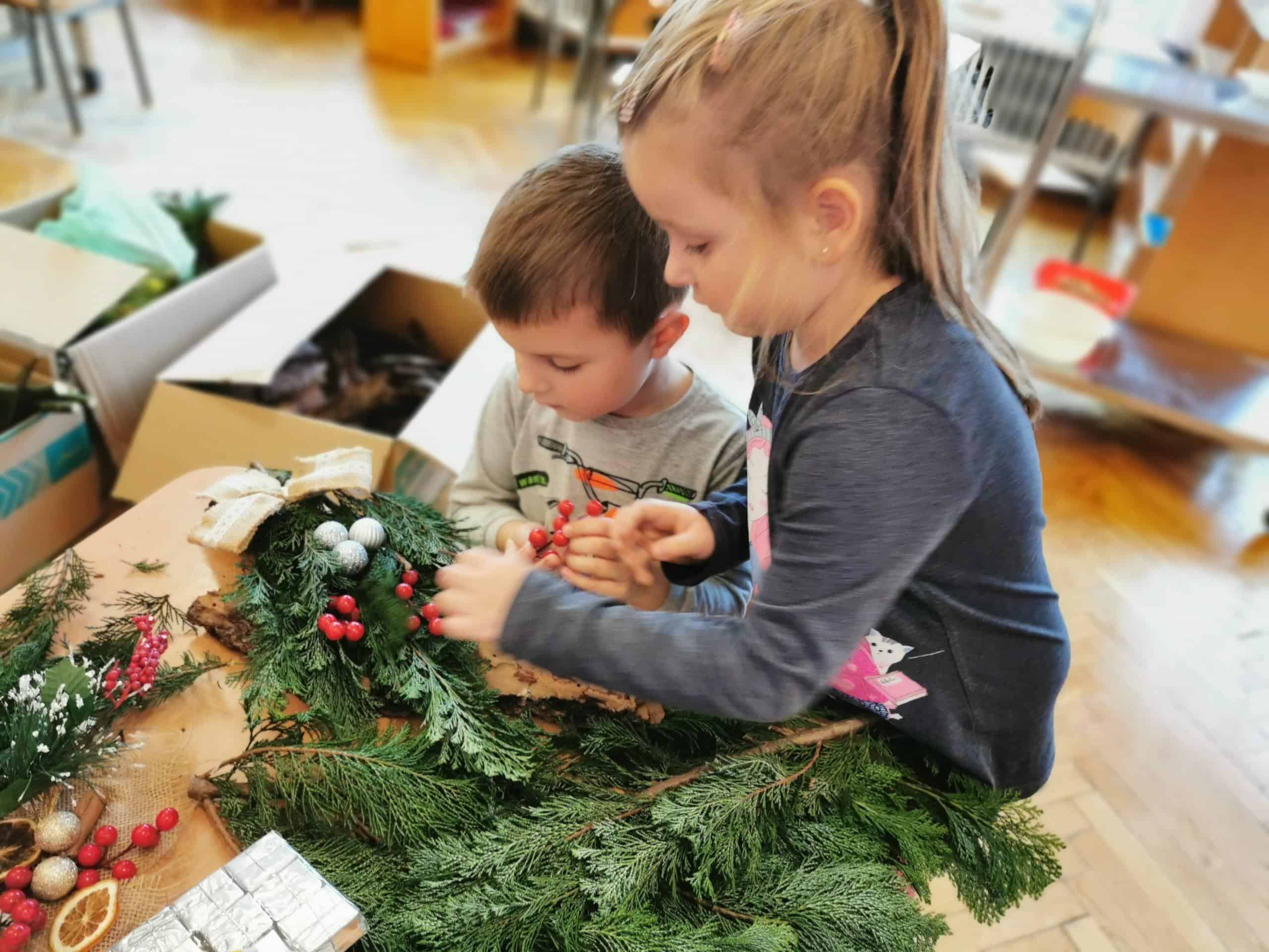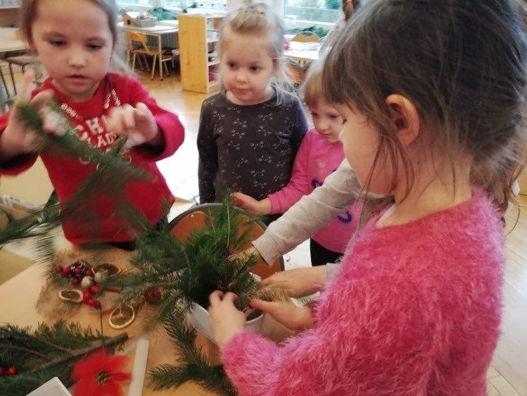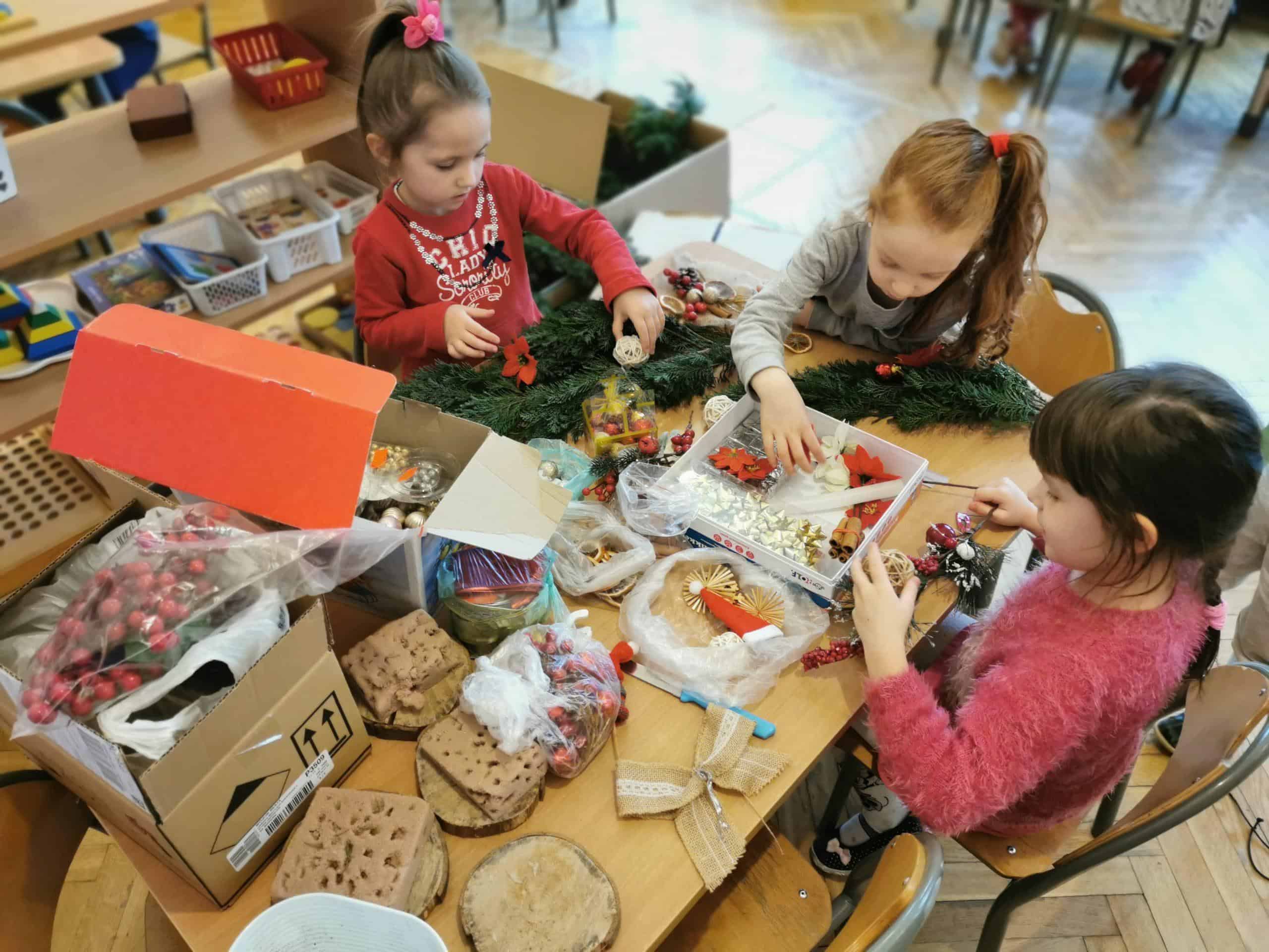 Klimat świąt Bożego Narodzenia można było poczuć podczas tworzenia świątecznych stroików. Na stole pojawiły się zielone gałązki świerku i tui oraz inne potrzebne materiały dekoracyjne: bombki, wstążki, kokardki, szyszki, suszone pomarańcze, laski cynamonu, sztuczne gałązki żurawiny, głogu, itp.