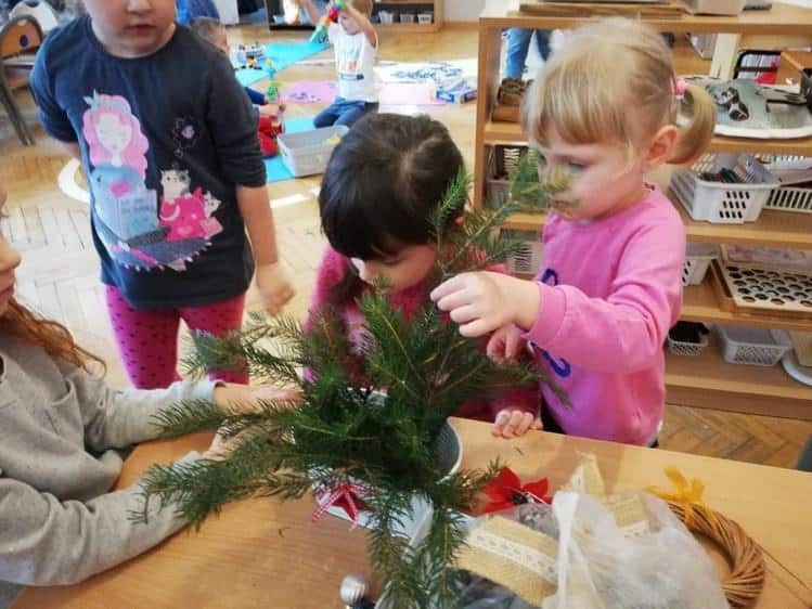 Robienie stroików nie jest łatwym zadaniem i dużą rolę odgrywają tutaj dorośli, bowiem z klejem na gorąco nie ma żartów, ale dzieci na tyle ile mogły to pomogły, wbijały gałązki w gąbkę florystyczną i wkładały elementy dekoracyjne.