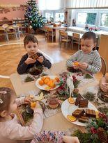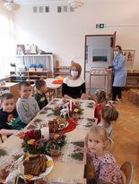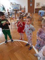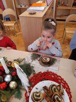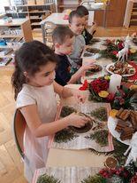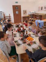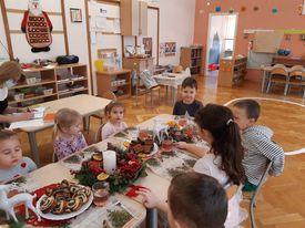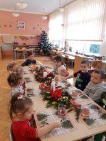 Ponieważ był to okres przedświąteczny praca z dziećmi przebiegała w atmosferze przygotowania się do świąt- dzieci poznały historię Bożego Narodzenia, wysłuchały opowieści od zwiastowania Najświętszej Panny Marii do Objawienia Pańskiego czyli święta Trzech Króli. Uwieńczeniem było ułożenie obrazków historyjki obrazkowej w kolejności występowania wydarzeń. Dzieci z zapałem wykonały choinkę sposobem origami z kół, ćwiczyły motorykę małą podczas wykonywania bombek. Poznały tradycję i symbolikę świąt Bożego Narodzenia. Bardzo dzielnie i znakomicie radziły sobie z licznymi ćwiczeniami i zadaniami z edukacji matematycznej, spostrzeganiem, logicznym myśleniem , a wszystko to w oparciu o tematykę związana ze świętami Bożego Narodzenia. Zarówno dzieci starsze 5-6 latki, jak i dzieci 4-letnie wykonywały ćwiczenia grafomotoryczne, rozwijały swoją kreatywność, logiczne myślenie oraz wykonywały mnóstwo ćwiczeń i zabaw słuchu fonematycznego. Nie obyło się bez różnorodnych ćwiczeń słuchowych, zabaw muzyczno-ruchowych oraz śpiewaniem piosenek o tematyce świątecznej oraz pastorałek.