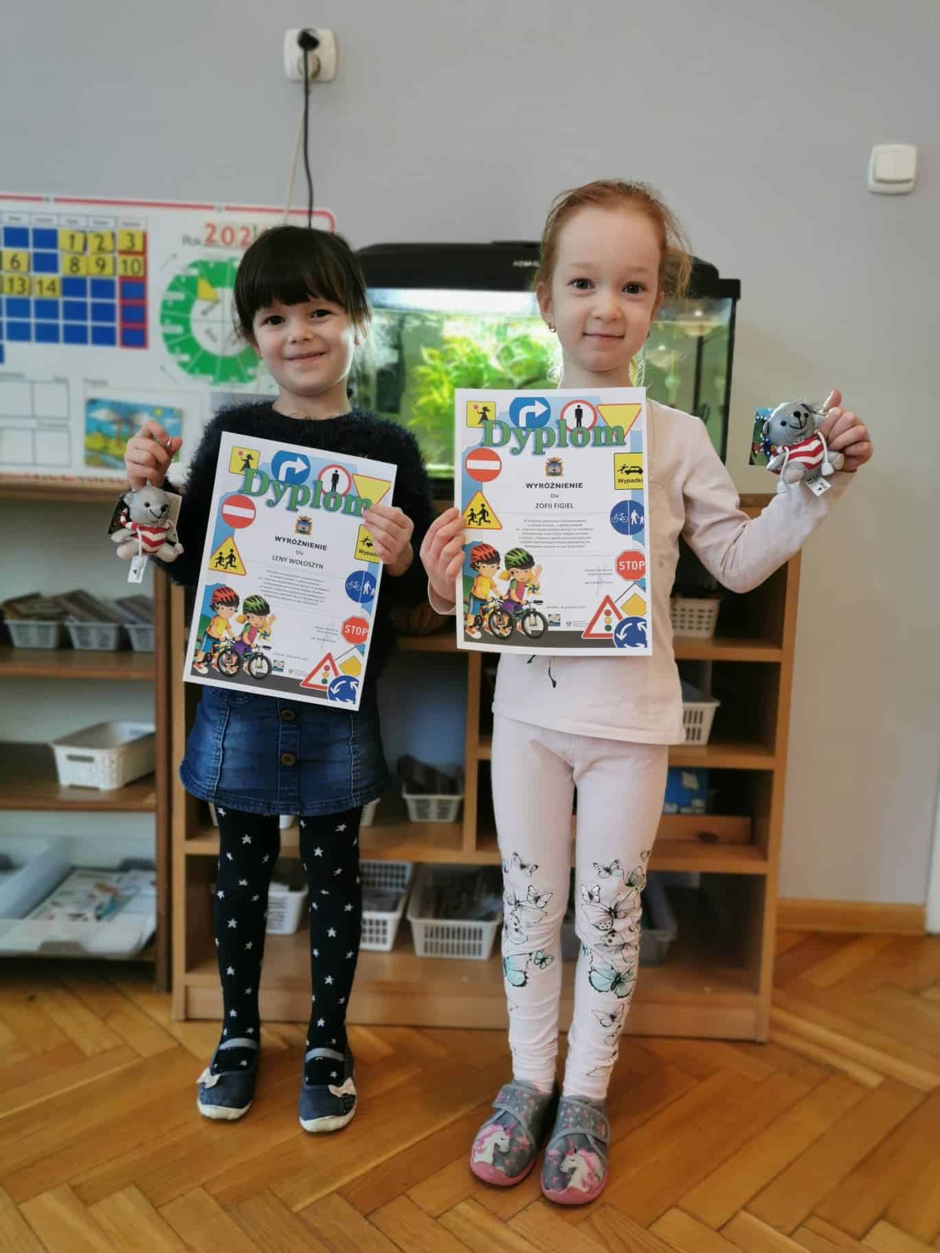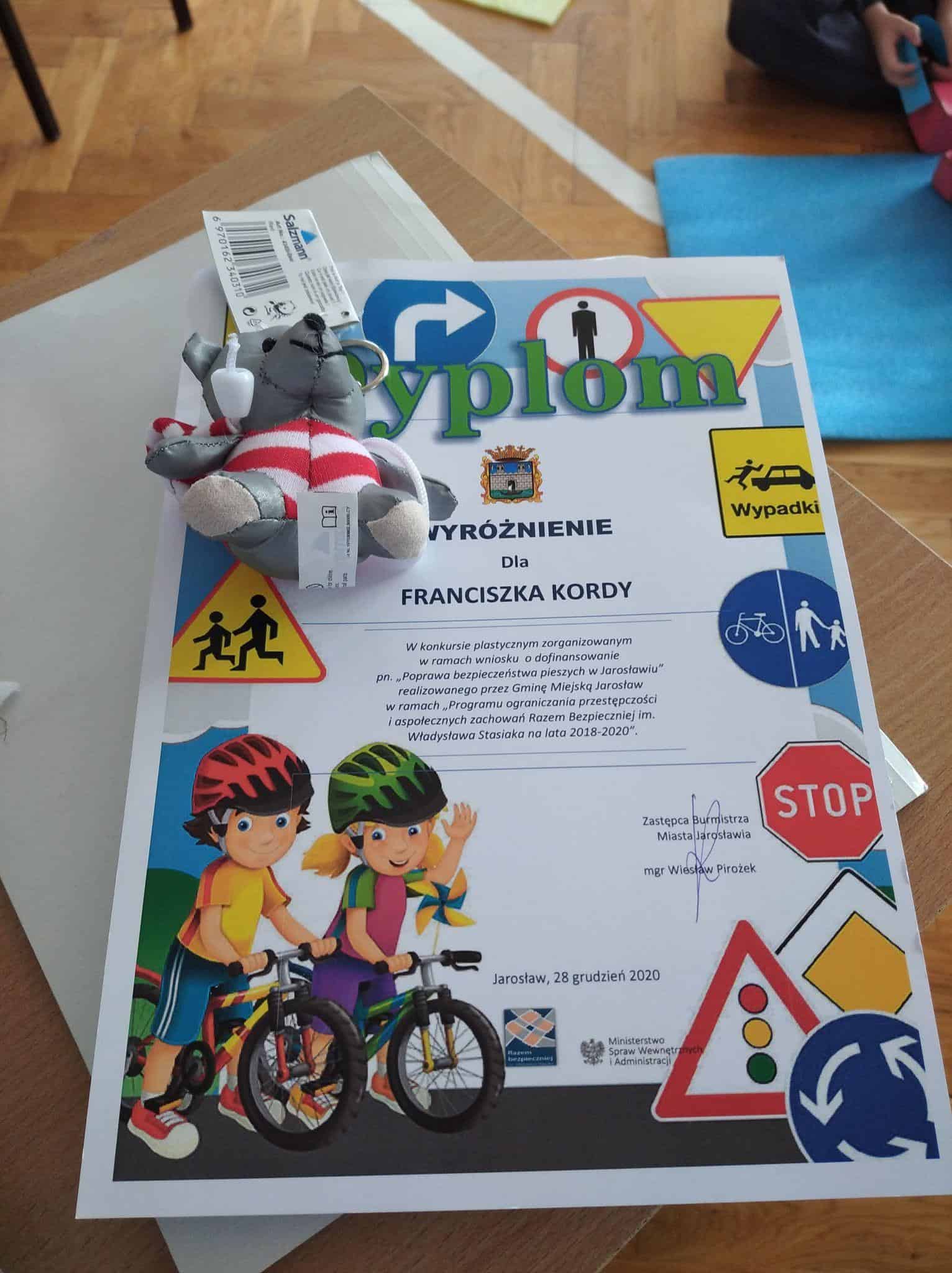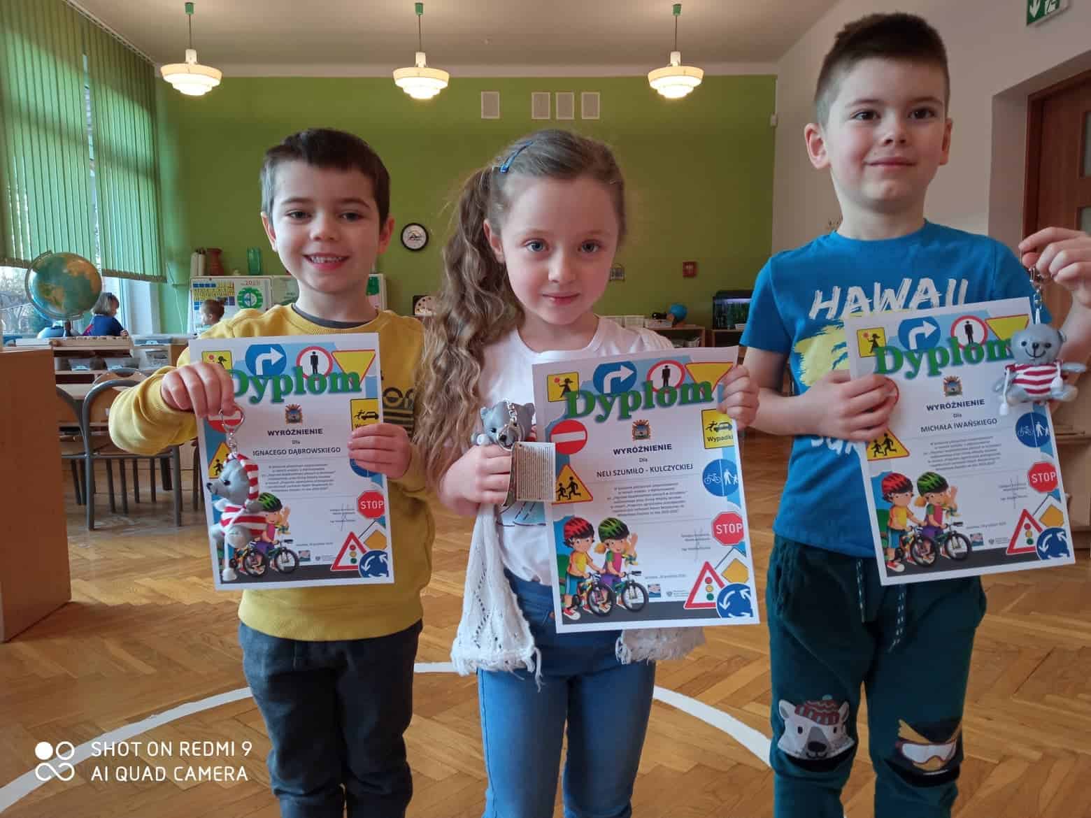 Dzieci, które wzięły udział w konkursie, za swoje twórcze i kreatywne prace, otrzymały dyplomy – wyróżnienia i nagrody w postaci odblaskowych, misiowych breloczków. Wszystkie pozostałe dzieci otrzymały opaski odblaskowe.
