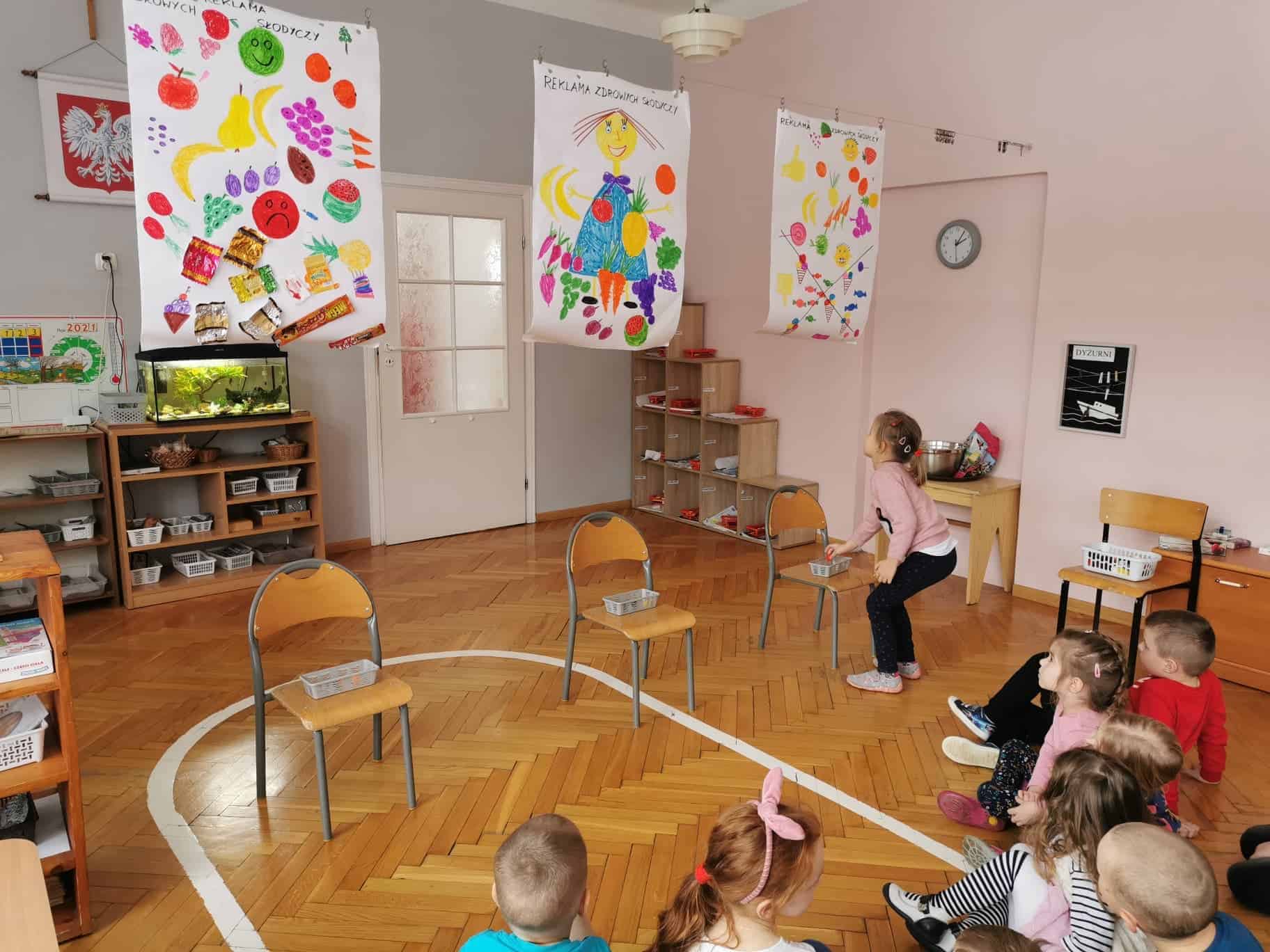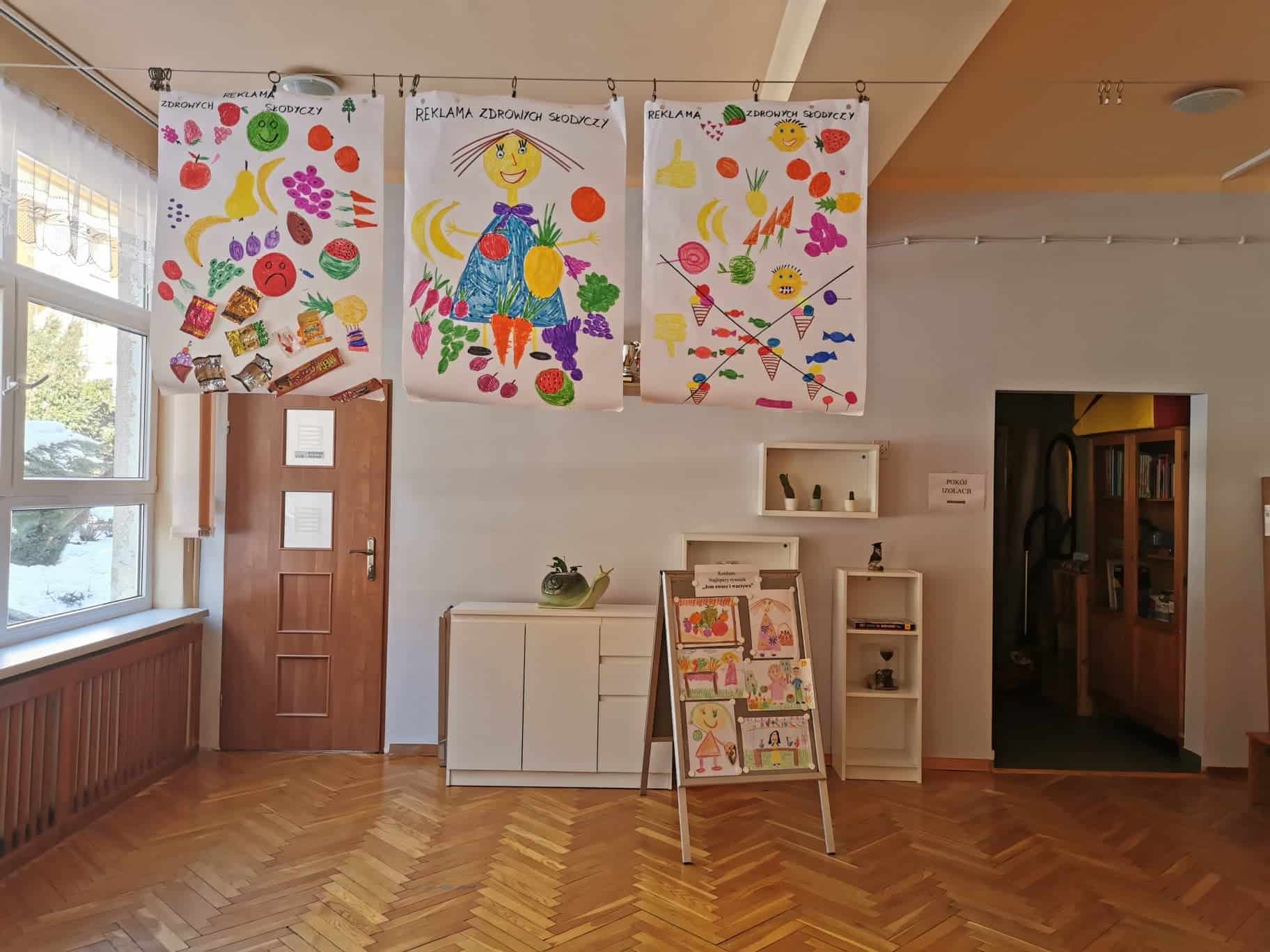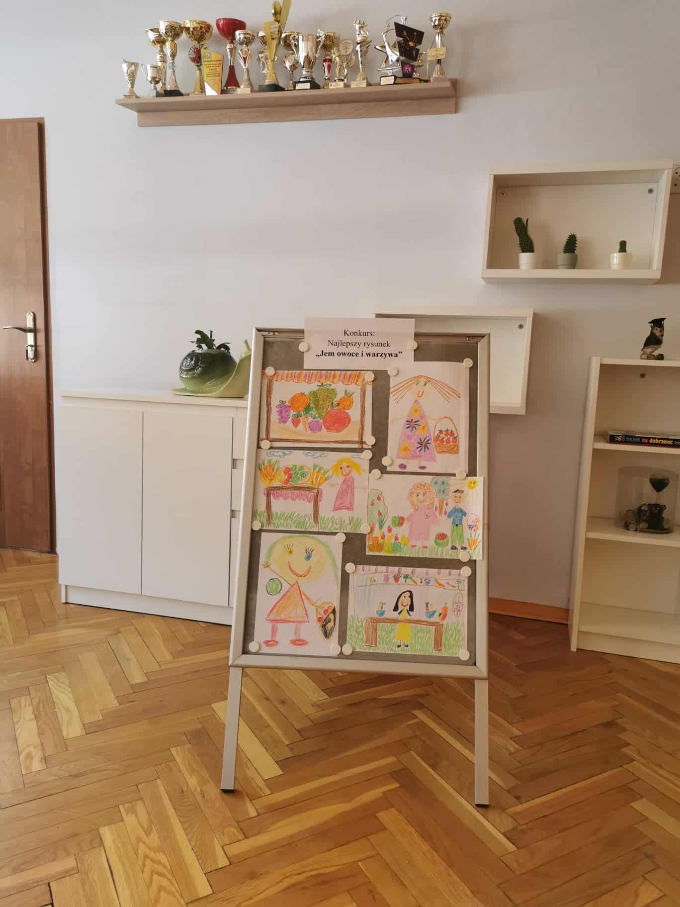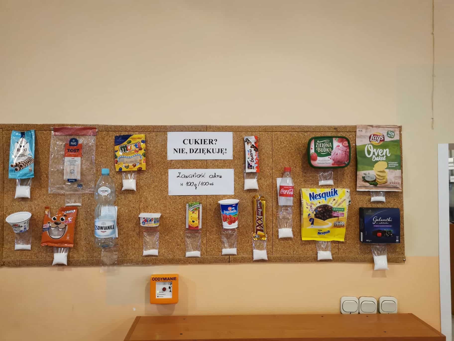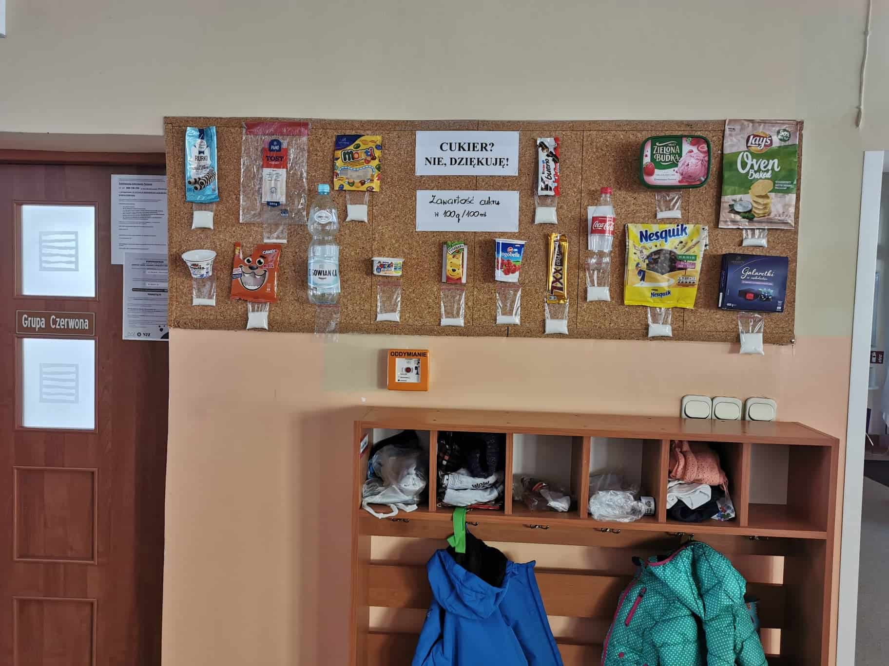 Ze względu na trwającą sytuację epidemiologiczną w kraju wszelkie działania edukacyjne odbywają się w obrębie swoich grup. Aby podzielić się zdobytą wiedzą z przedszkolakami z innych grup oraz pracownikami przedszkola wyeksponowaliśmy w głównym holu plakaty będące reklamą zdrowych słodyczy, tablicę z pracami na temat „Jem owoce i warzywa”, a także przygotowaliśmy gazetkę na temat Cukier? Nie, dziękuję! – przedstawiającą zawartość cukru w niektórych produktach spożywczych. Główny hol to zdecydowanie najlepsze miejsce, bowiem każdy, codziennie tamtędy przechodzi nawet kilka razy.