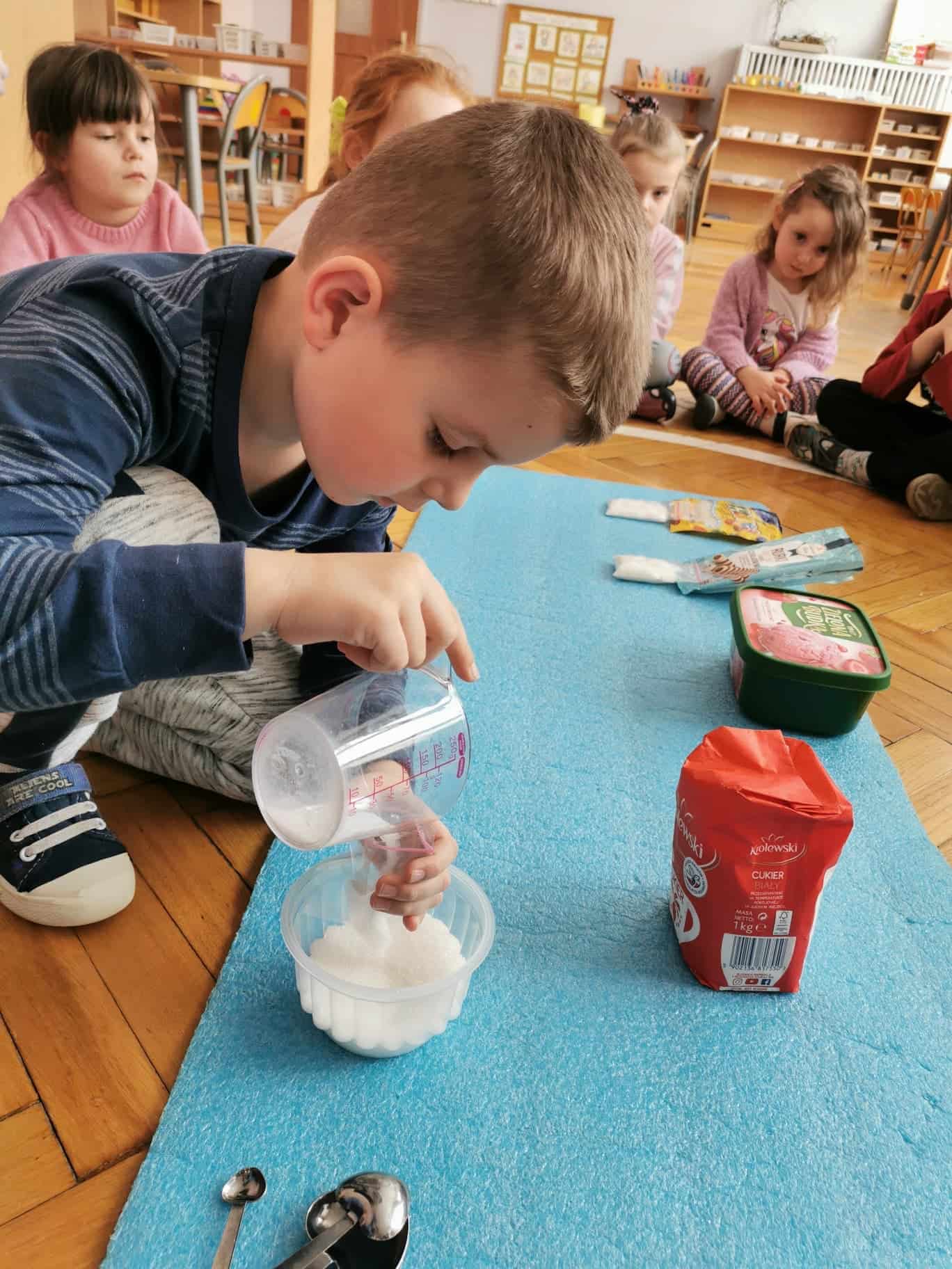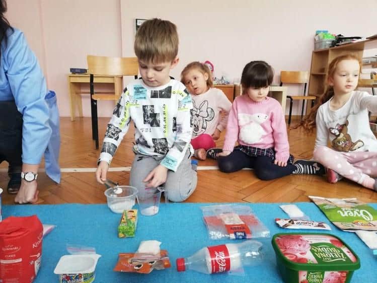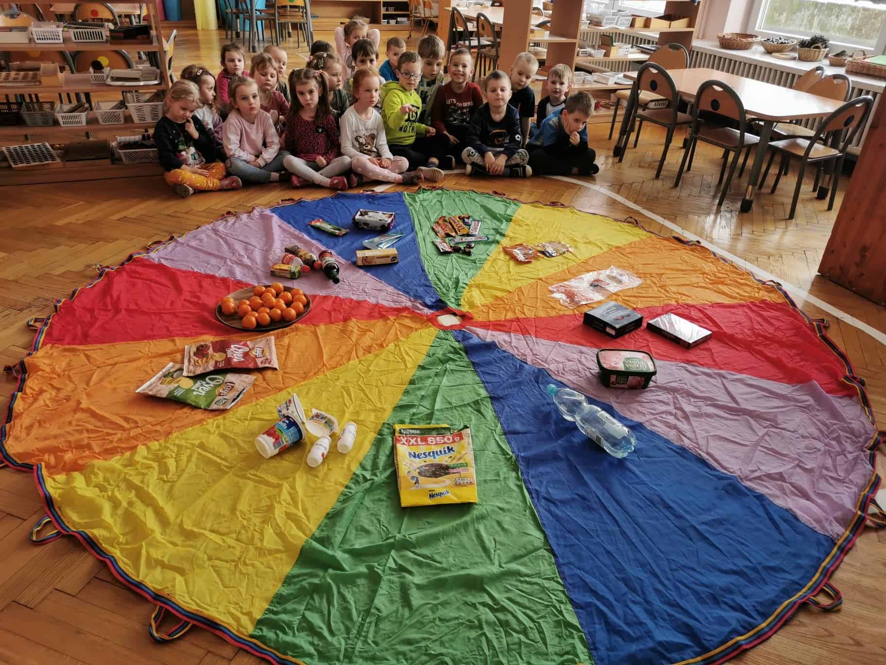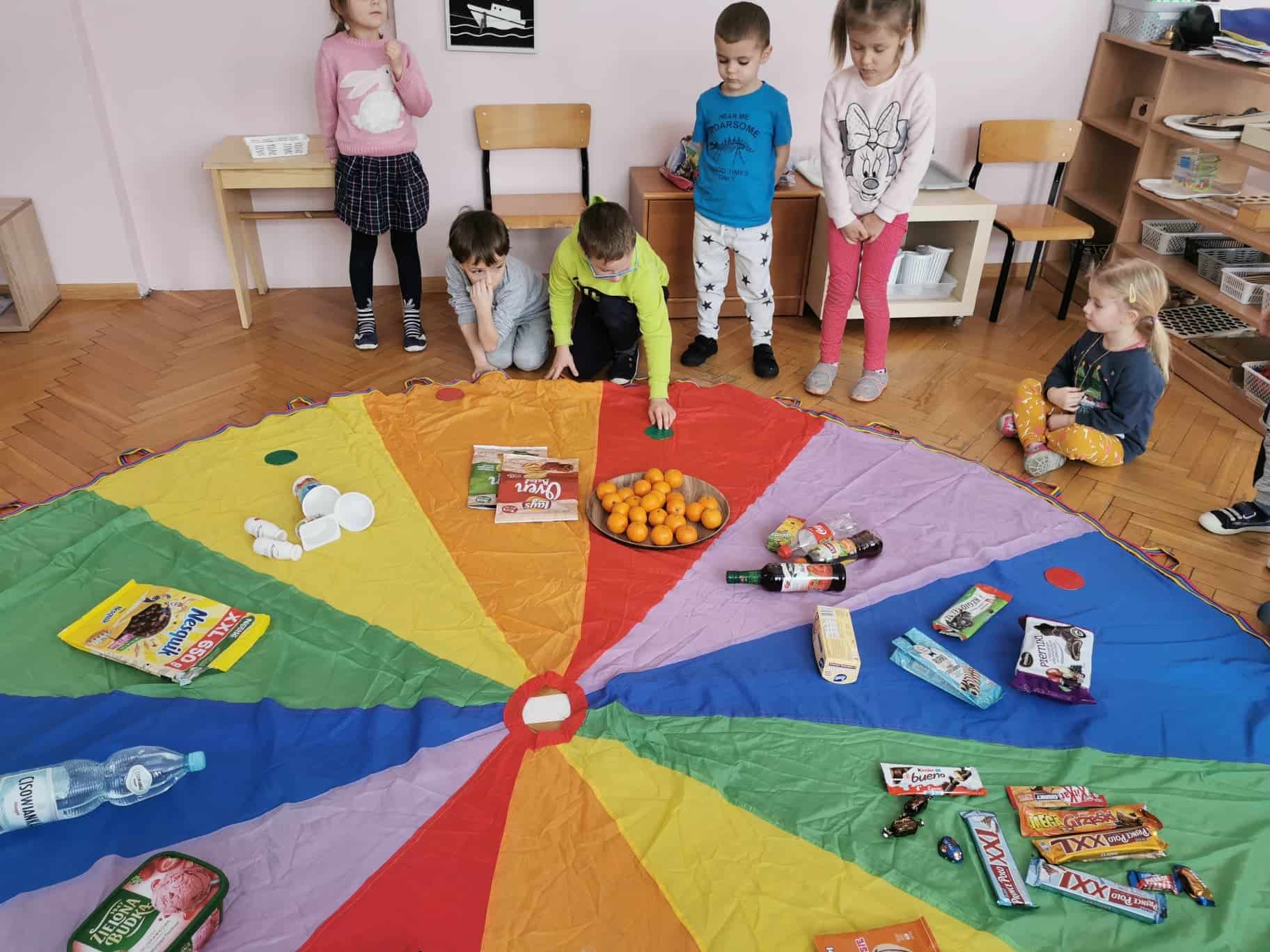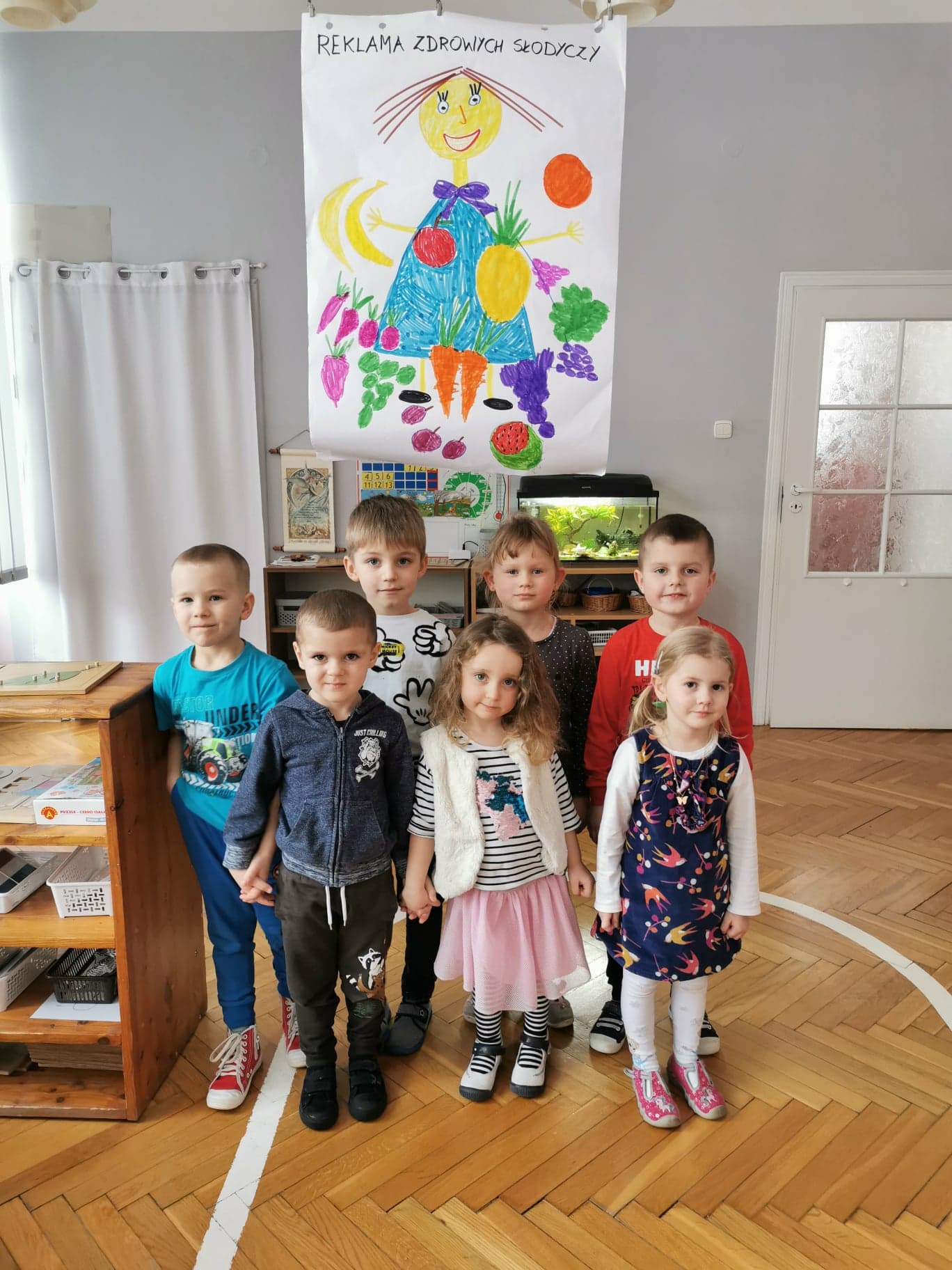 Ze względu na trwającą sytuację epidemiologiczną w kraju wszelkie działania edukacyjne odbywają się w obrębie swoich grup. Aby podzielić się zdobytą wiedzą z przedszkolakami z innych grup oraz pracownikami przedszkola wyeksponowaliśmy w głównym holu plakaty będące reklamą zdrowych słodyczy, tablicę z pracami na temat „Jem owoce i warzywa”, a także przygotowaliśmy gazetkę na temat Cukier? Nie, dziękuję! – przedstawiającą zawartość cukru w niektórych produktach spożywczych. Główny hol to zdecydowanie najlepsze miejsce, bowiem każdy, codziennie tamtędy przechodzi nawet kilka razy.