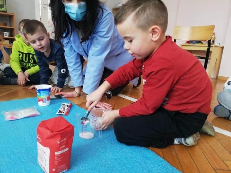 Następnie zastanawialiśmy się co jest zdrowe w naszej diecie, a co nie. Rozmawialiśmy na temat szkód, jakie może poczynić cukier w organizmie człowieka. Dzieci na podstawie planszy zobaczyły produkty o różnej kaloryczności np. 1,5 tabliczki czekolady ma tyle samo kalorii co ok. 12 jabłek, ok. 32 pomidorów, dwudaniowy obiad (zupa, ziemniaki, kotlet, surówka). Stąd też wiadomo, że najłatwiej przytyć jedząc słodycze. Następnie przedszkolaki układały wycięte z gazet ilustracje produktów spożywczych na odpowiednich wagonach dwóch pociągów. Jeden pociąg jechał do Krainy Zdrowia, a drugi do Niezdrowej Krainy. Po tym zadaniu, aby się trochę rozruszać każde dziecko wybrało się własnym Zdrowolotem do Tęczowej Krainy. Na „kolorowych przystankach” znajdowały się różne produkty. Dzieci miały ocenić poprzez położenie czerwonego, albo zielonego kółeczka, czy są one zdrowe, czy nie. Czerwone koło oznaczało, że są niezdrowe, a zielone zdrowe. To zadanie sprawiło przedszkolakom dużo radości. Następnie mierzyliśmy za pomocą 5 gramowej łyżeczki zawartość cukru w różnych produktach spożywczych. Po odczytaniu z opakowania zawartości cukru przez nauczyciela, dzieci odmierzały cukier do pojemnika, a następnie wsypywały go do woreczków strunowych. Woreczki z cukrem układaliśmy pod opakowaniami. Zadanie to uzmysłowiło wszystkim jak dużo cukru jemy, nie zdając sobie z tego sprawy. Dzieci stwierdziły, że muszą ograniczyć słodycze. Na zakończenie lekcji nauczyliśmy się piosenki „Ruch i podskok”, do której wykonywaliśmy odpowiednie ruchy adekwatne do treści. Podsumowaniem lekcji było wykonanie karty pracy Cukier? Nie, dziękuję!