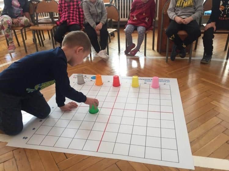 Do pierwszych zabaw i ćwiczeń wykorzystujemy matę edukacyjną z kolorowymi kubeczkami i symbolami graficznymi. Układamy je na płaszczyźnie według własnych pomysłów lub według kodu zaproponowanego przez nauczyciela.