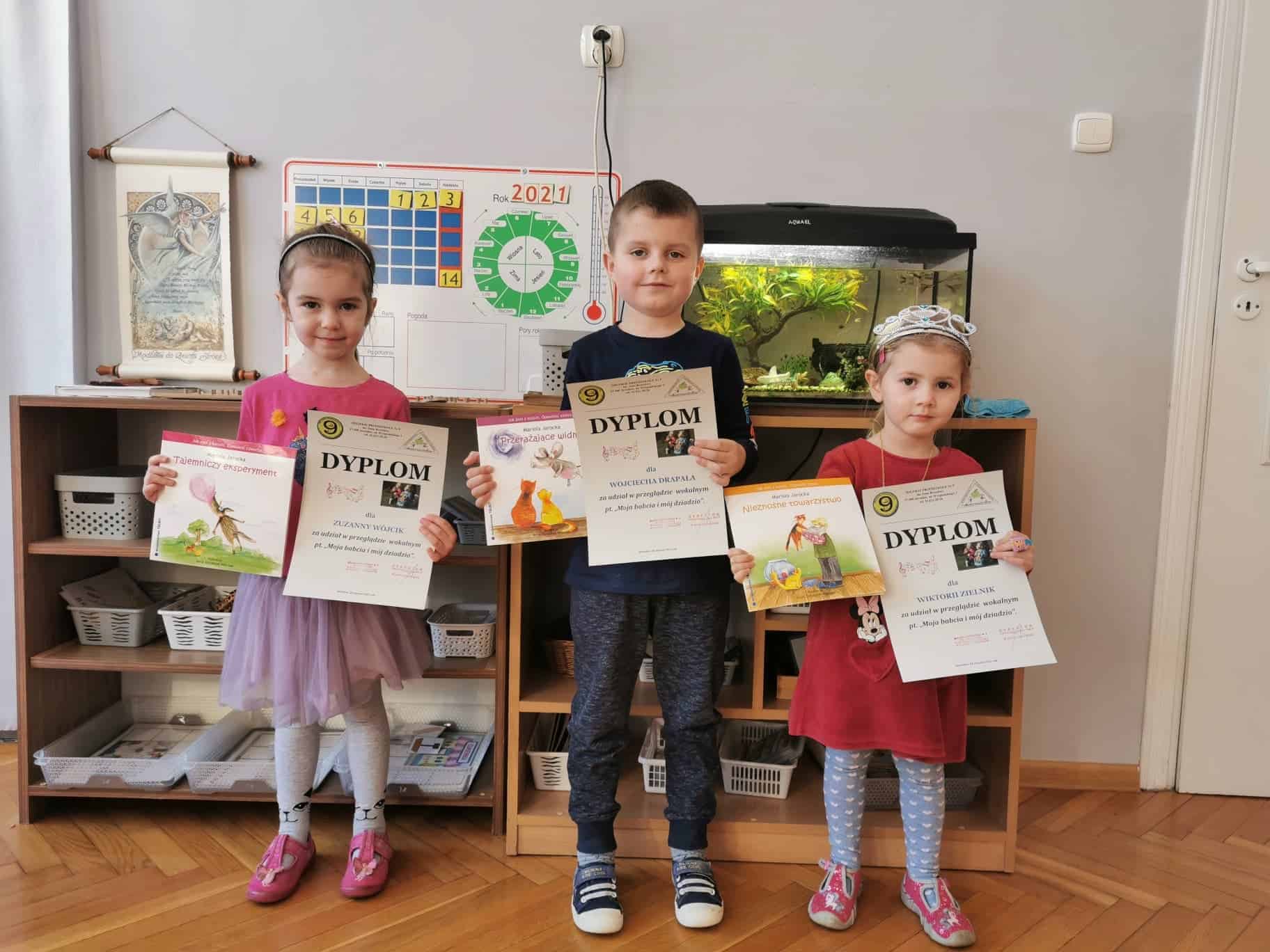 Miejskie Przedszkole nr 9 w Jarosławiu zorganizowało Przegląd wokalny „Moja babcia i mój dziadzio”, w którym oczywiście wzięliśmy udział. Zadaniem było nagranie piosenki związanej z tematem indywidualnie lub w zespole. Grupę Czerwoną reprezentował zespół wokalny w składzie Wiktorcia, Zuzia i Wojtuś, którzy zaprezentowali się w piosence pt. „Babciu, dziadku”. Muszę powiedzieć, że przedszkolaki poradziły sobie świetnie, choć czasu było niewiele. Dzieci za swoją pracę i umiejętności otrzymały dyplomy oraz książeczki.
