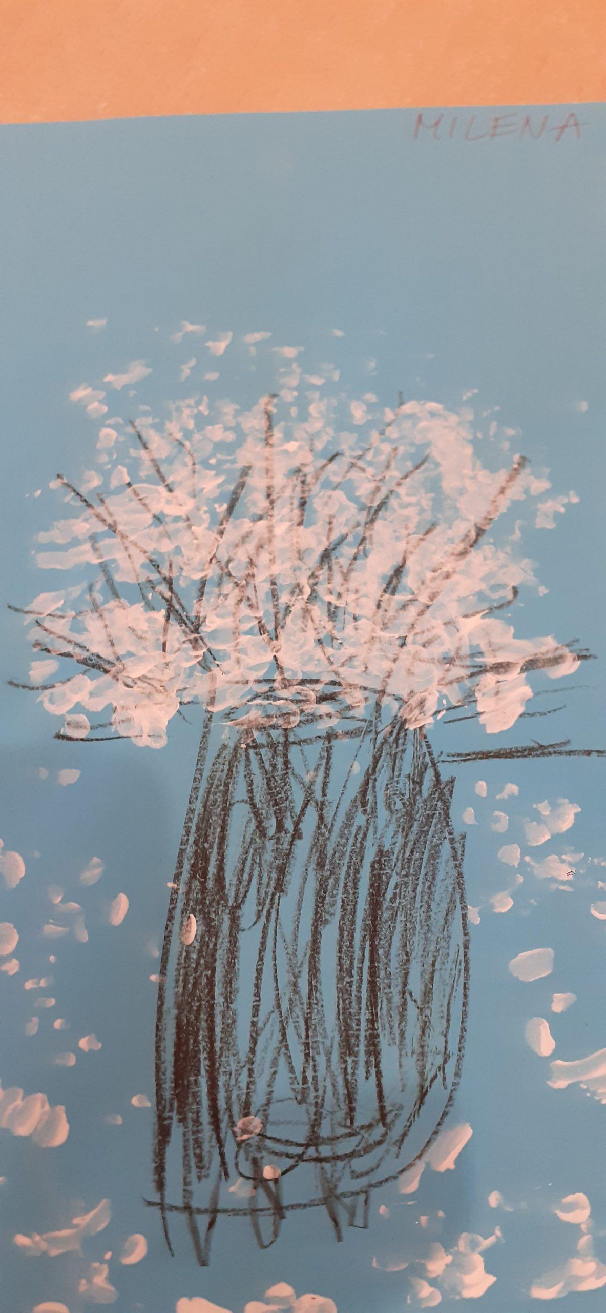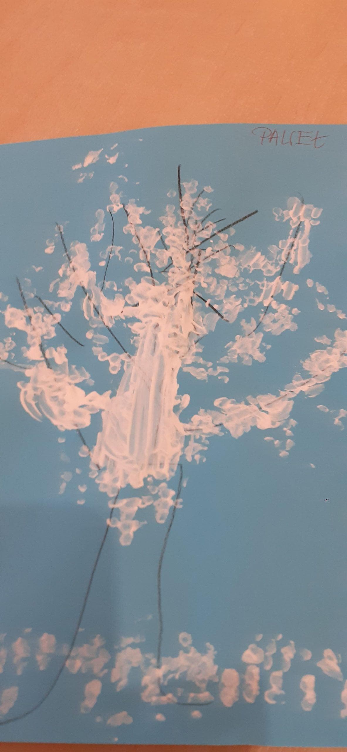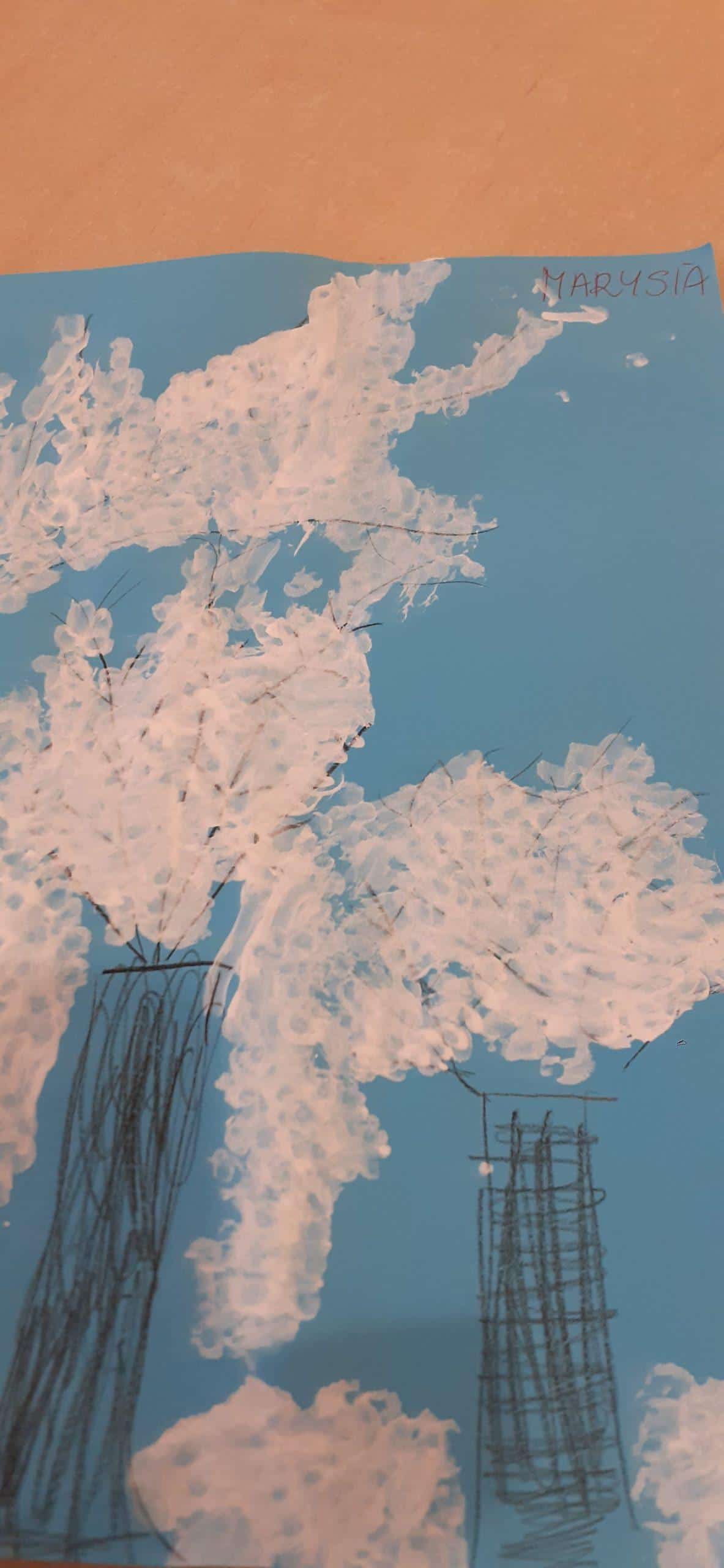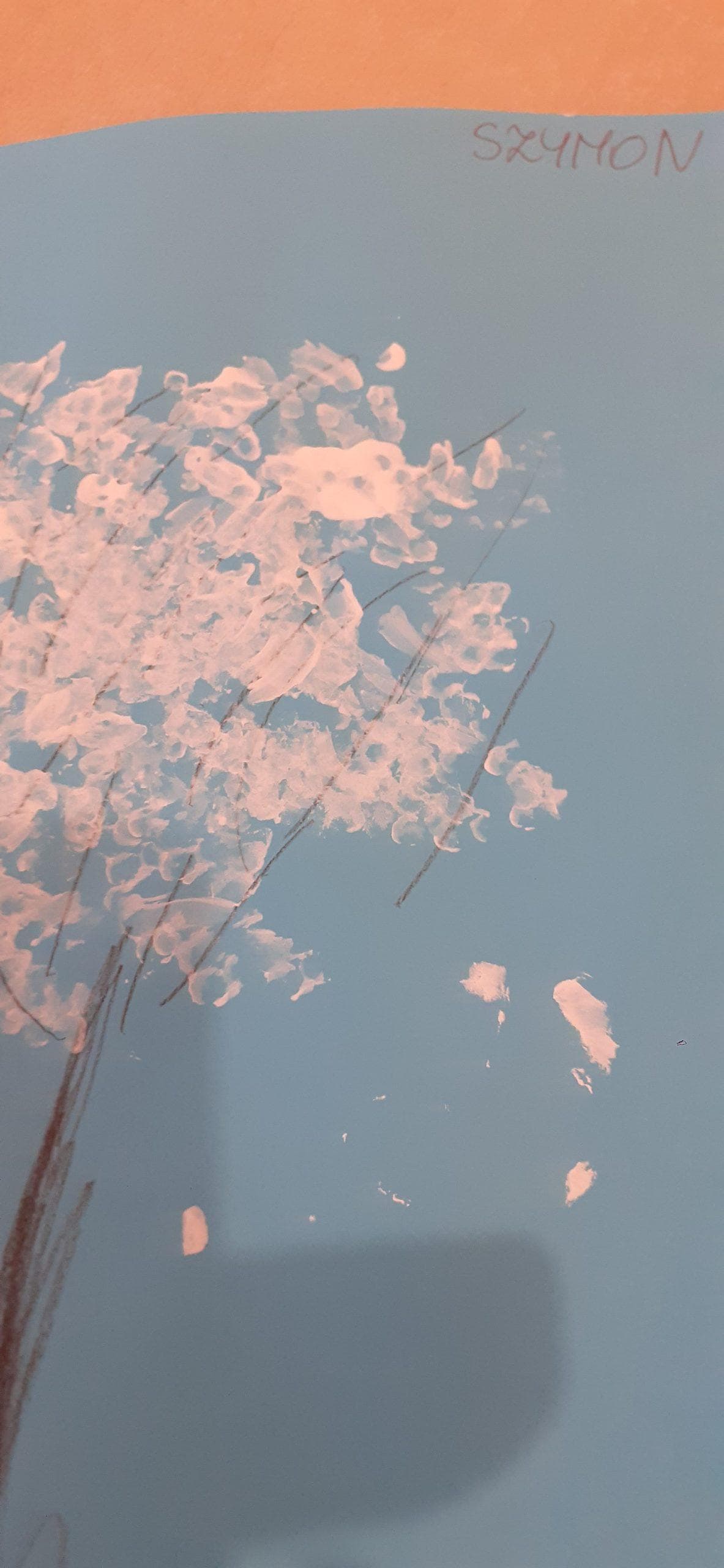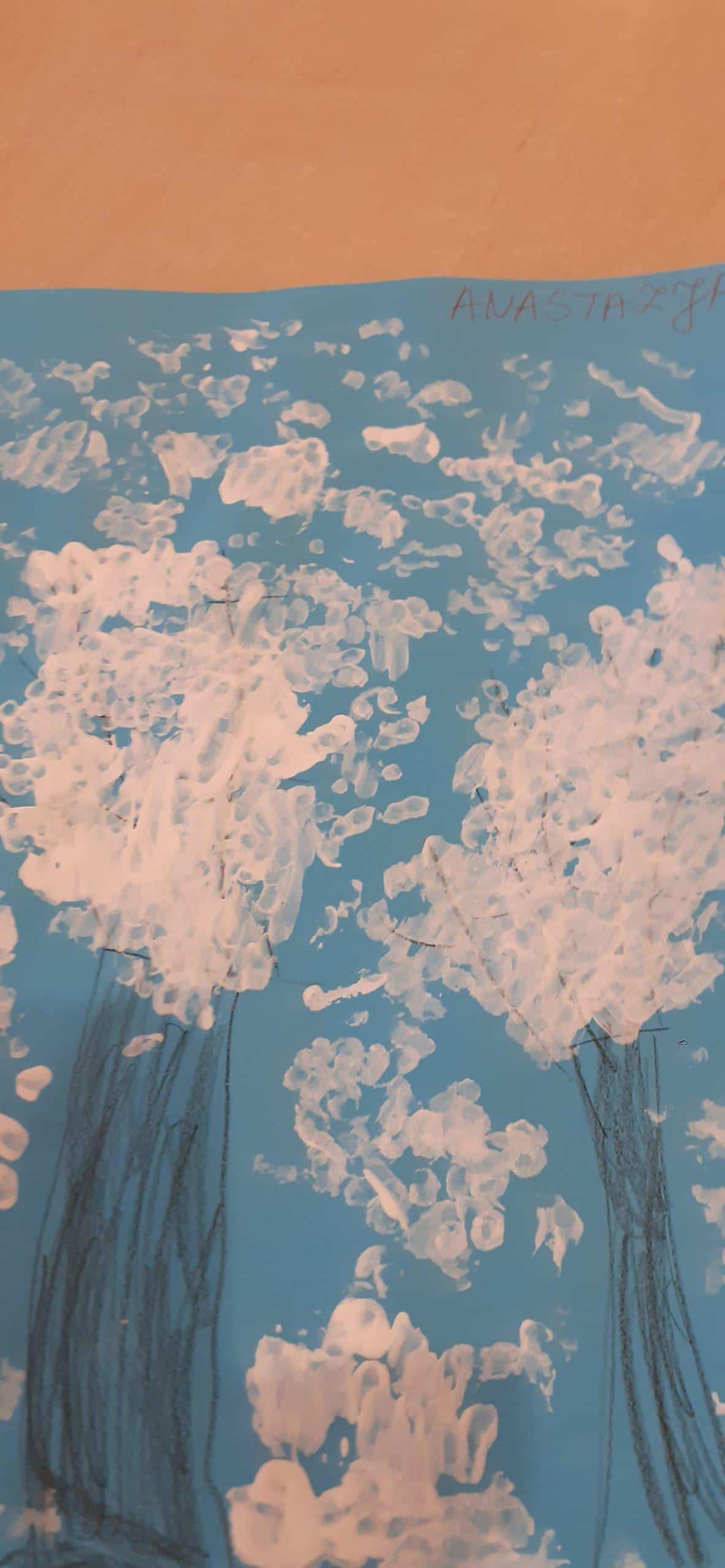 Zima jednak nie odpuszcza, za oknem jest pięknie. Do tej pory udało się nam dwa razy wyjść do ogrodu przedszkolnego . Jednym z elementów pobytu w ogrodzie przedszkolnym była obserwacja roślin i drzew w zimowym uśpieniu. Przy okazji utrwaliliśmy budowę drzewa, wymieniając jego poszczególne elementy budowy. To z kolei zainspirowało dzieci do wykonania pracy plastycznej pt. „Drzewo w zimowej odsłonie”. Dzieci z ochotą przystąpiły do malowania zimowego drzewa patyczkami kosmetycznymi maczanymi w białej farbie. To kolejna nowa technika plastyczna, zresztą bardzo lubiana przez dzieci. Powstały przepiękne zimowe drzewa. BRAWO!.